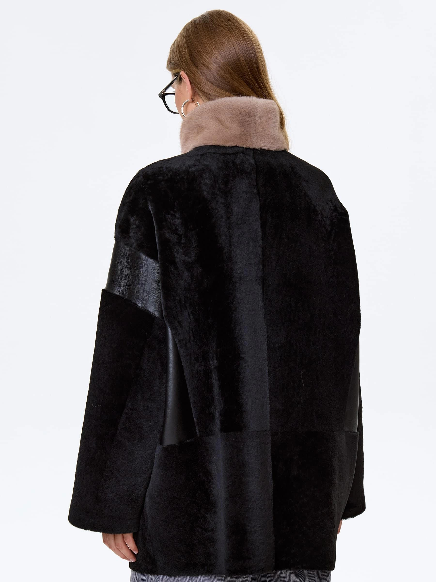 Товар дубленка на молнии с норковым воротником для женщин премиум класса 2057, черная, размер 52, артикул 62500 выполнен из овчина "мерино" с застежкой молния. Рассчитан на сезон: осень-зима. Длина изделия 77 см, силуэт свободный.