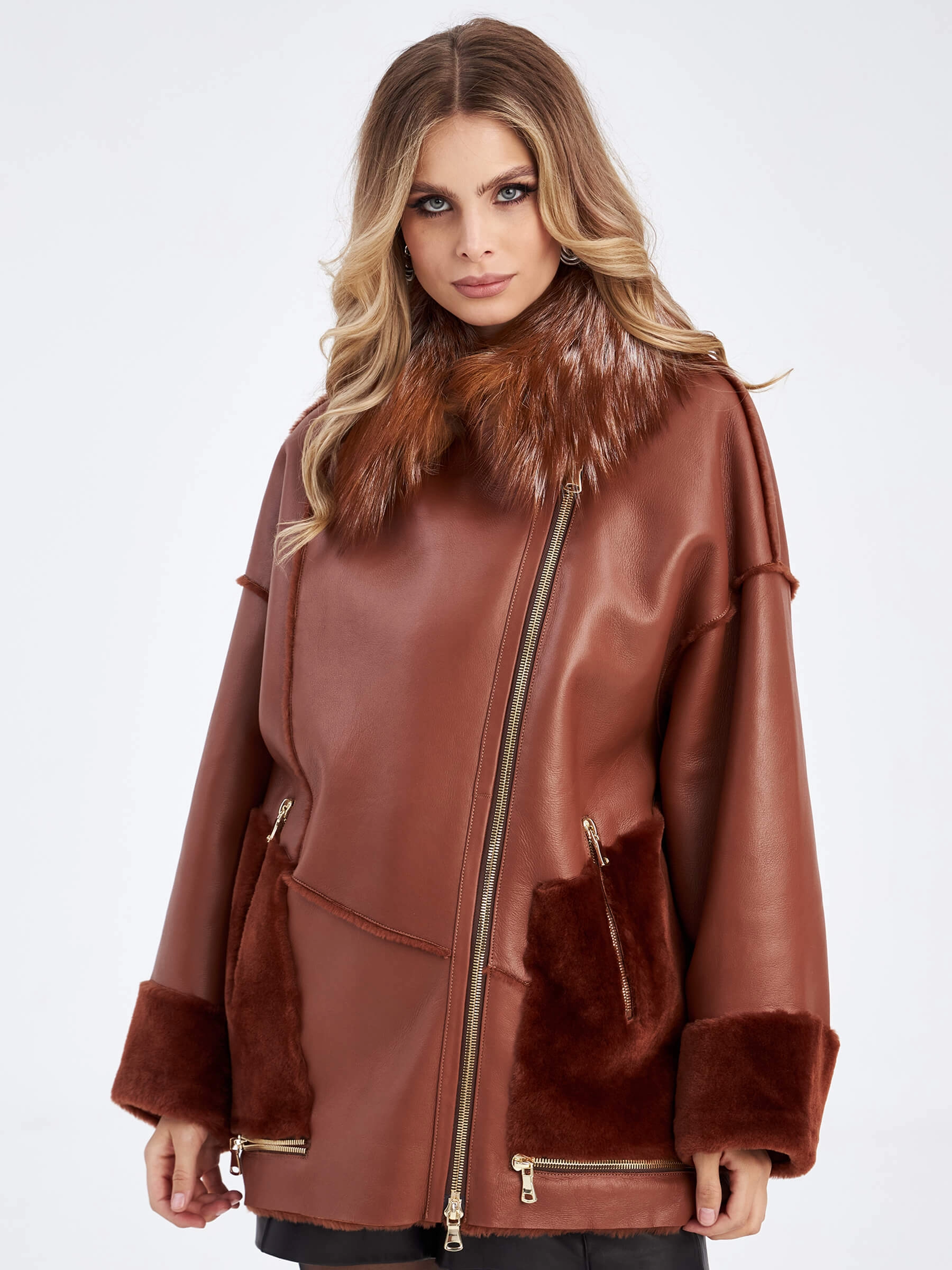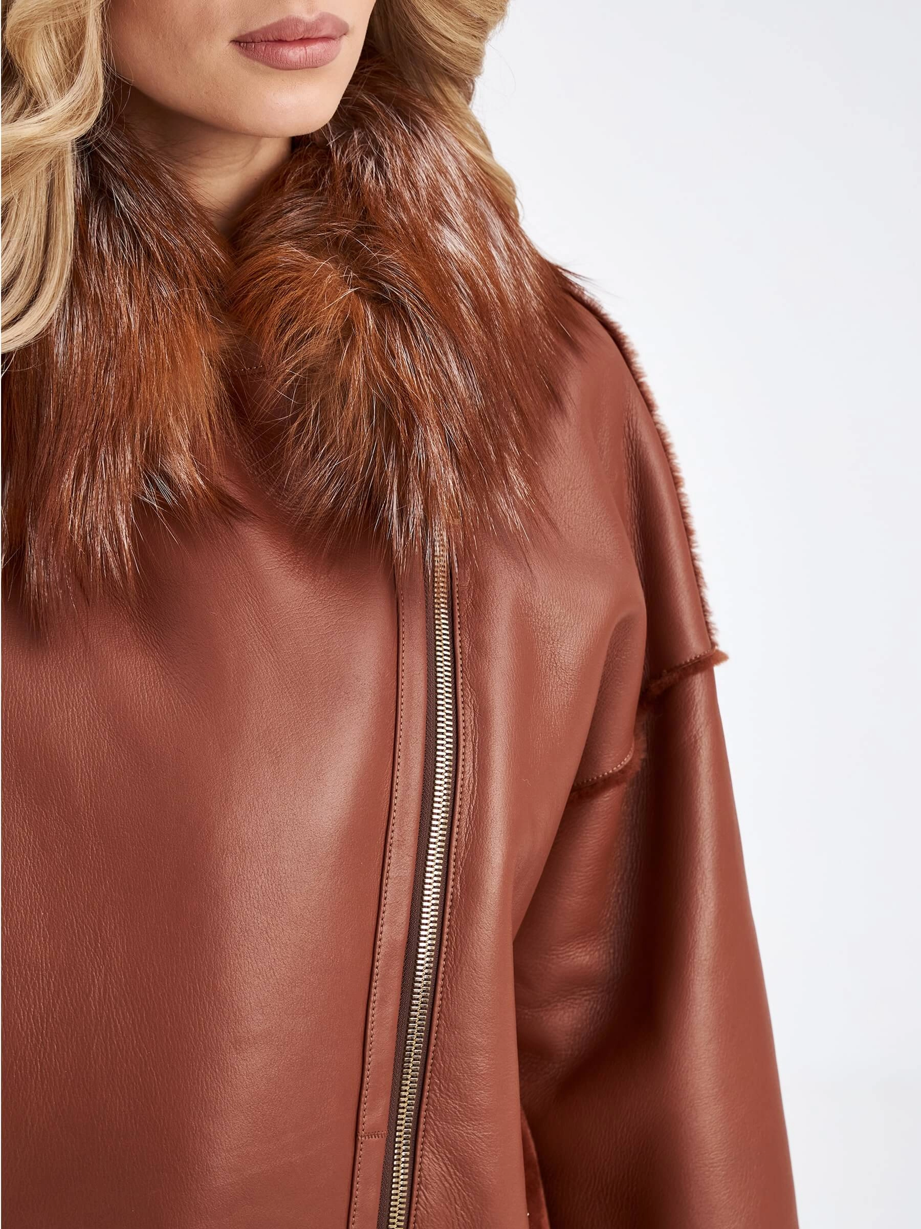 Короткая дубленка оверсайз с воротником лисицы премиум класса для женщин 2042, виски, размер 42, артикул 63190