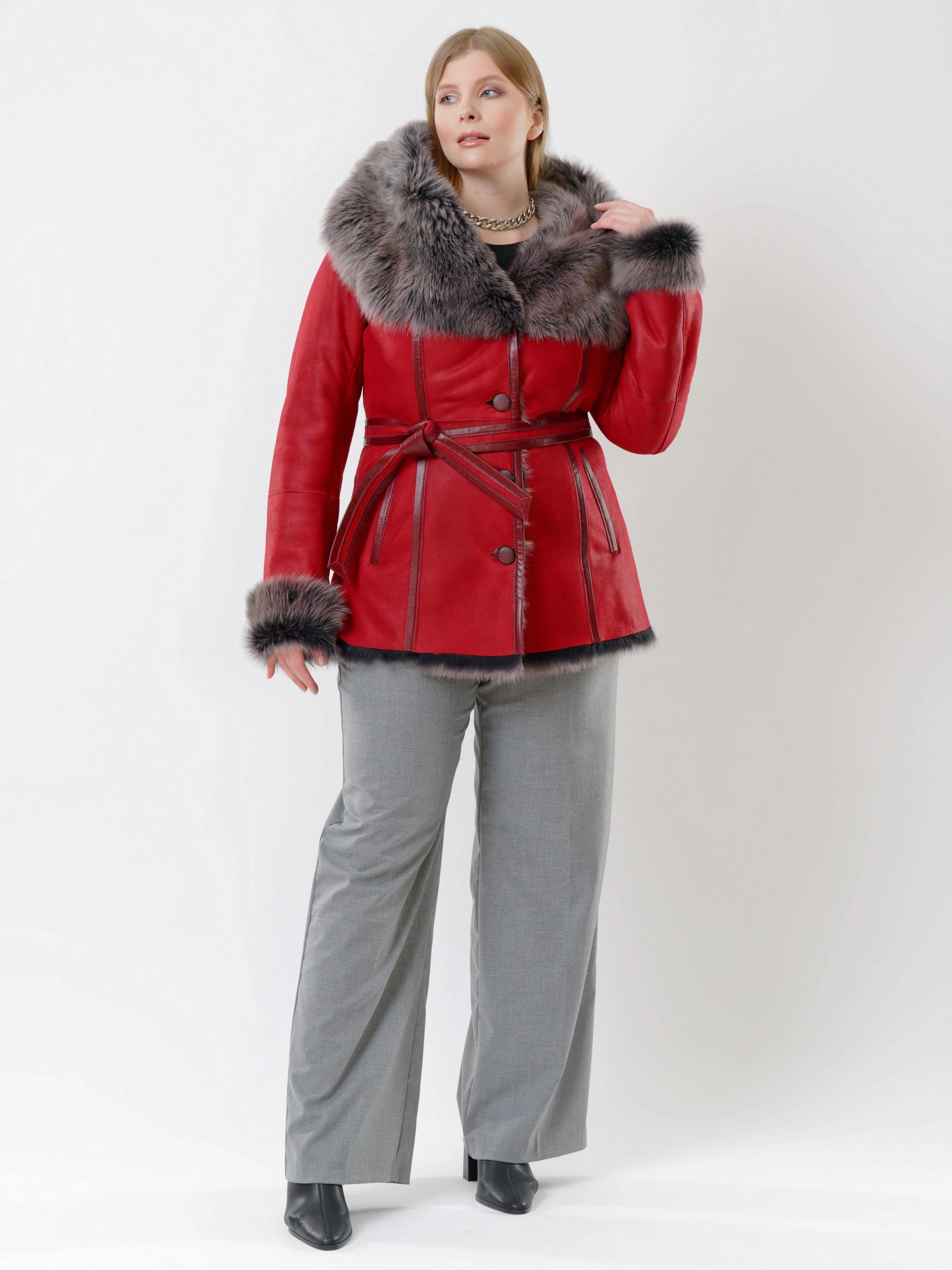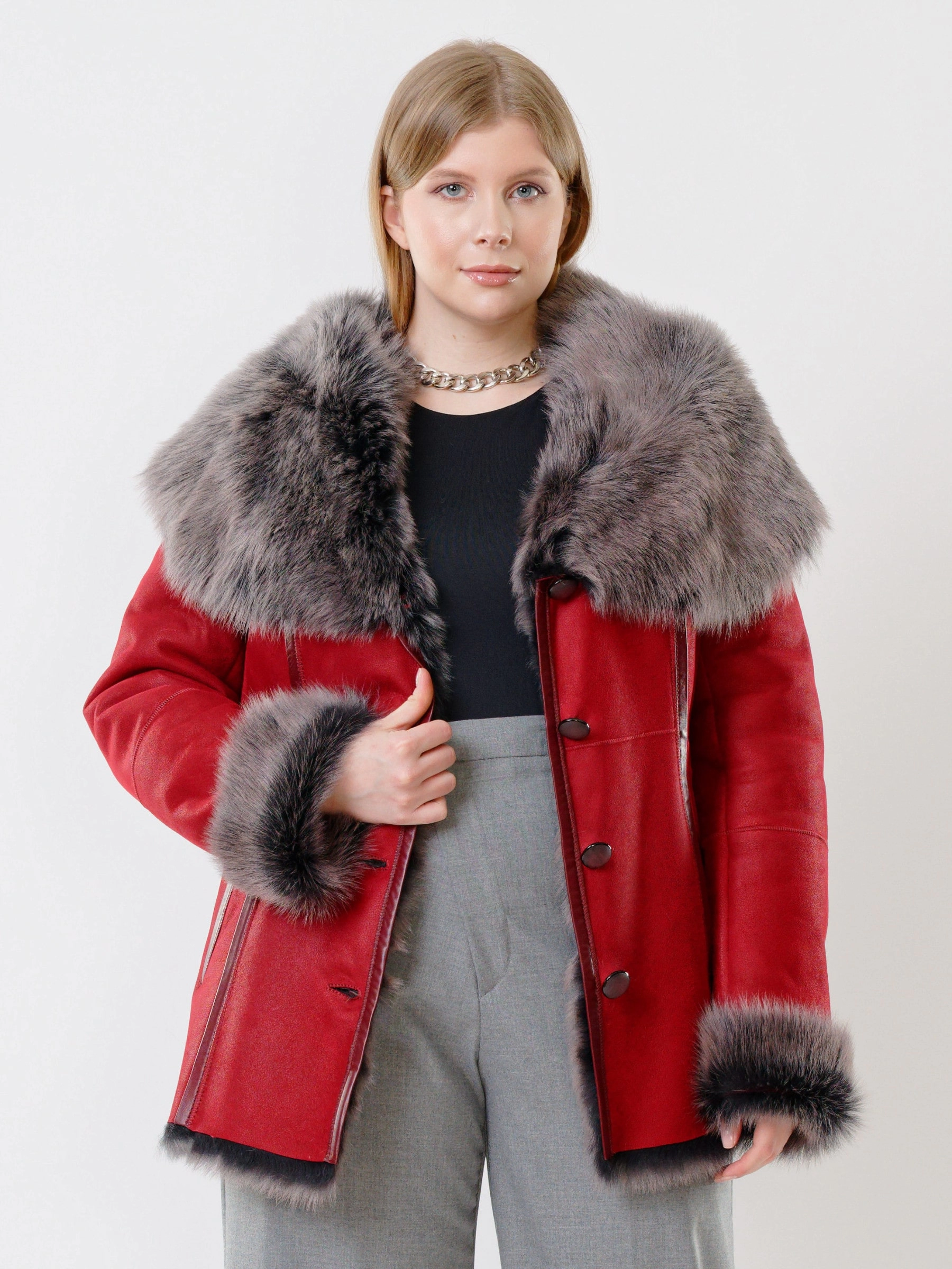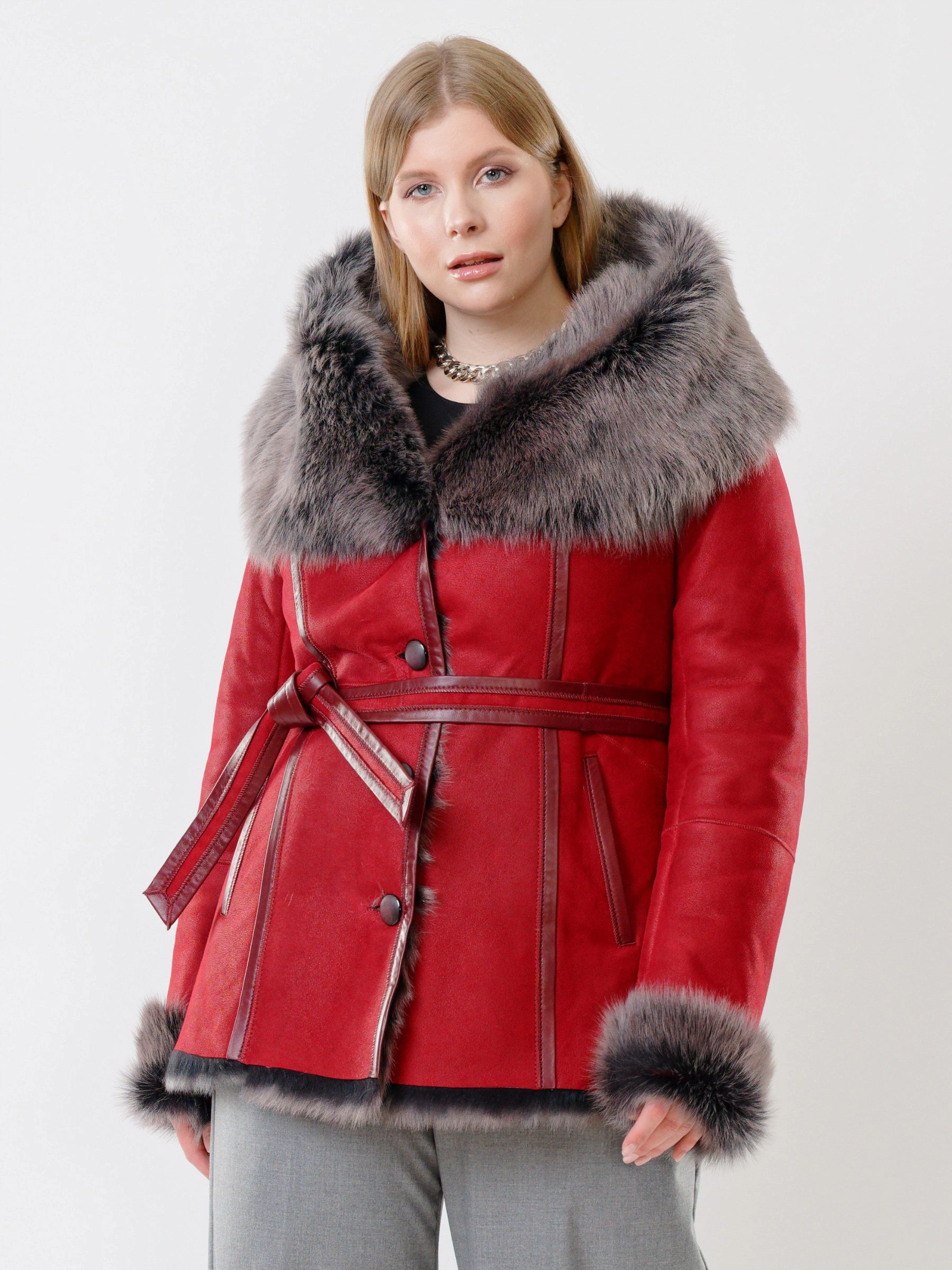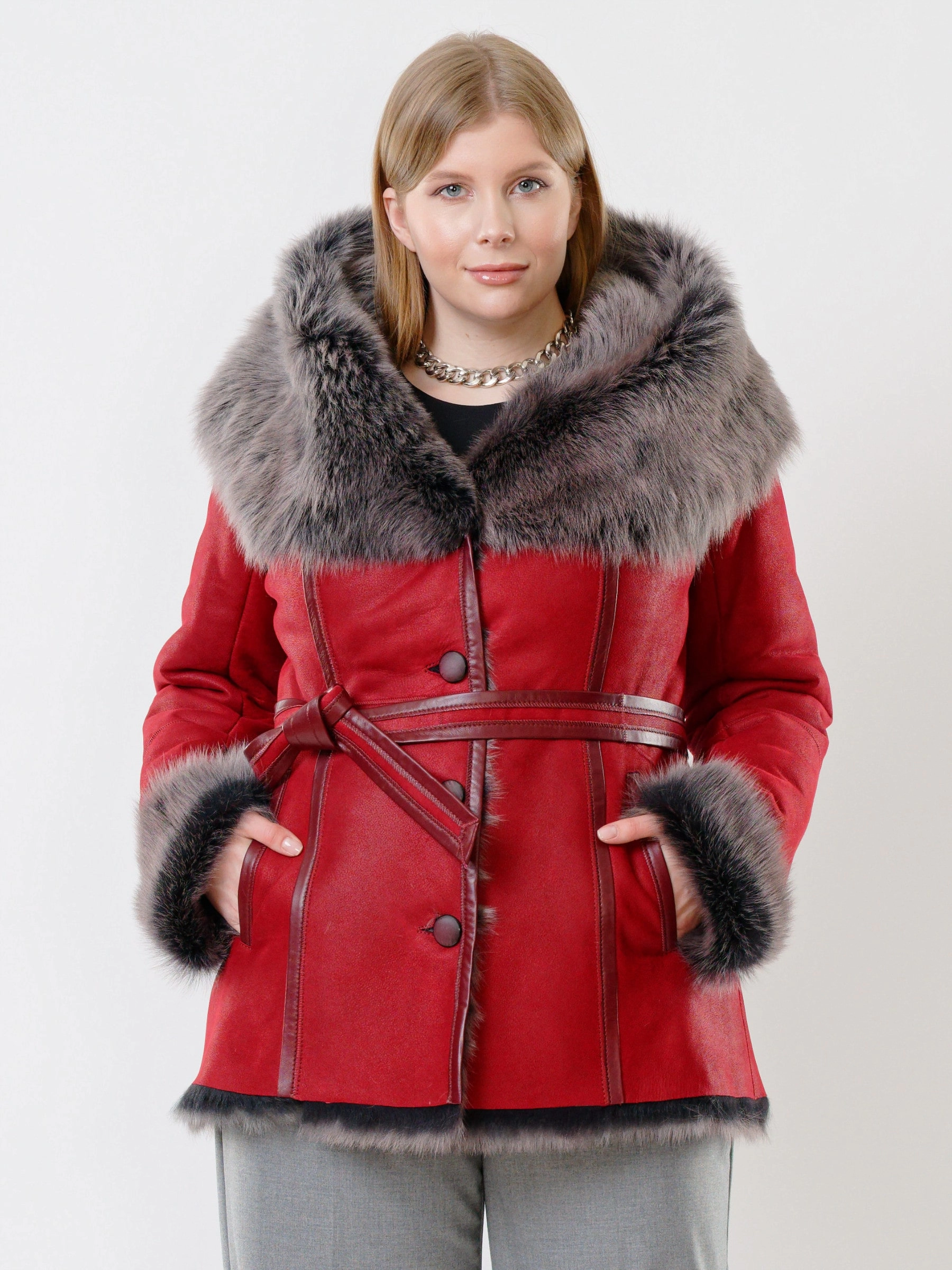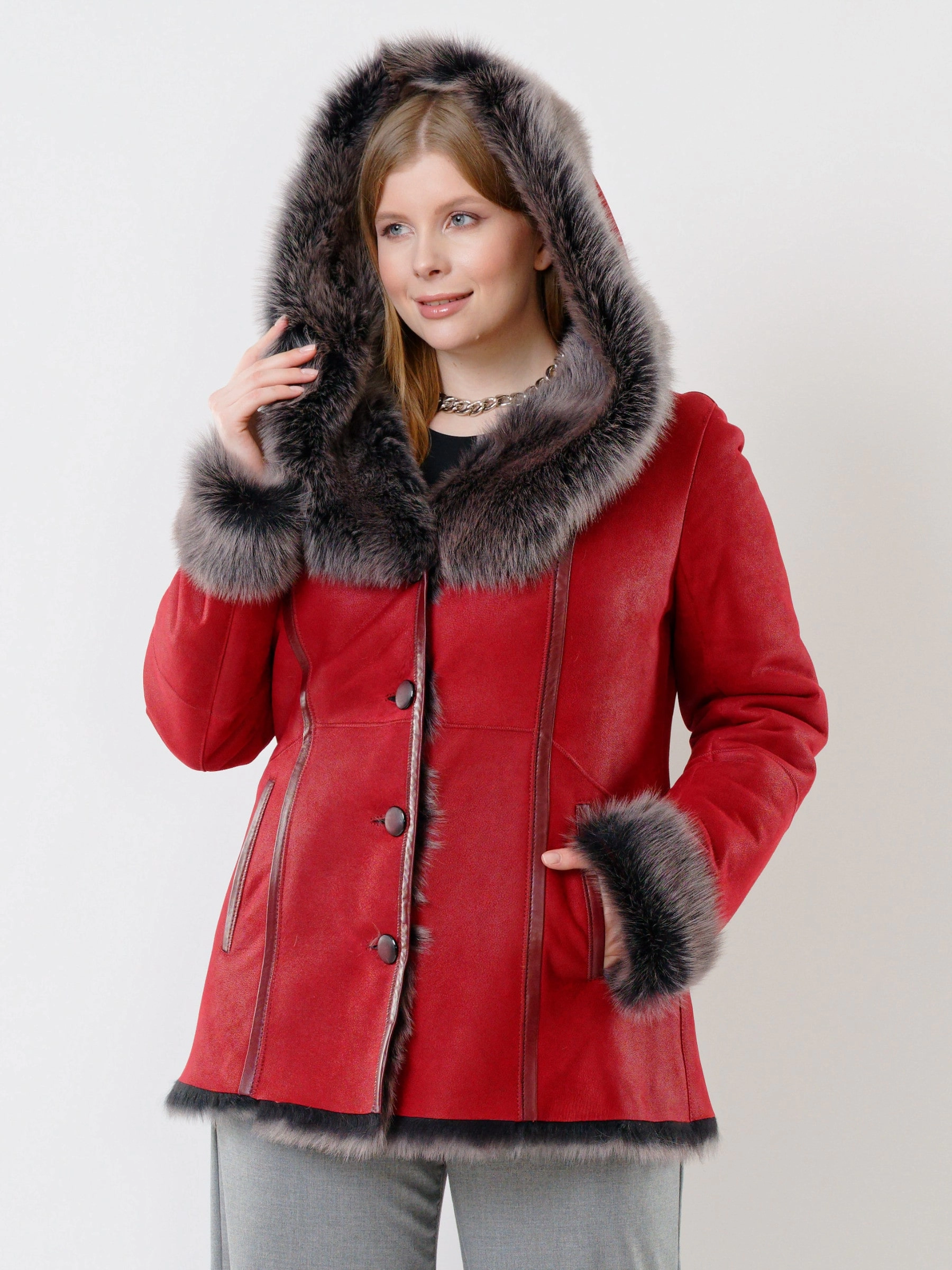 Короткая женская дубленка из тосканы с капюшоном 122, красная, размер 44, артикул 62050