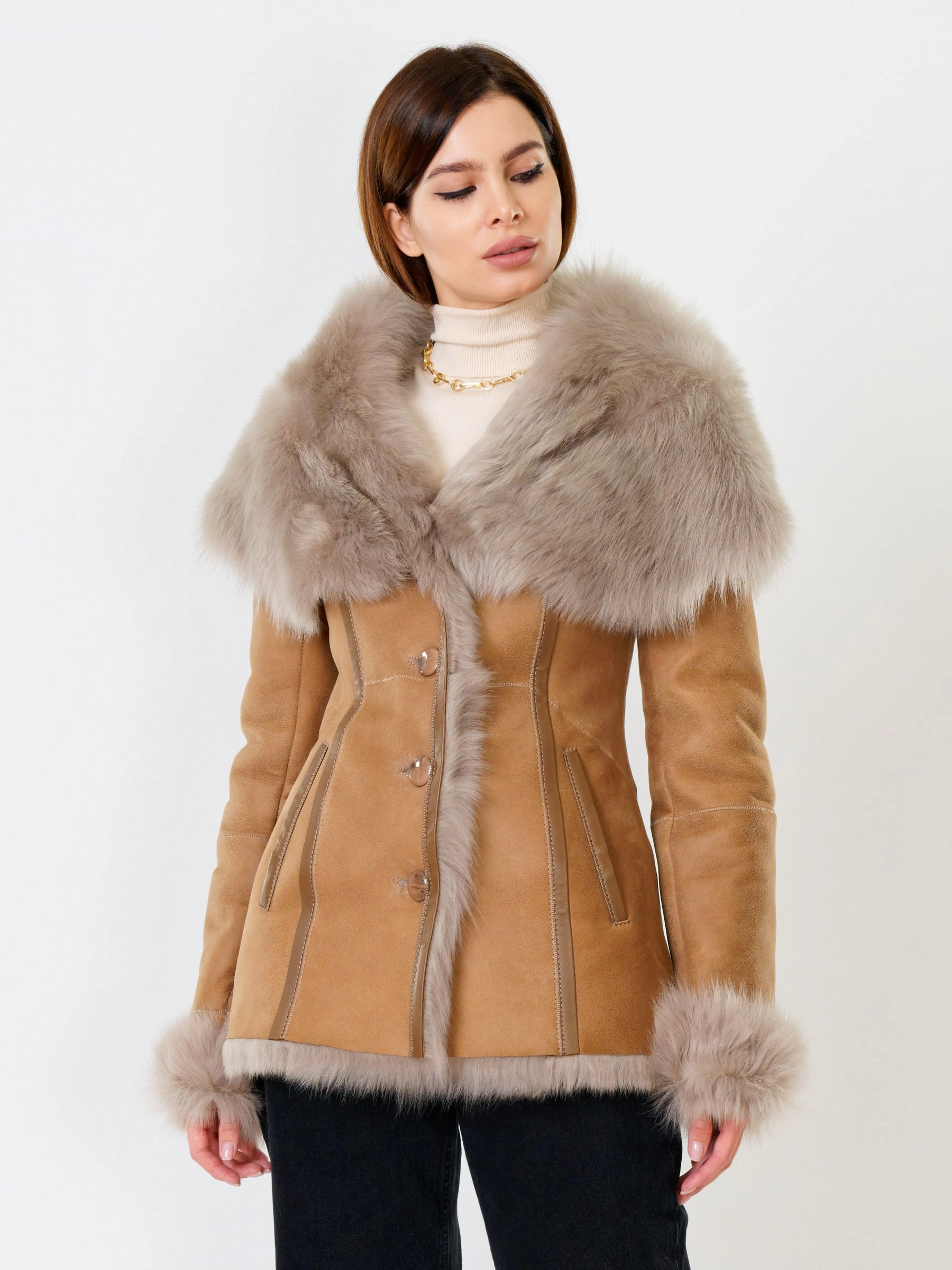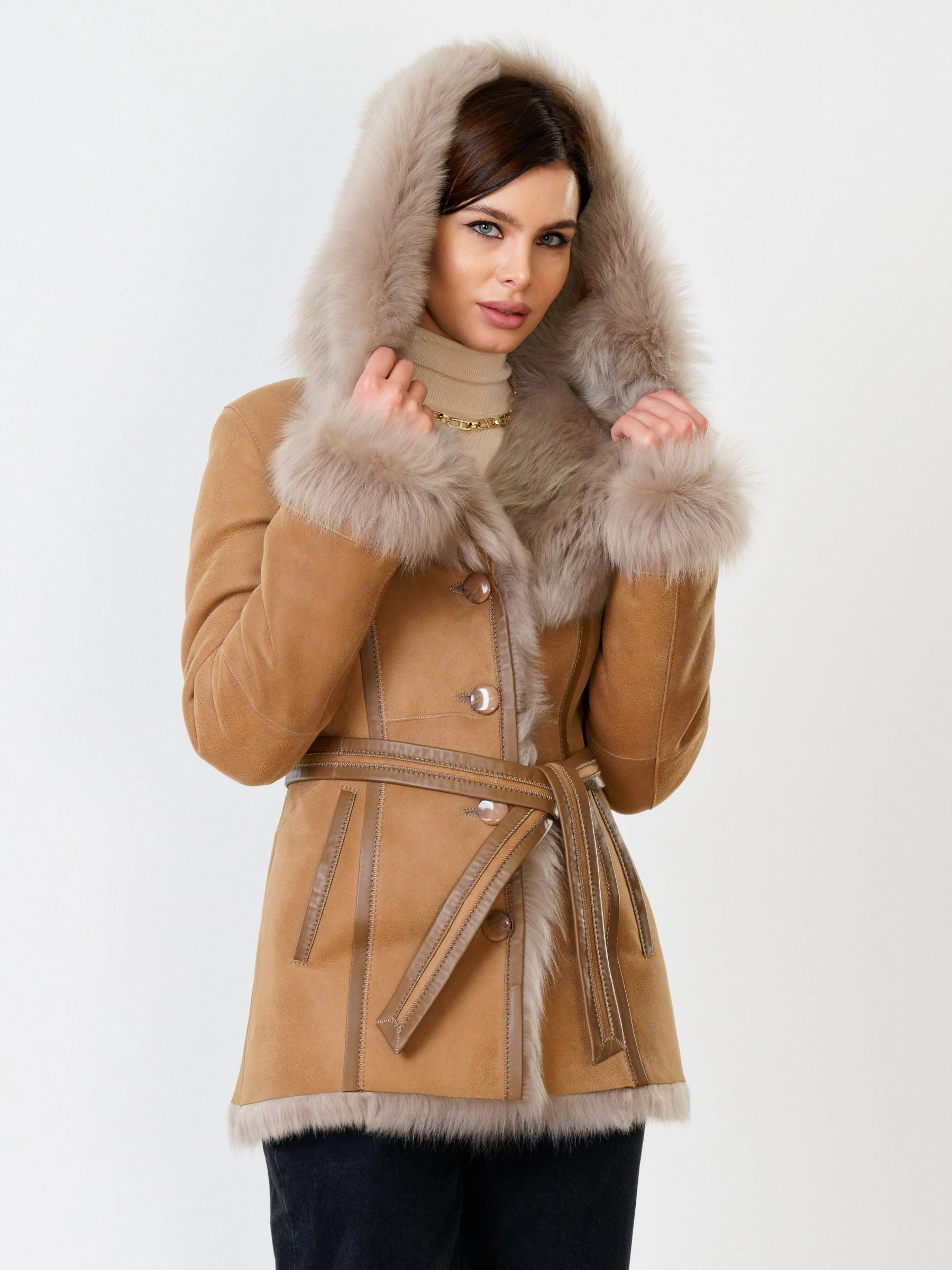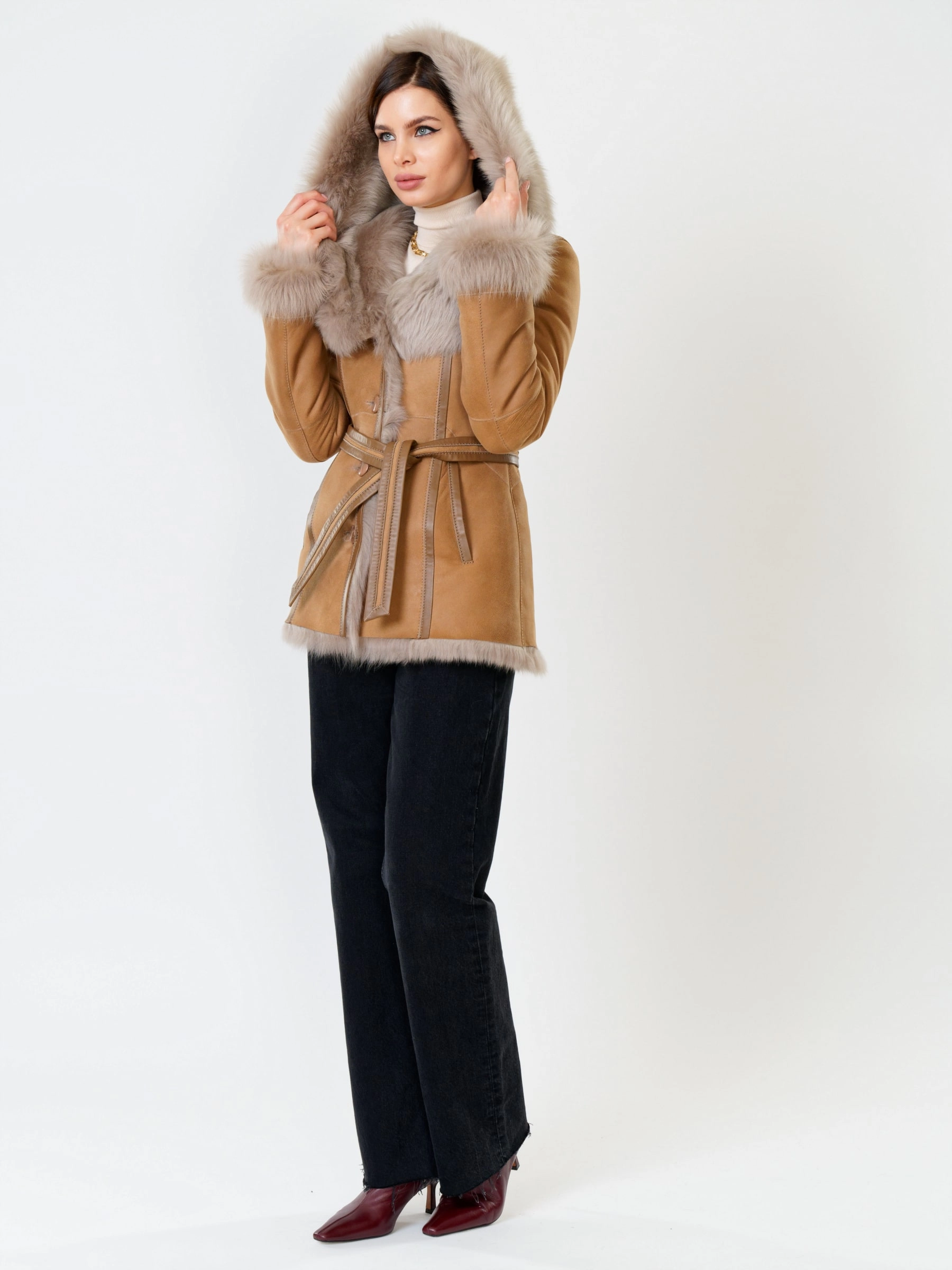 Полуприлегающая дубленка премиум-класса из густого меха тосканской овчины согреет в лютый мороз, а глубокий капюшон-трансформер можно носить как шаль на плечах, создавая элегантный образ; удачная длина 70 см идеальна для города: не сковывает движения за рулем, не собирает грязь, но полностью закрывает поясницу и бедра от ветра, при этом защитное покрытие бережет от царапин, а кожаная отделка карманов и борта добавляет статусности, регулируемые манжеты и боковые карманы обеспечивают комфорт, а продуманные швы и длинный пояс подчеркивают силуэт — это мобильность для города и элегантность для вечера. Совет стилиста: носите дубленку незастегнутой, фиксируя поясом, чтобы показать красоту меха, сочетая с грубой обувью и узкими джинсами для повседневного шика или накиньте капюшон на плечи поверх платья-миди для вечернего выхода.