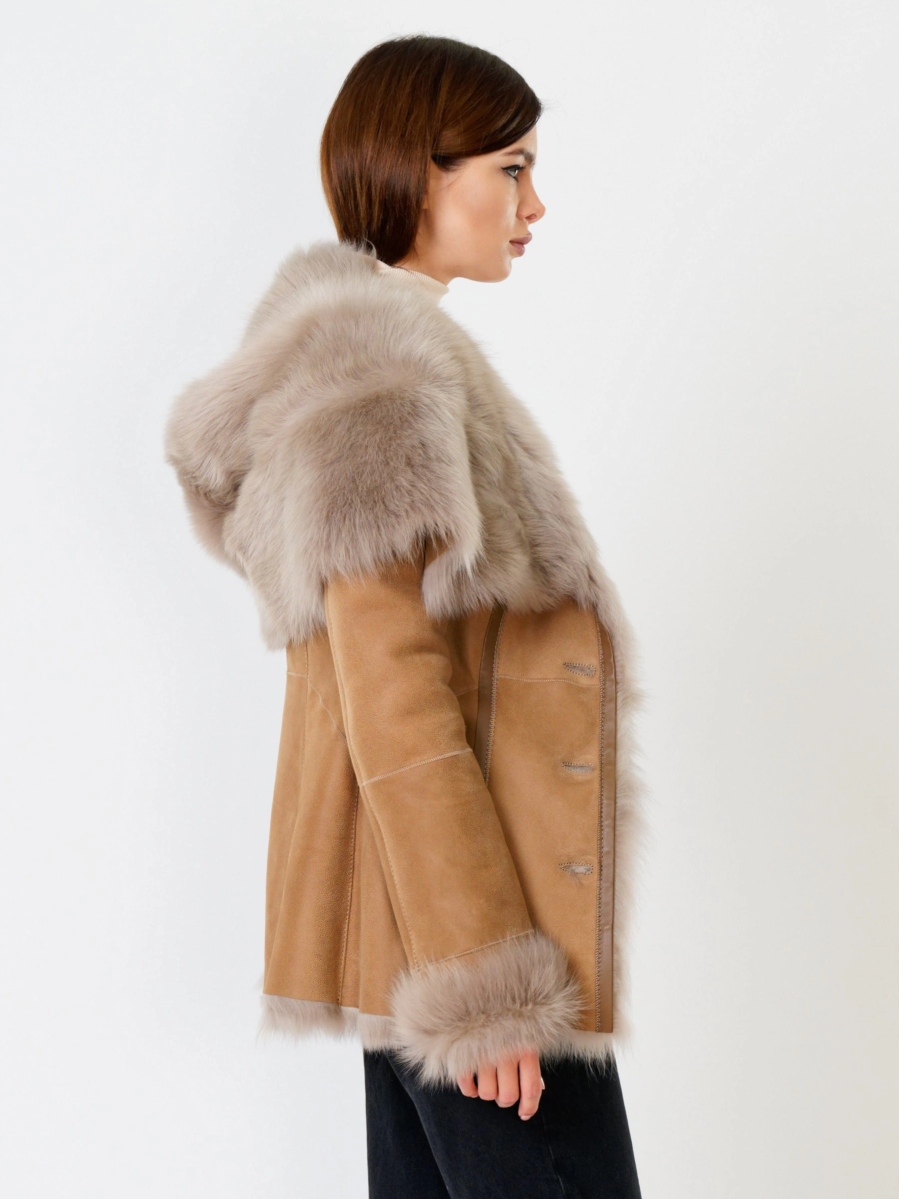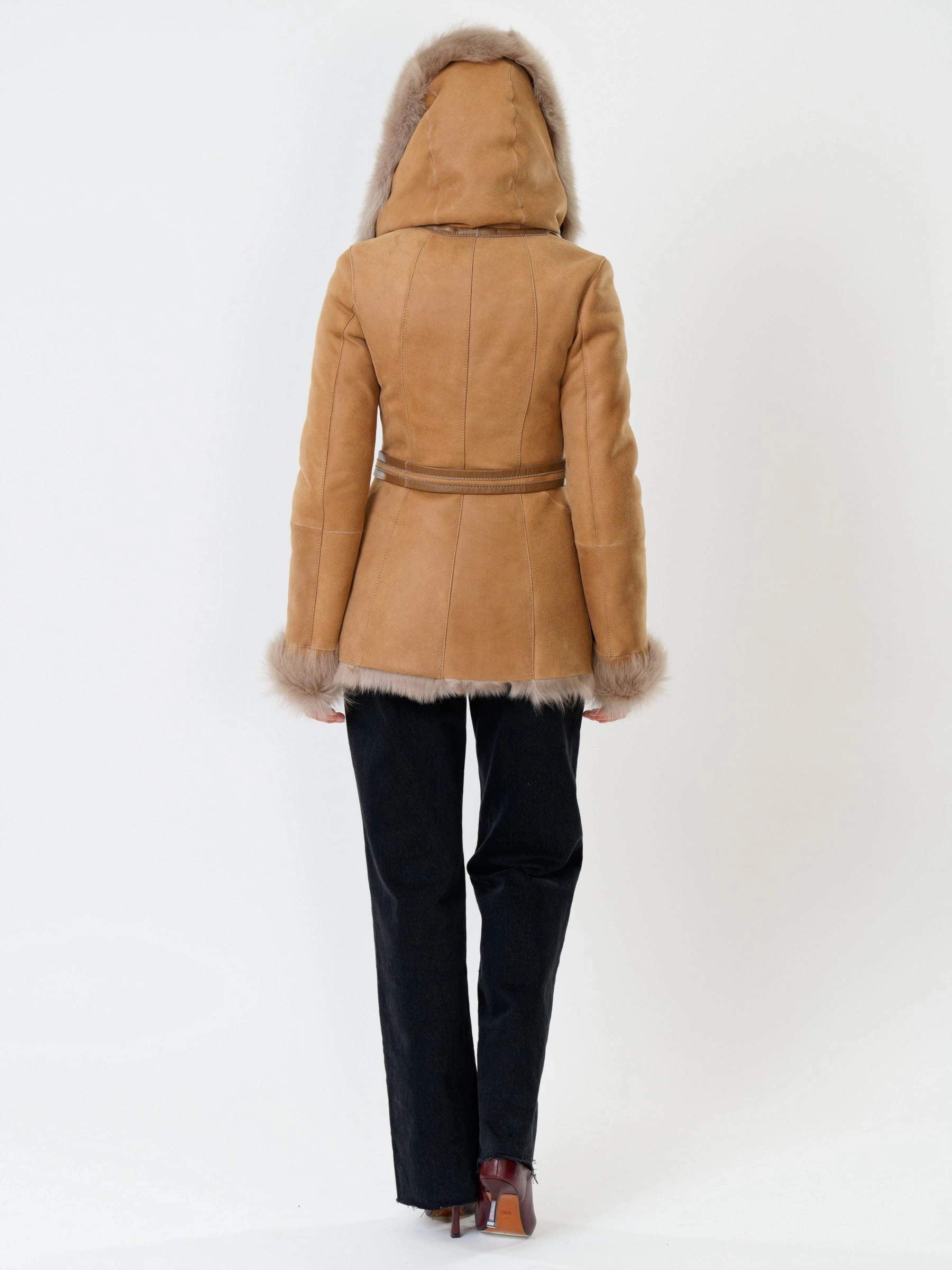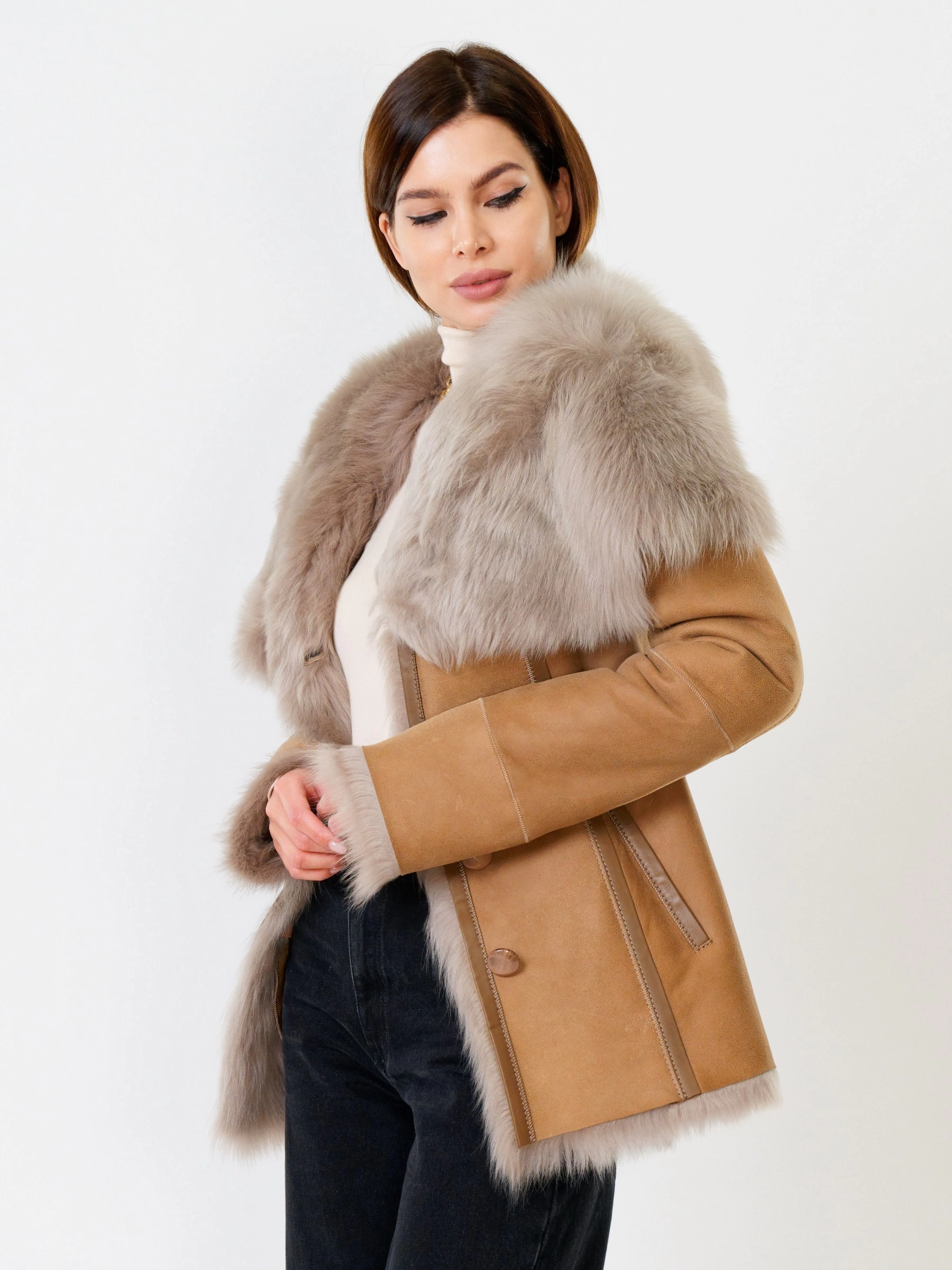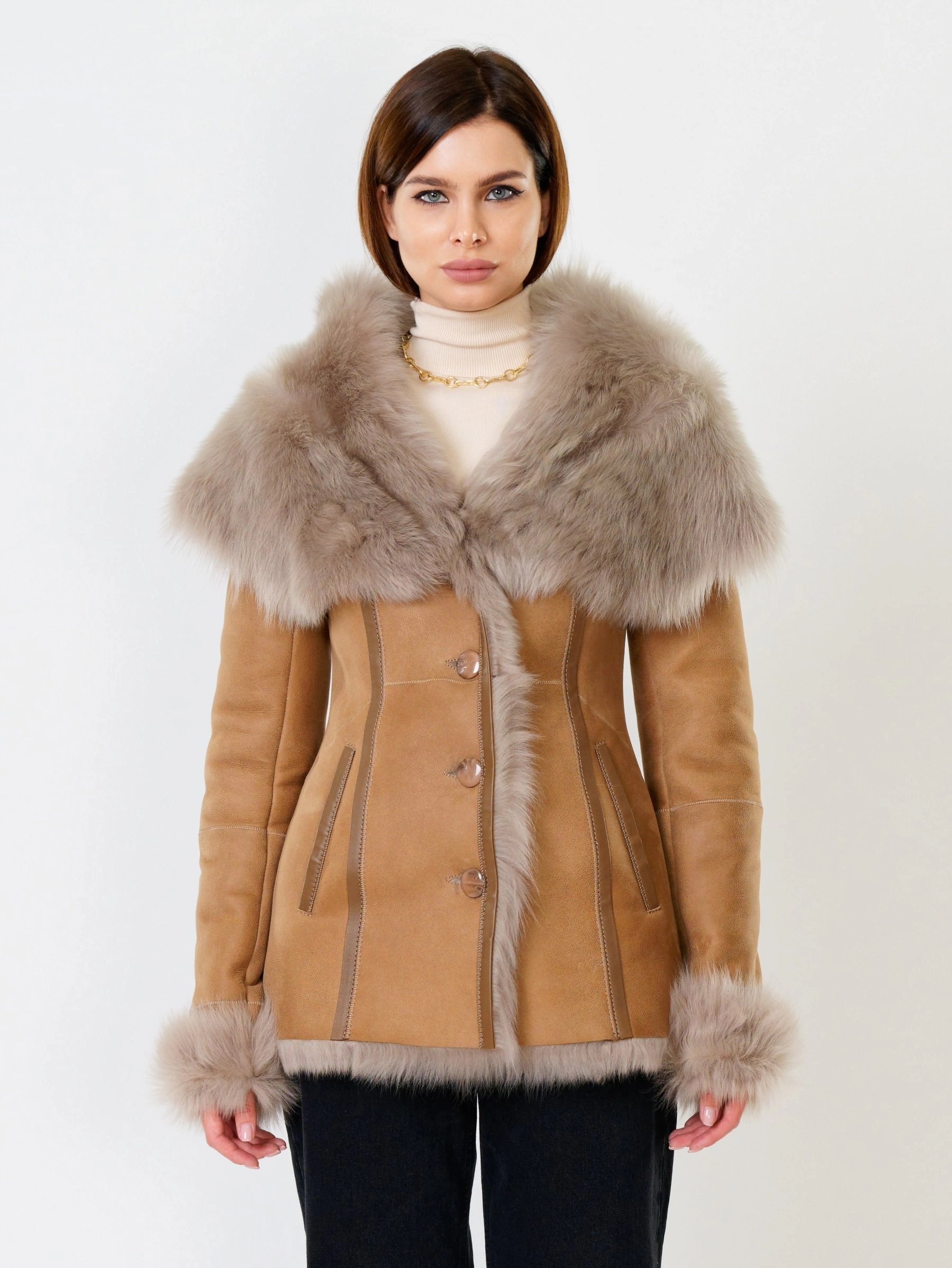 Полуприлегающая дубленка премиум-класса из густого меха тосканской овчины согреет в лютый мороз, а глубокий капюшон-трансформер можно носить как шаль на плечах, создавая элегантный образ; удачная длина 70 см идеальна для города: не сковывает движения за рулем, не собирает грязь, но полностью закрывает поясницу и бедра от ветра, при этом защитное покрытие бережет от царапин, а кожаная отделка карманов и борта добавляет статусности, регулируемые манжеты и боковые карманы обеспечивают комфорт, а продуманные швы и длинный пояс подчеркивают силуэт — это мобильность для города и элегантность для вечера. Совет стилиста: носите дубленку незастегнутой, фиксируя поясом, чтобы показать красоту меха, сочетая с грубой обувью и узкими джинсами для повседневного шика или накиньте капюшон на плечи поверх платья-миди для вечернего выхода.