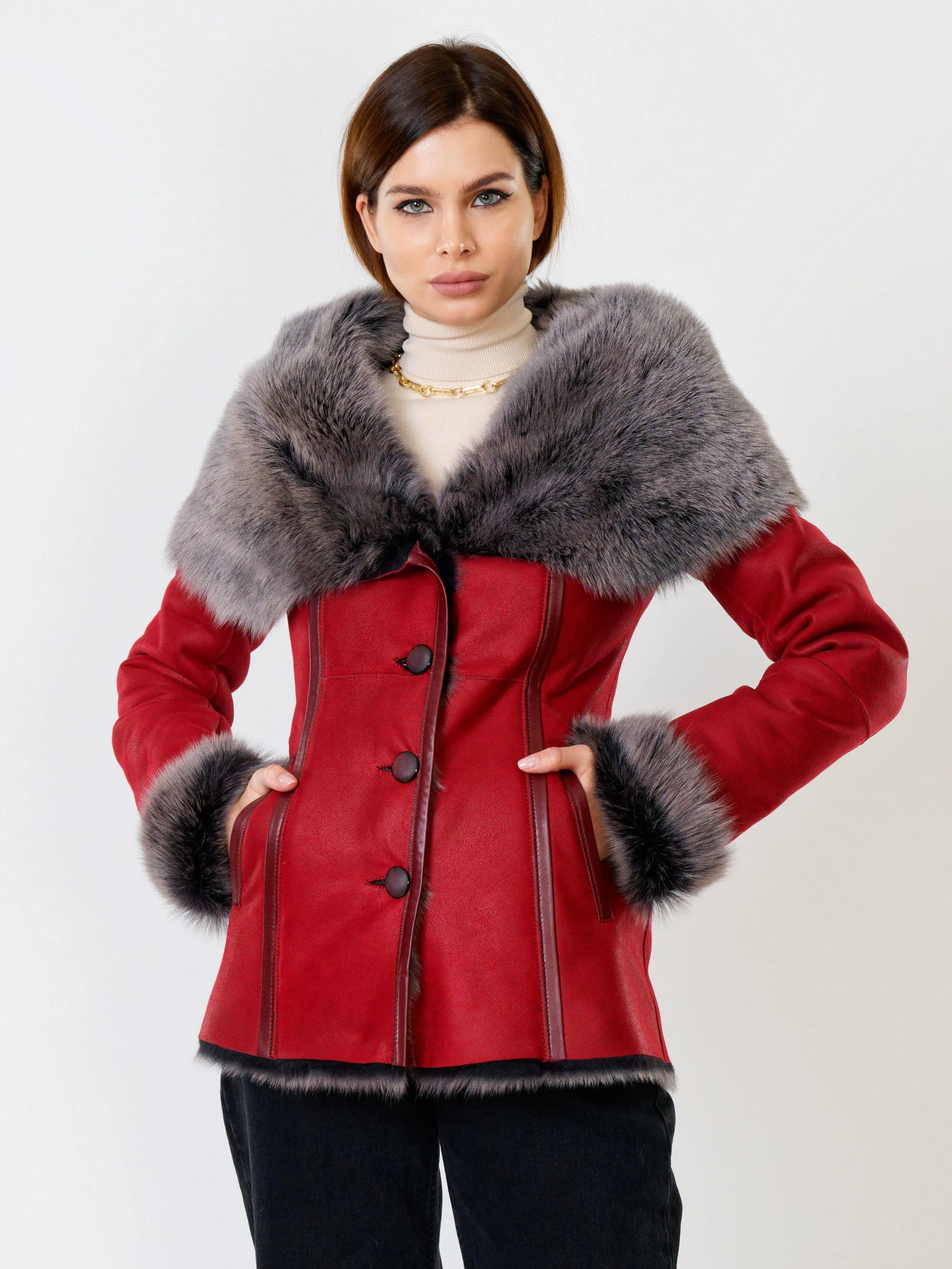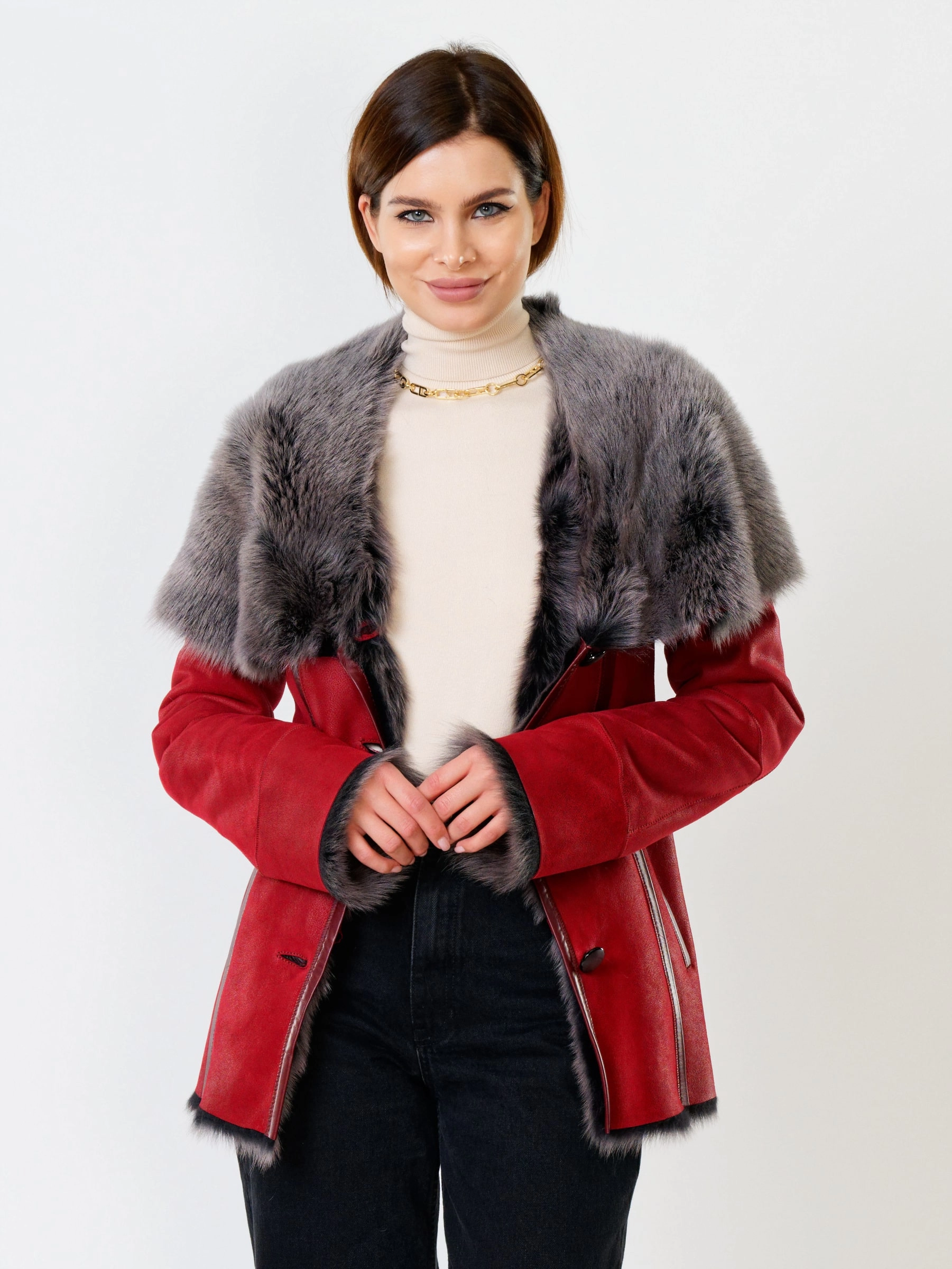 Короткая женская дубленка из тосканы с капюшоном 122, красная, размер 44, артикул 61862