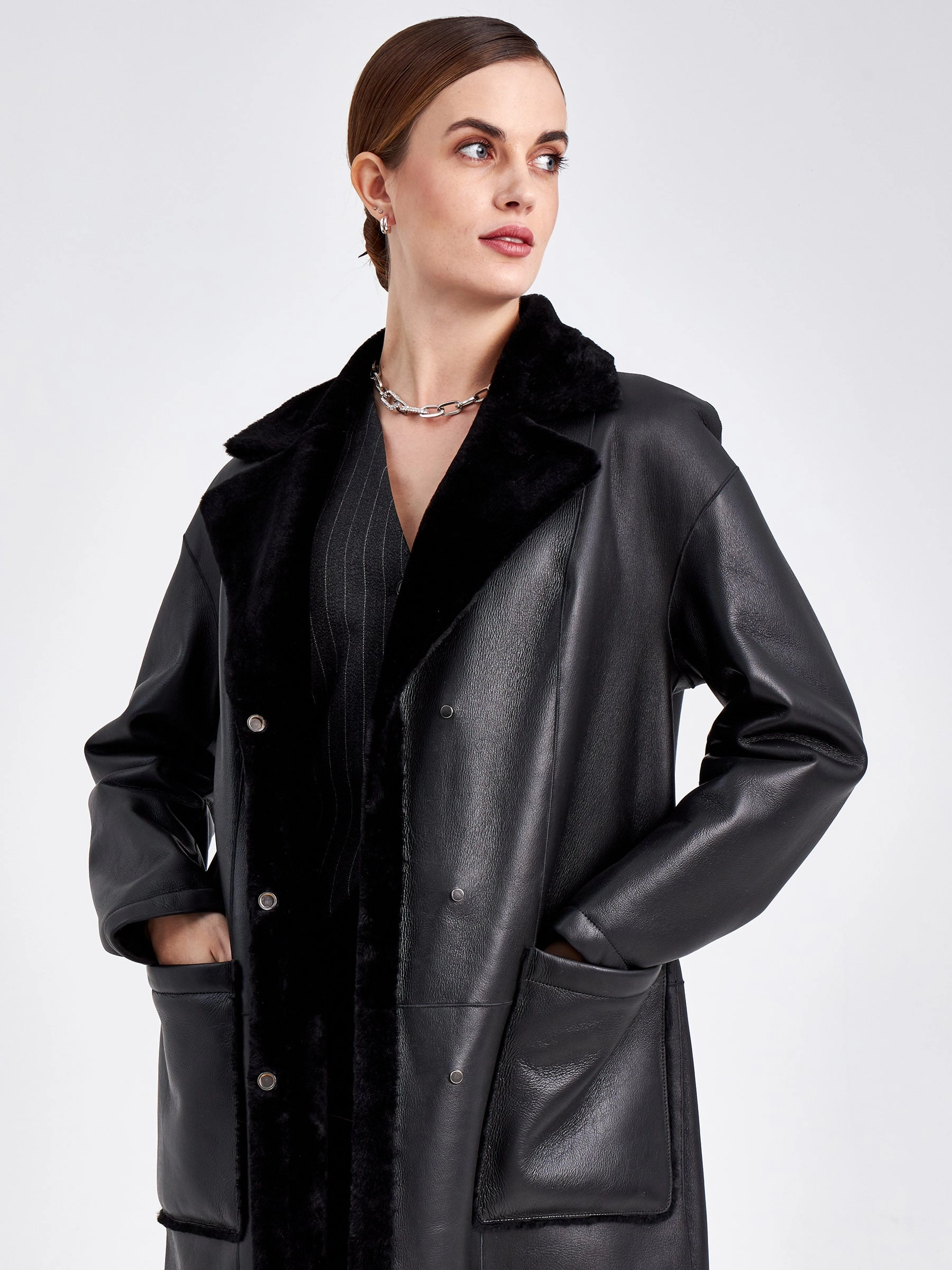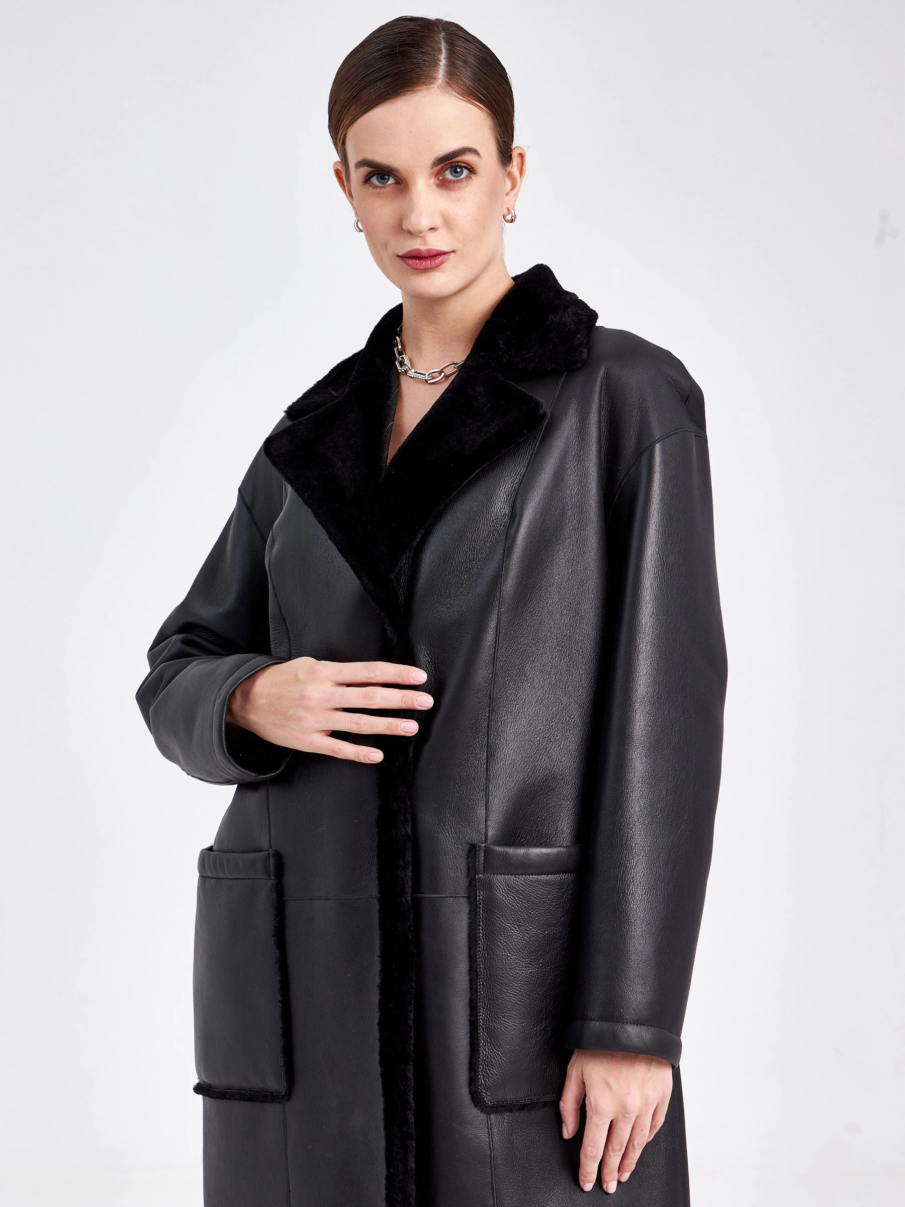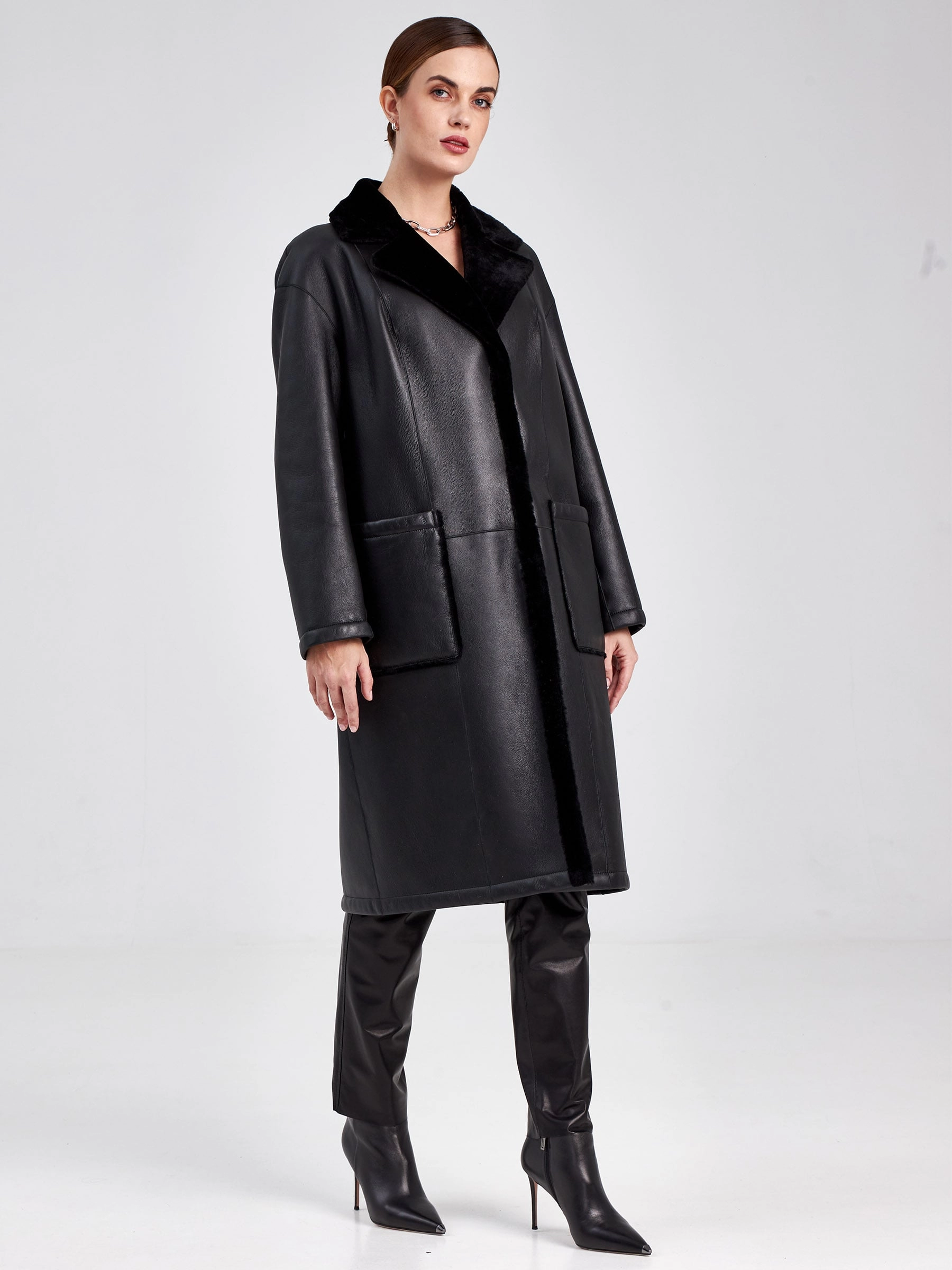 Длинная женская дубленка оверсайз премиум класса 2002, черная, размер 50, артикул 62452