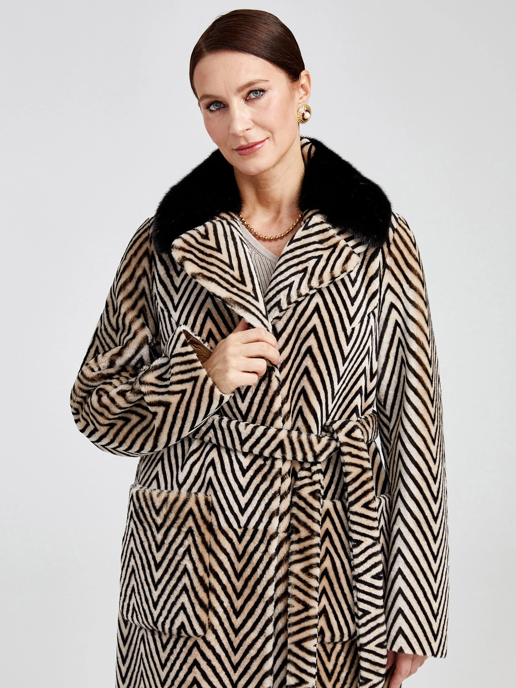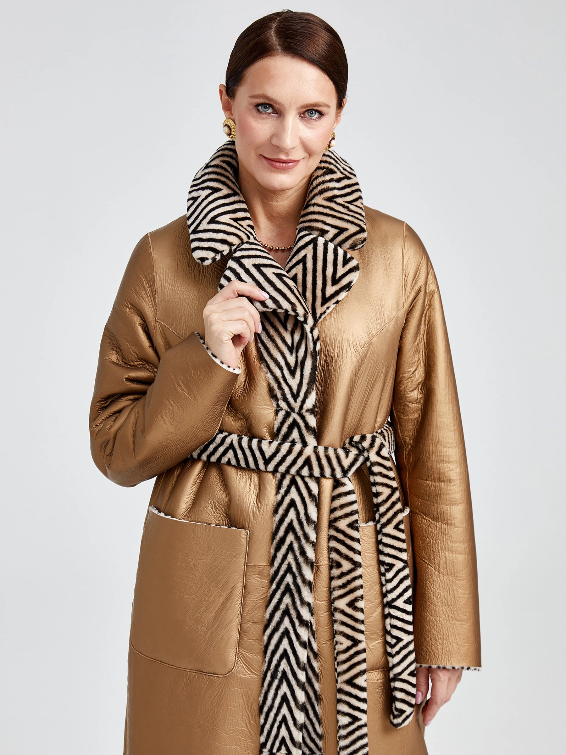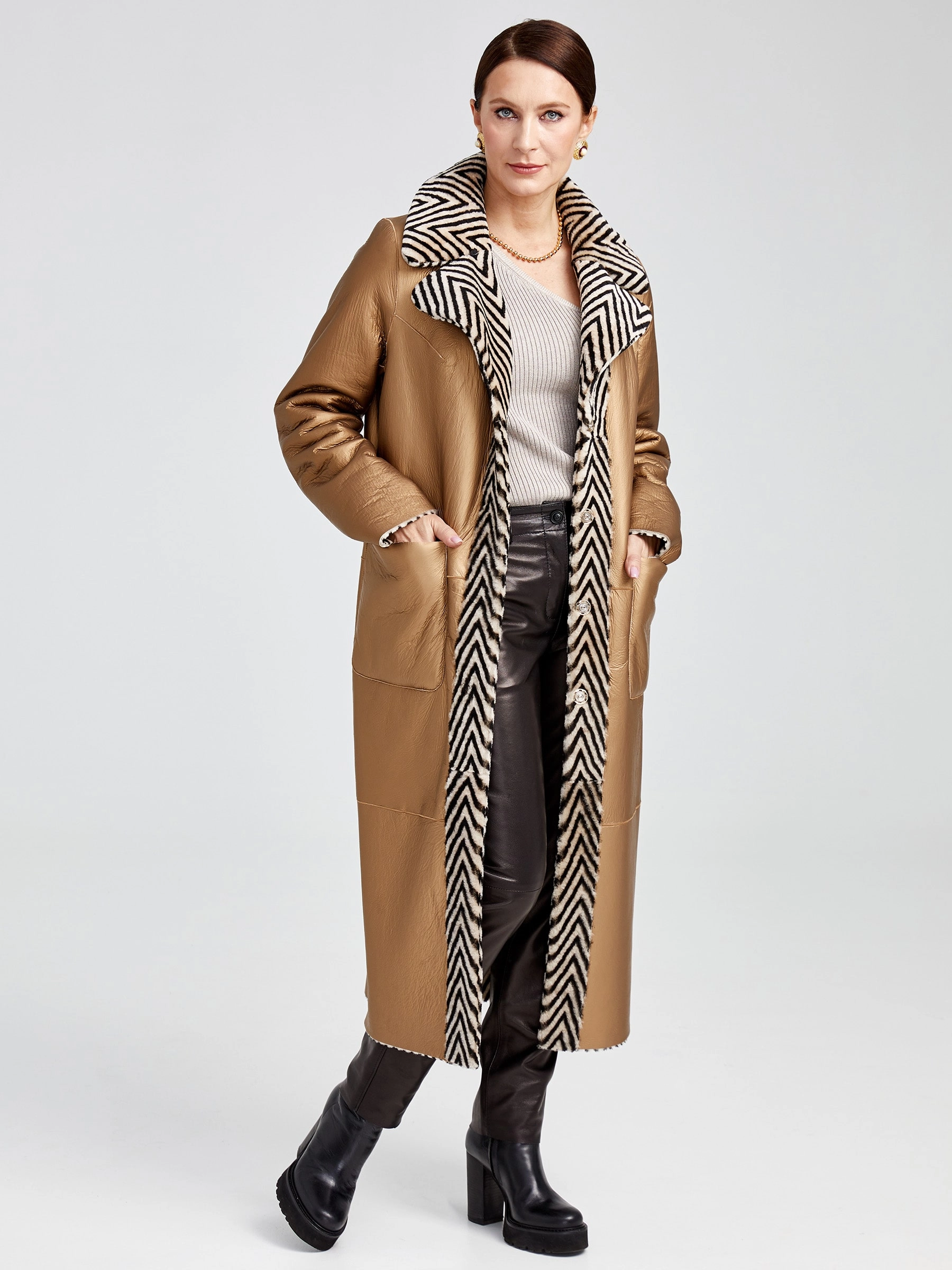 Роскошная двусторонняя дублёнка премиум-класса длиной 119 см: принтованный мех астрагана, то есть ягнёнка, с одной стороны и благородное бронзовое металлизированное покрытие — с другой. Свободный силуэт со съёмным английским воротником из густого чёрного меха норки и удобной застёжкой на кнопках создаёт образ исключительной элегантности. Два накладных кармана и длинный пояс подчёркивают дизайн. Совет стилиста: носите со стороной из астрагана и меховым воротником с платьем-миди и сапогами для вечера или со стороной-металлик без воротника с водолазкой, кожаными брюками и ботинками для дерзкого повседневного лука — максимальная универсальность в одной вещи.
