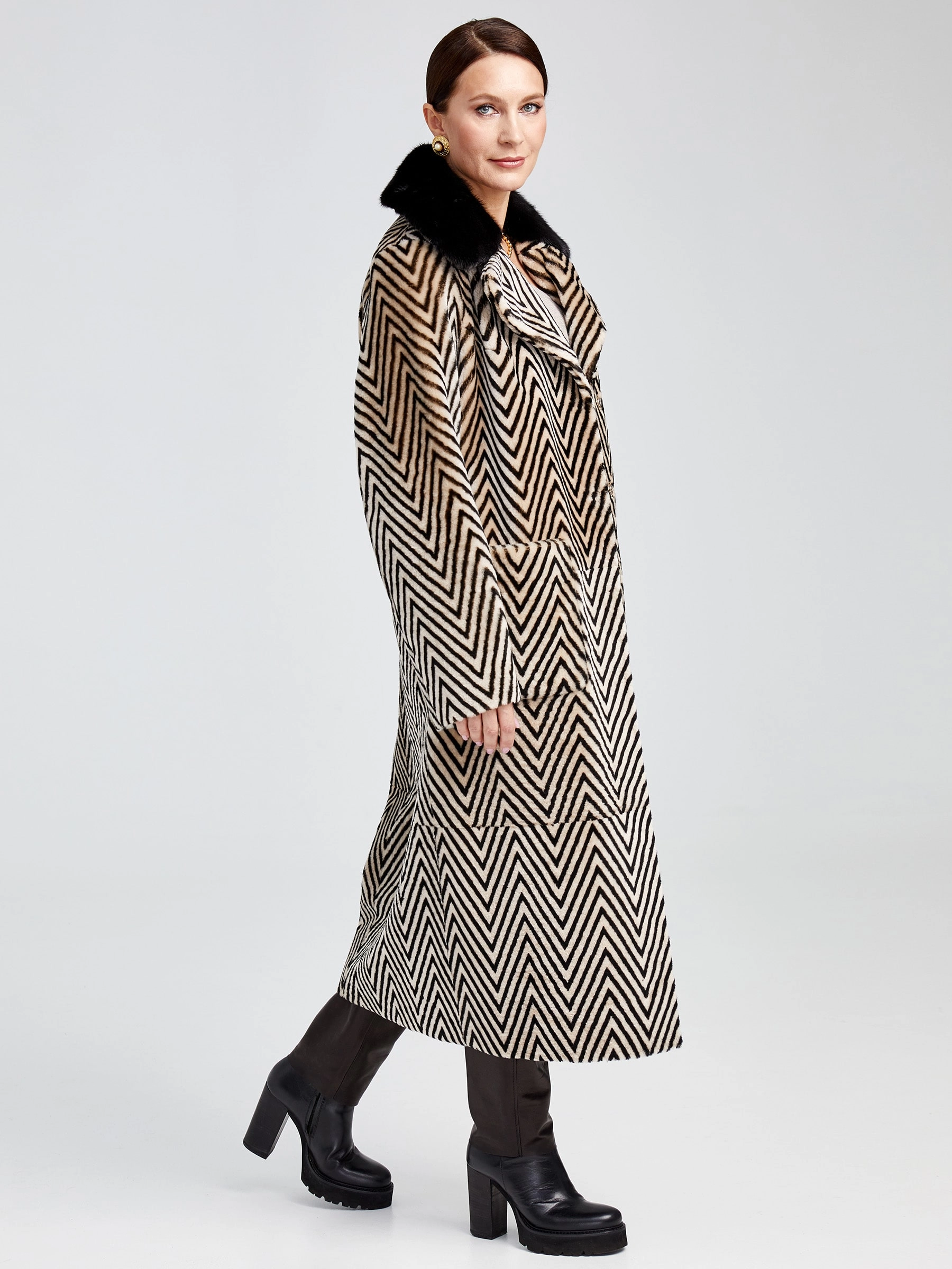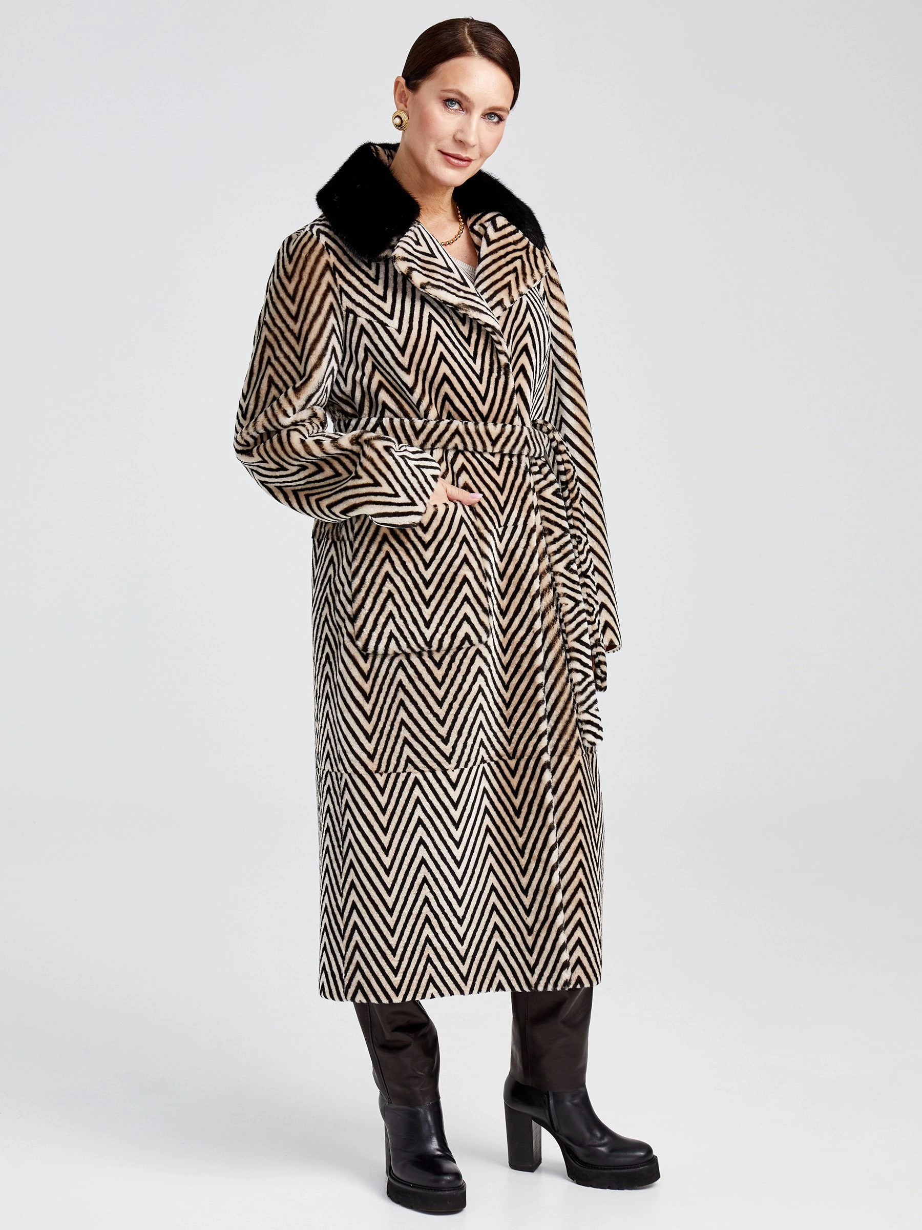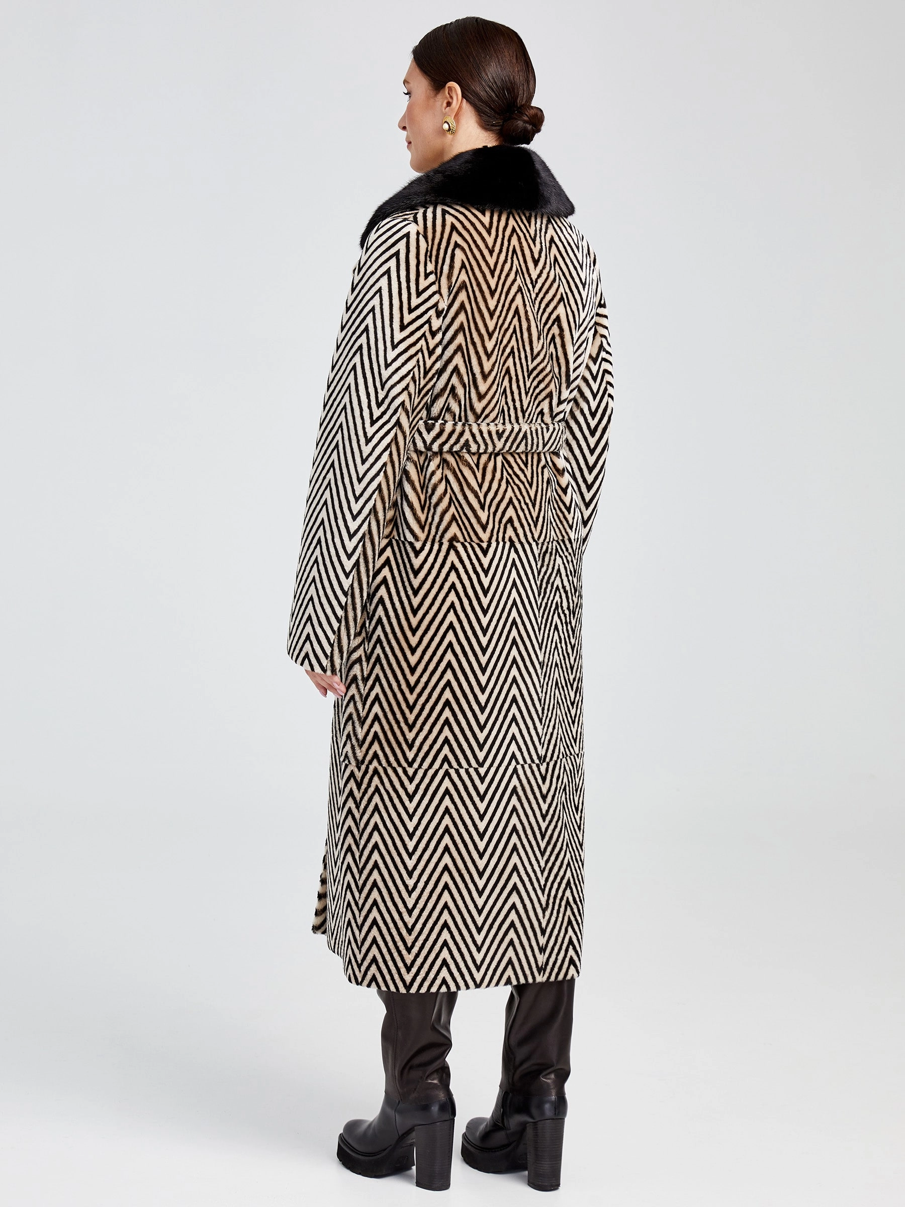 Роскошная двусторонняя дублёнка премиум-класса длиной 119 см: принтованный мех астрагана, то есть ягнёнка, с одной стороны и благородное бронзовое металлизированное покрытие — с другой. Свободный силуэт со съёмным английским воротником из густого чёрного меха норки и удобной застёжкой на кнопках создаёт образ исключительной элегантности. Два накладных кармана и длинный пояс подчёркивают дизайн. Совет стилиста: носите со стороной из астрагана и меховым воротником с платьем-миди и сапогами для вечера или со стороной-металлик без воротника с водолазкой, кожаными брюками и ботинками для дерзкого повседневного лука — максимальная универсальность в одной вещи.