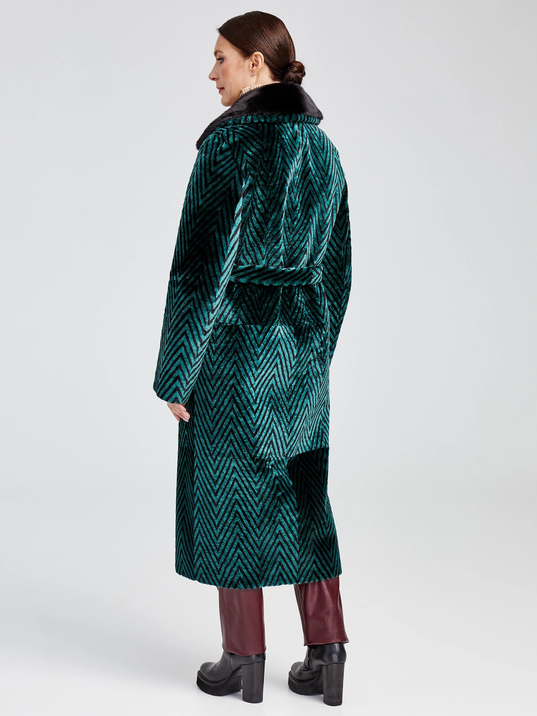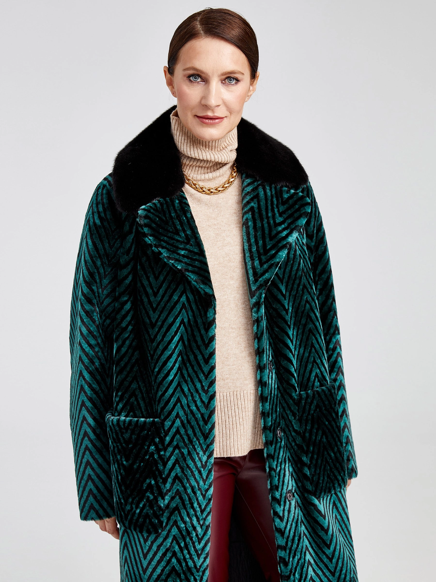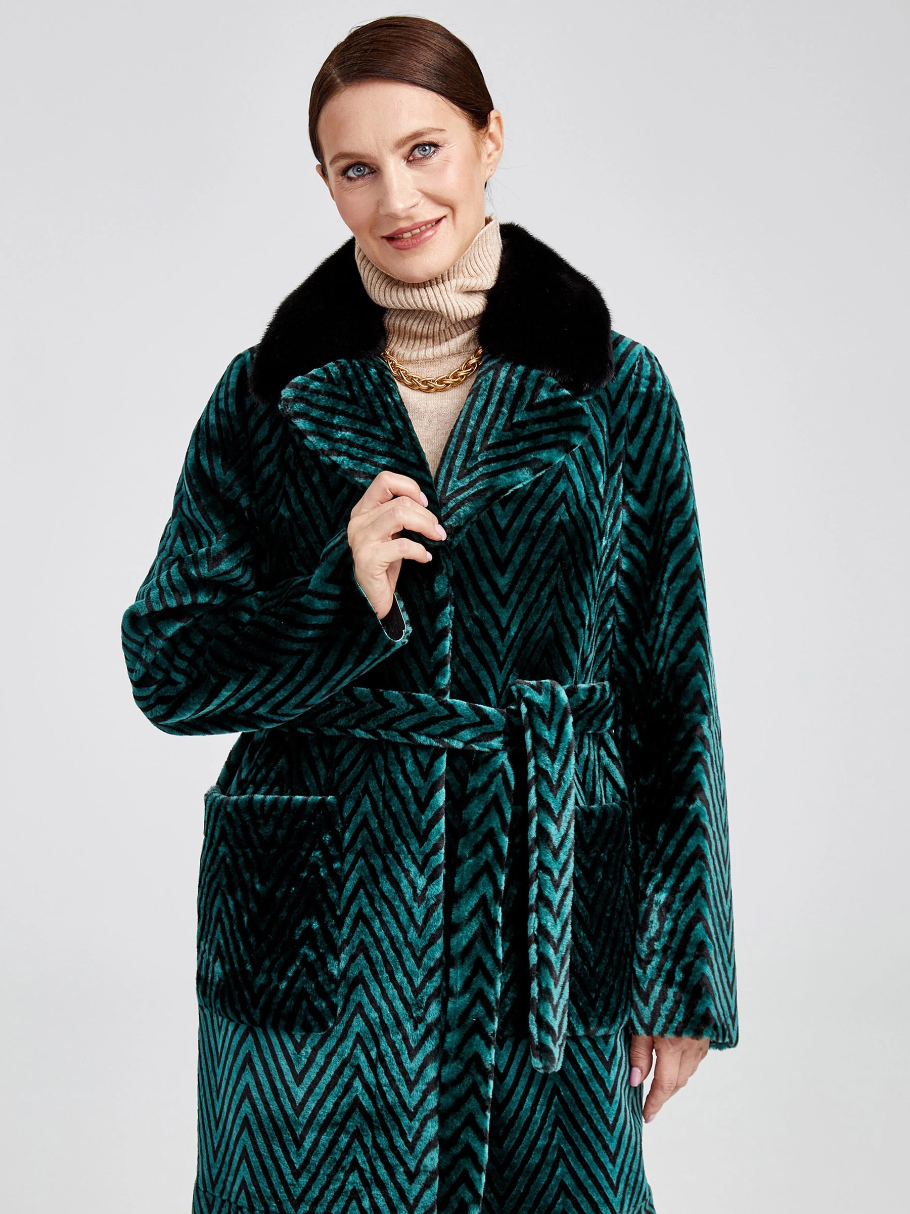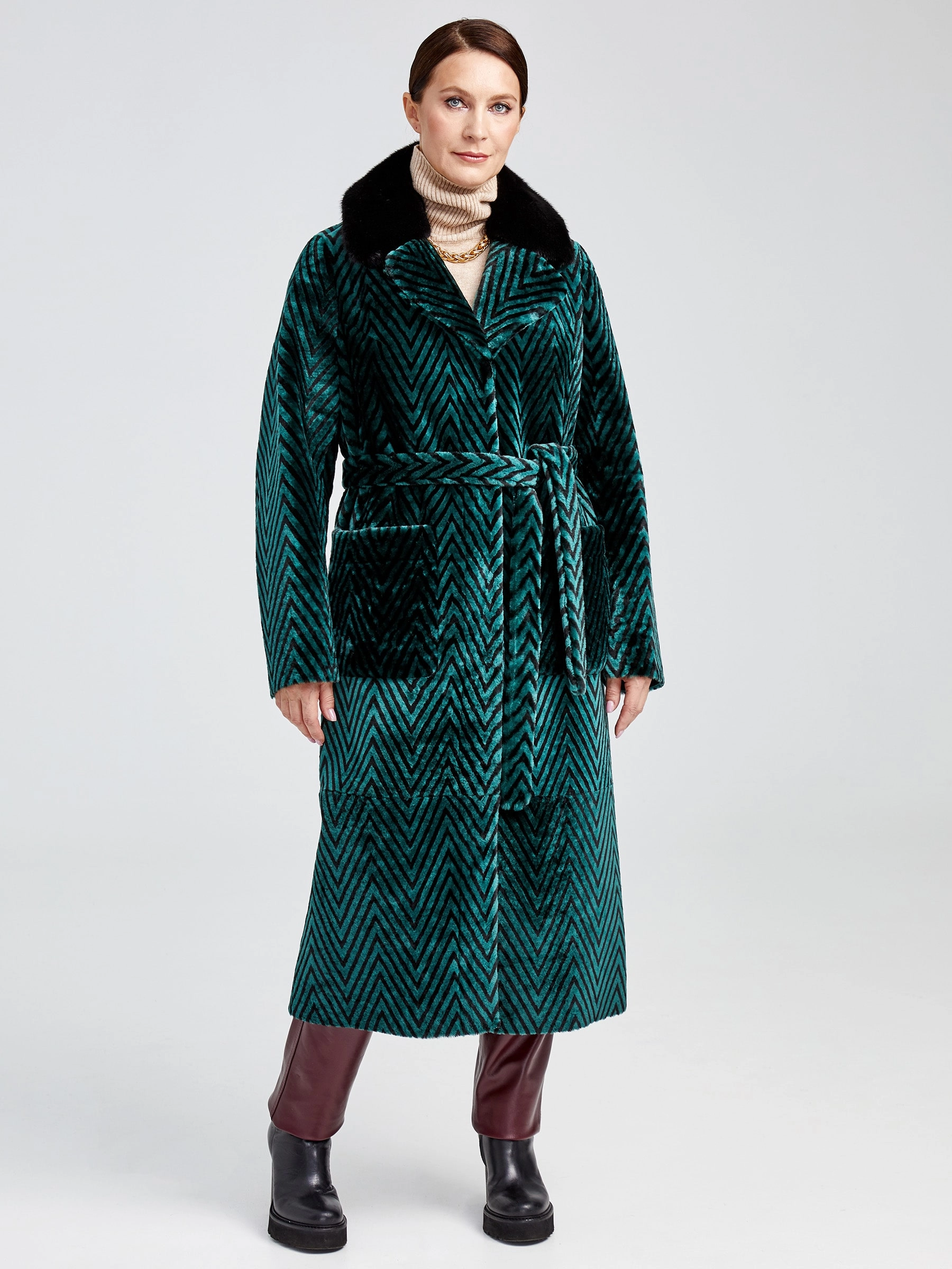 Роскошная двусторонняя дублёнка премиум-класса длиной 119 см: принтованный мех астрагана, то есть ягнёнка, с одной стороны и благородное бронзовое металлизированное покрытие — с другой. Свободный силуэт со съёмным английским воротником из густого чёрного меха норки и удобной застёжкой на кнопках создаёт образ исключительной элегантности. Два накладных кармана и длинный пояс подчёркивают дизайн. Совет стилиста: носите со стороной из астрагана и меховым воротником с платьем-миди и сапогами для вечера или со стороной-металлик без воротника с водолазкой, кожаными брюками и ботинками для дерзкого повседневного лука — максимальная универсальность в одной вещи.