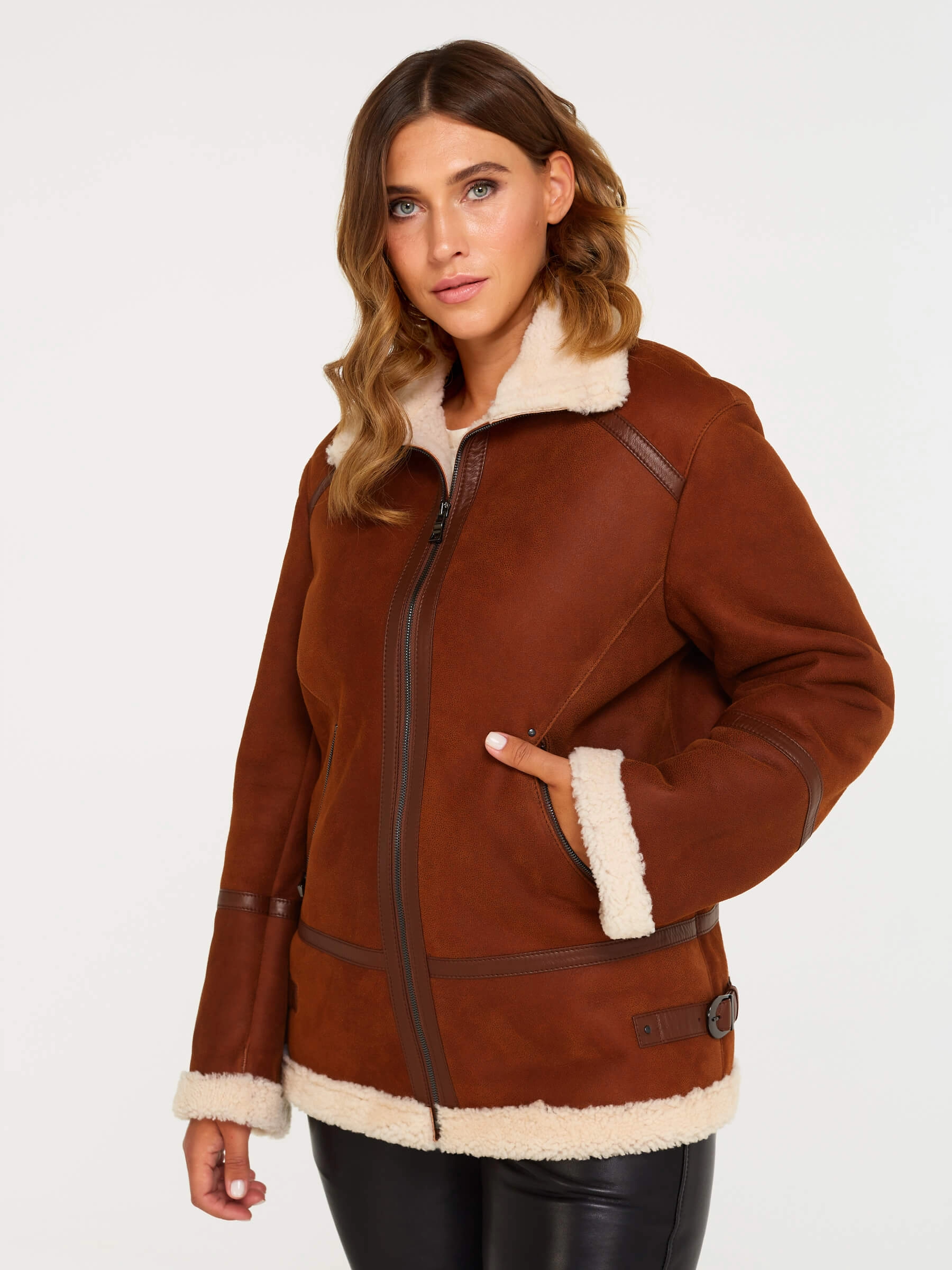 Короткая женская дубленка авиатор из керли 204, табачно-рыжая, размер 48, артикул 61410
