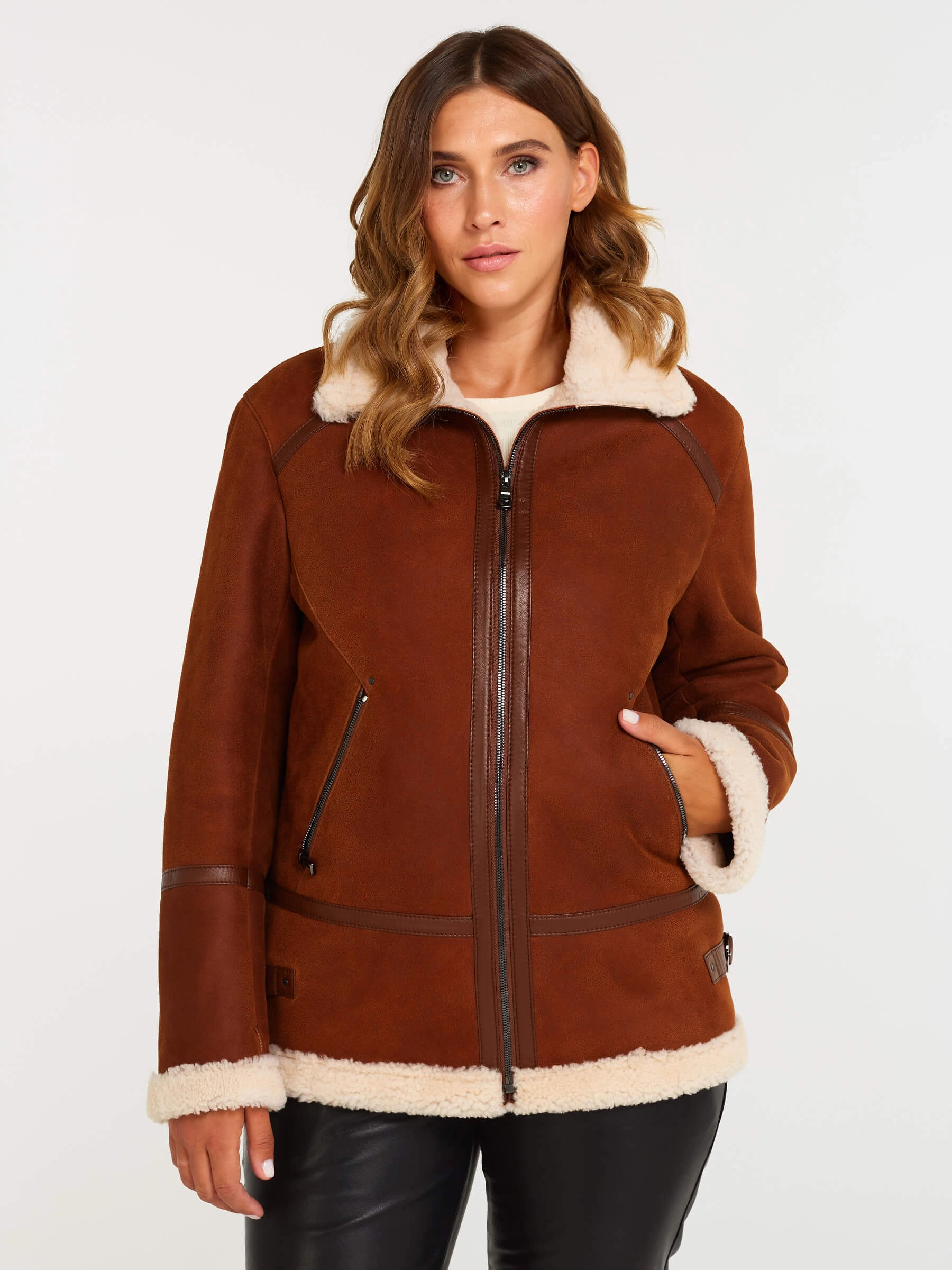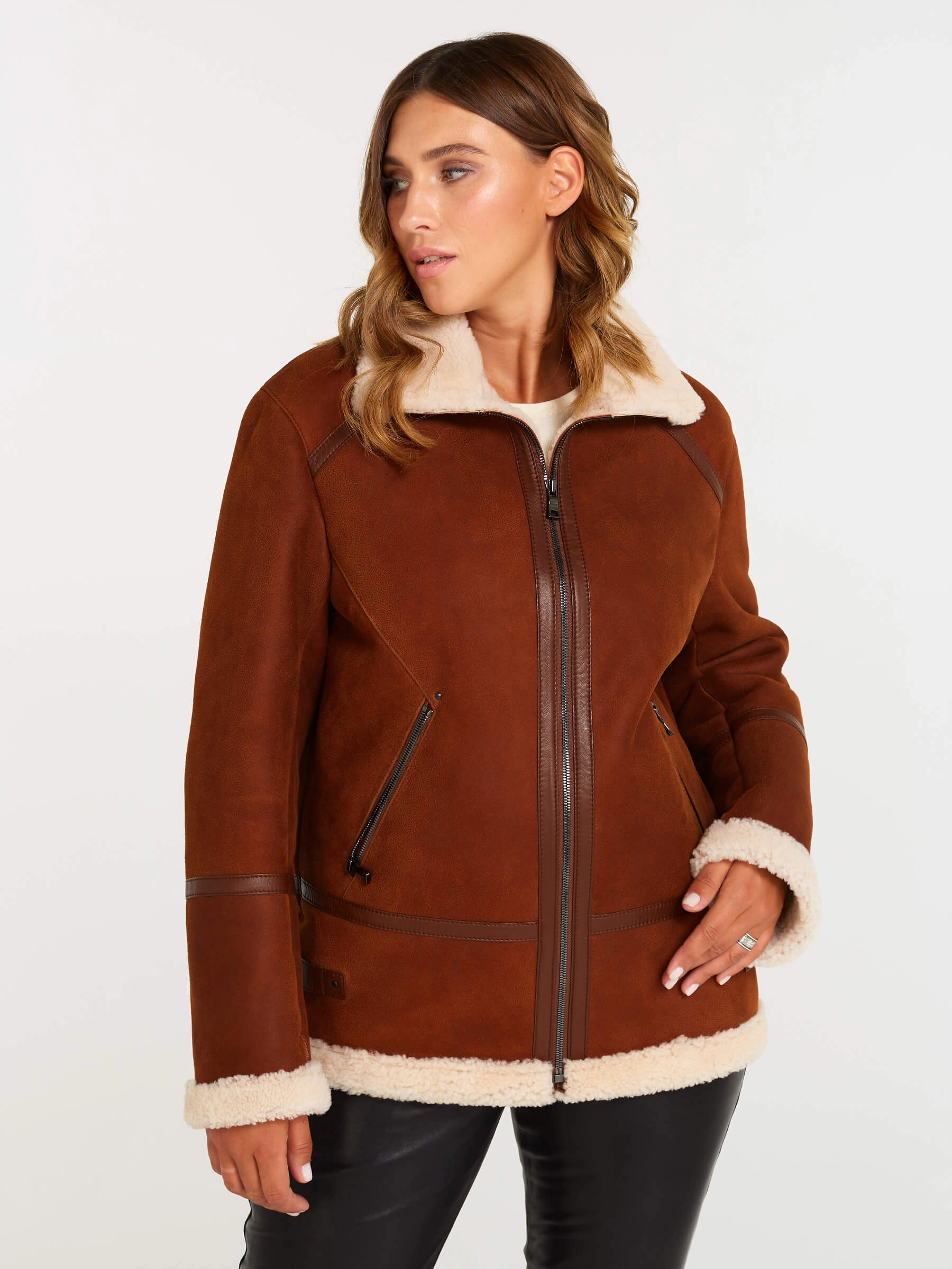 Представляем вам короткую дубленку-авиатор из роскошной овчины керли в благородном табачном оттенке — воплощение безупречного комфорта, спортивного шика и великолепной свободы движений для самых холодных дней. Модель свободного силуэта длиной 66 сантиметров с отложным воротником и втачными рукавами создает образ уверенной небрежности, где главным акцентом становится максимально густой и нежный волос керли с его выразительными упругими локонами, которые надежно защищают от холода и дарят тактильное удовольствие. Глубокий табачный оттенок придает дубленке особое благородство и визуальную глубину, подчеркивая уникальную текстуру завитого меха. Продуманные детали подчеркивают функциональность и стиль: длина рукавов легко регулируется широкими меховыми манжетами с отворотом, а два практичных кармана на молниях добавляют модели дерзости и позволяют надежно хранить мелочи. Удобная застежка-молния обеспечивает комфортную посадку и защиту от ветра.