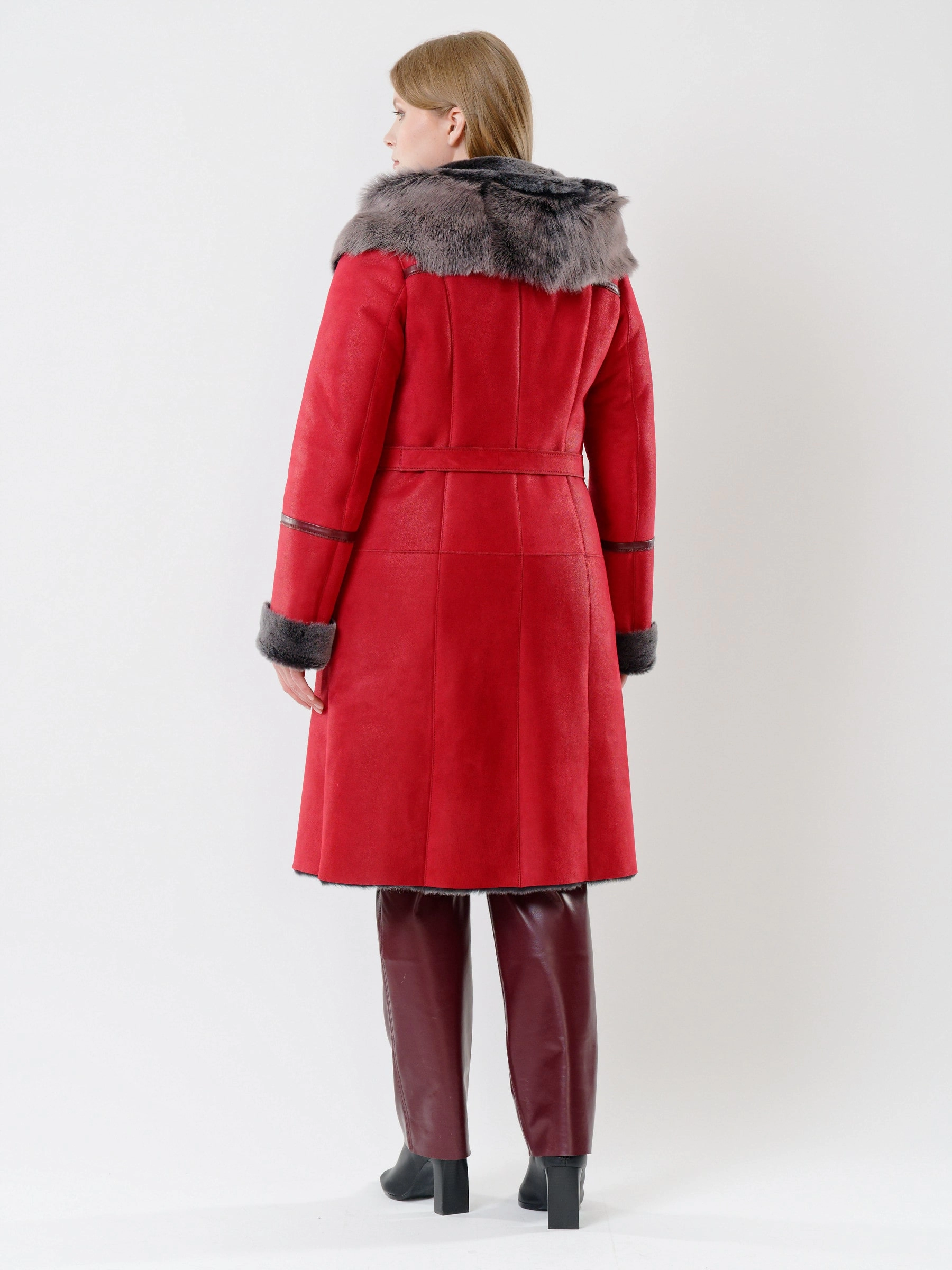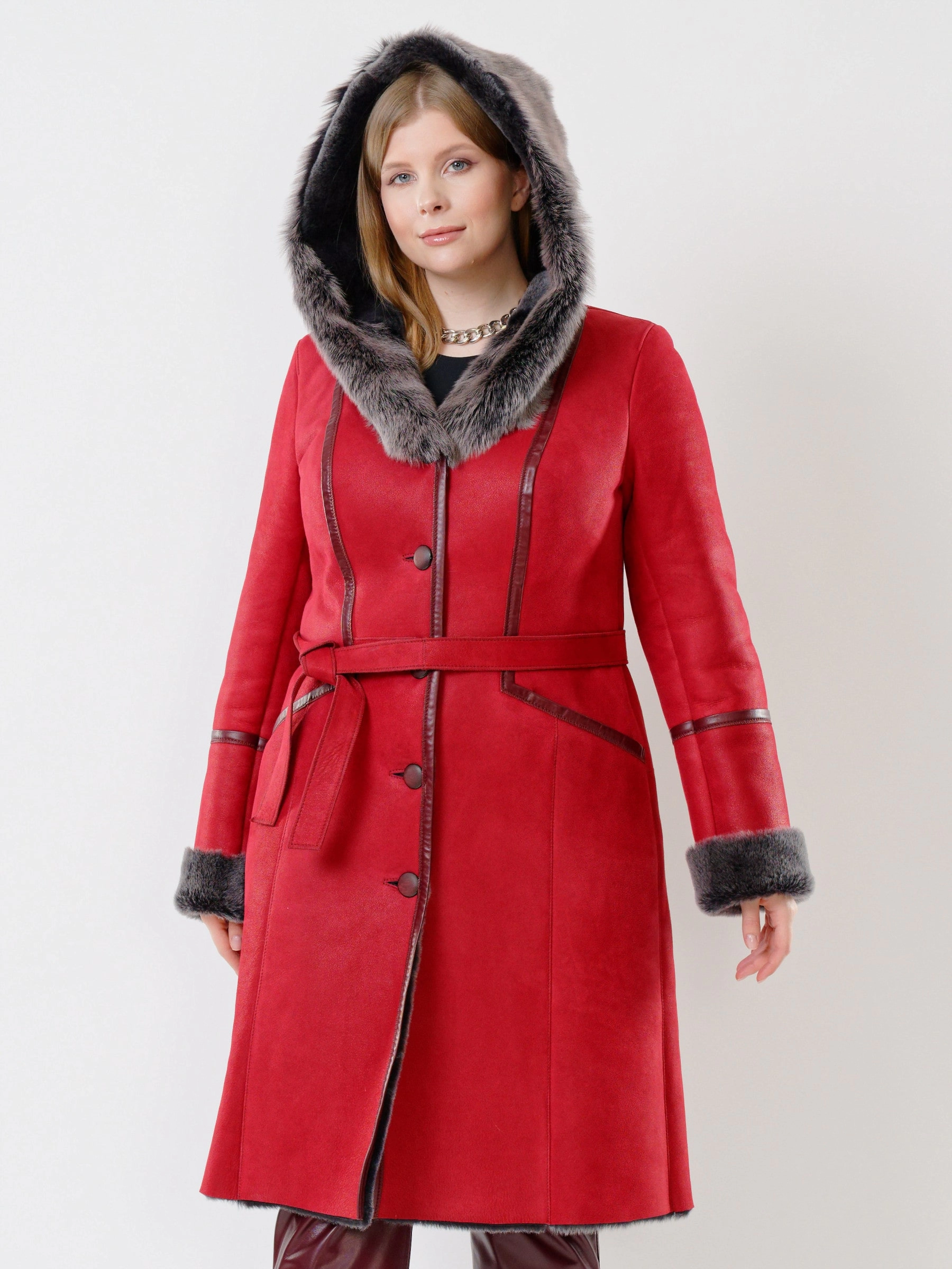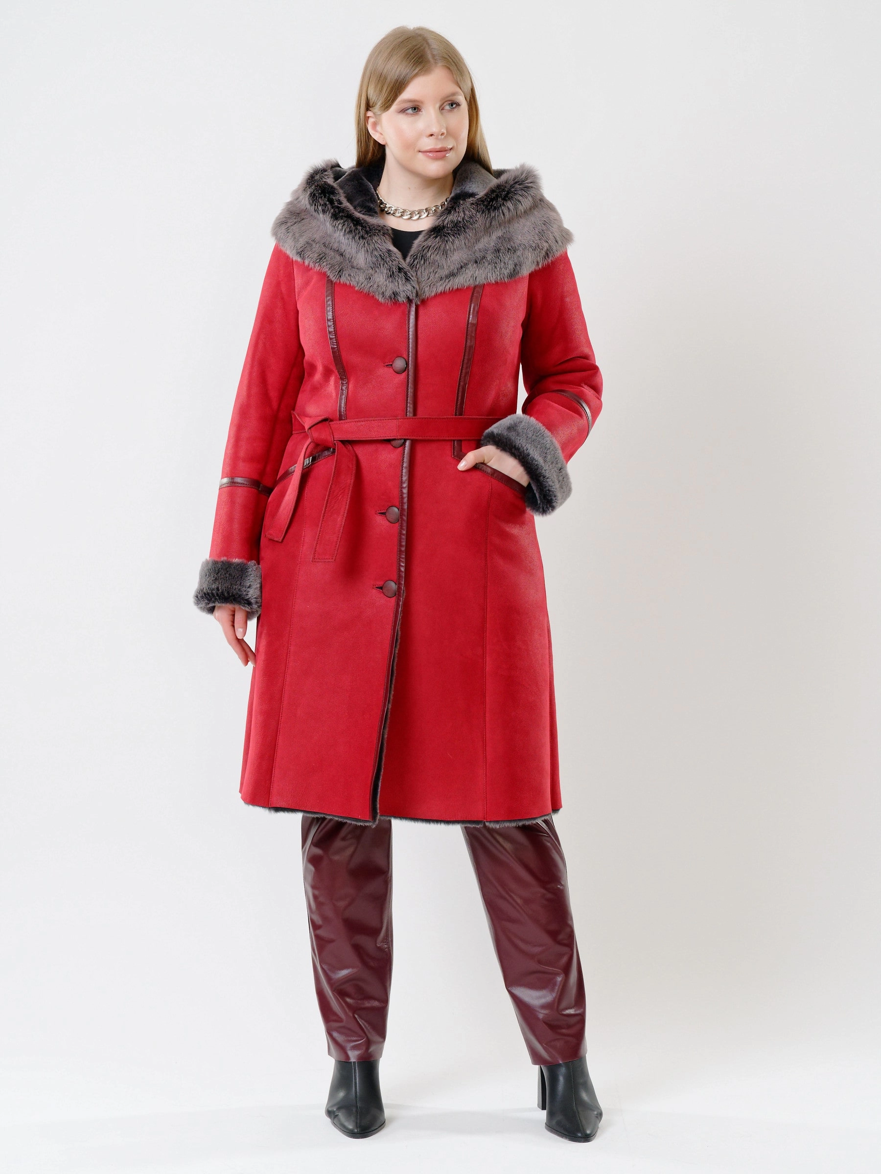 Товар женская дубленка с капюшоном из тосканы 263, красная, размер 44, артикул 13480 выполнен из овчина "мерино" с застежкой пуговицы. Рассчитан на сезон: осень-зима. Длина изделия 105 см, силуэт полуприлегающий.