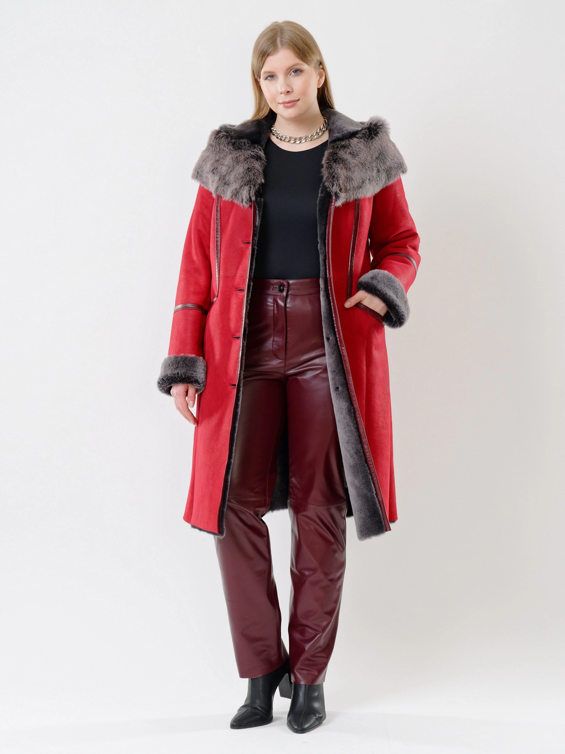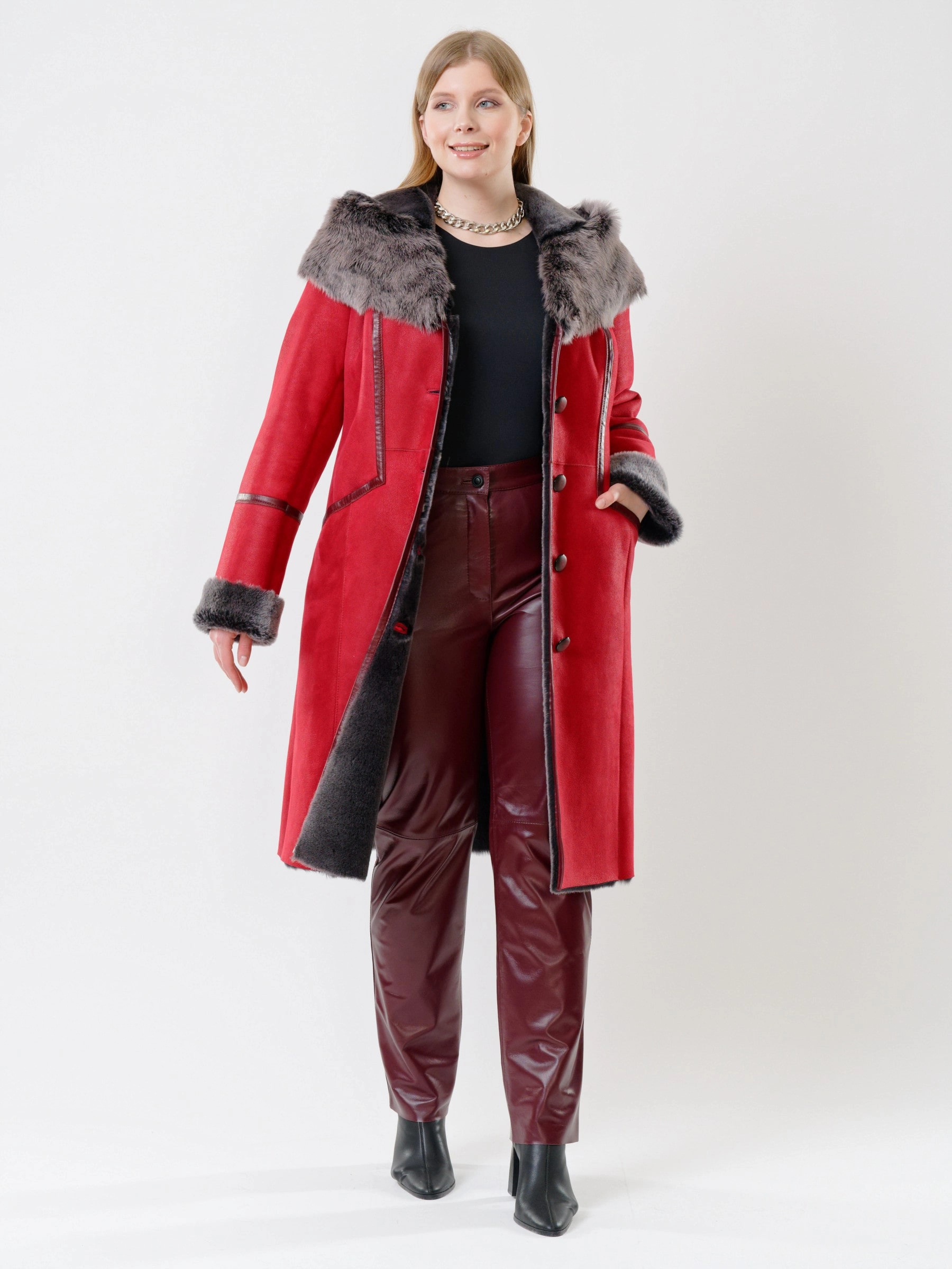 Роскошная женская дублёнка длиной 105 см из натуральной овчины «мерино». Полуприлегающий силуэт с втачными рукавами обеспечивает безупречную комфортную посадку по фигуре, подчёркивая изящество. Дублёнку дополняет глубокий несъёмный капюшон с опушью из тосканской овчины, дарящий тепло в любую стужу. Длинный пояс подчеркнёт талию, а застёжка на пуговицы и два боковых кармана добавят удобства и классического шарма. Идеальна с джинсами и свитером для повседневного шика или с платьями и юбками для элегантного выхода.
