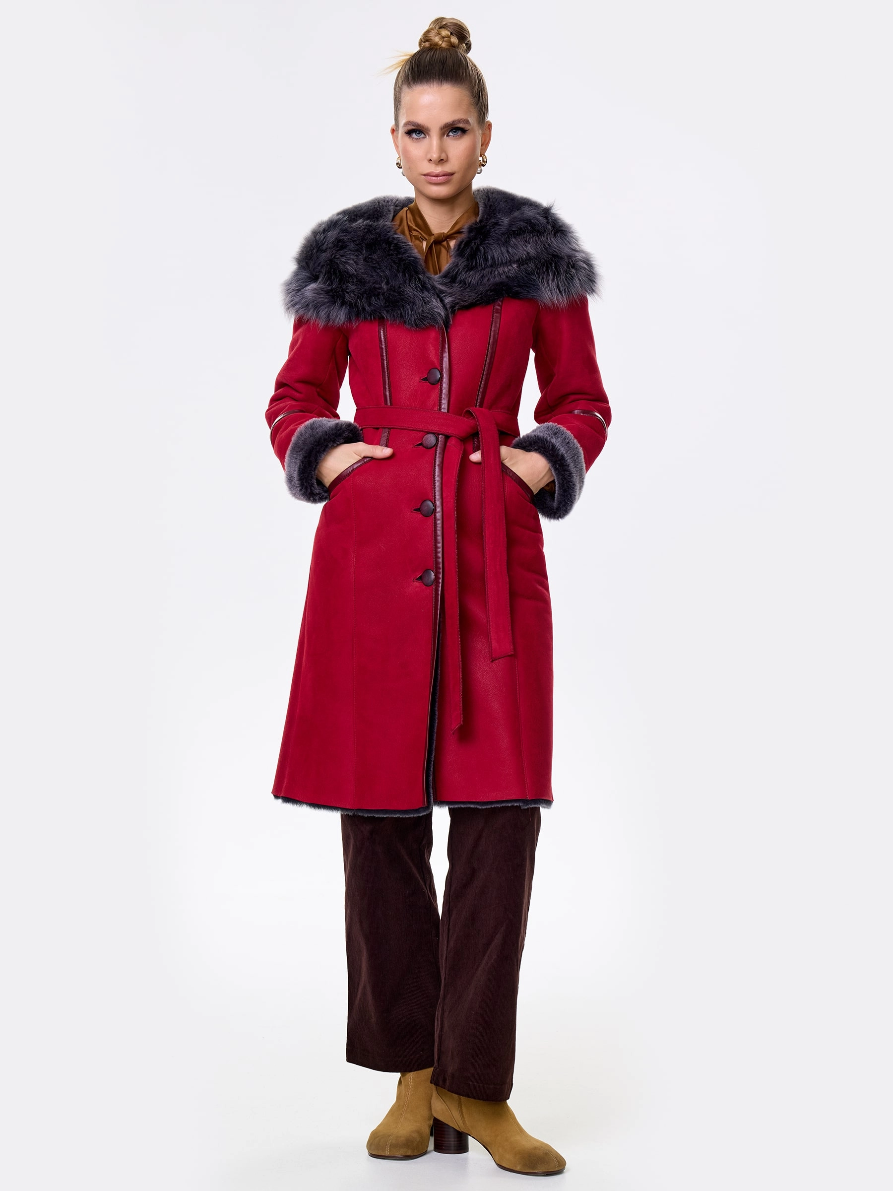 Роскошная женская дублёнка длиной 105 см из натуральной овчины «мерино». Полуприлегающий силуэт с втачными рукавами обеспечивает безупречную комфортную посадку по фигуре, подчёркивая изящество. Дублёнку дополняет глубокий несъёмный капюшон с опушью из тосканской овчины, дарящий тепло в любую стужу. Длинный пояс подчеркнёт талию, а застёжка на пуговицы и два боковых кармана добавят удобства и классического шарма. Идеальна с джинсами и свитером для повседневного шика или с платьями и юбками для элегантного выхода.