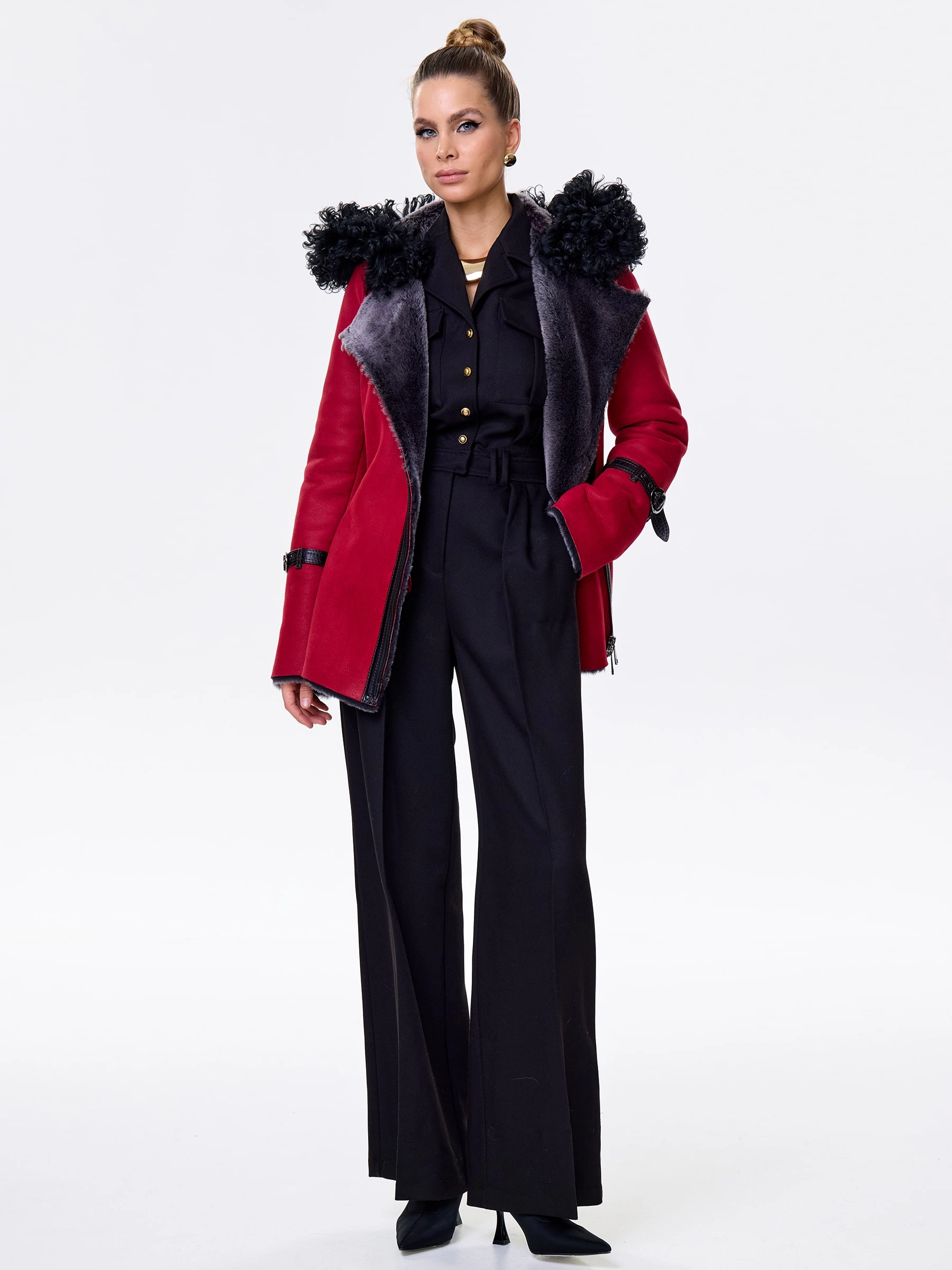Товар женская дубленка косуха с капюшоном и отделкой овчиной тиградо 288, красная, размер 42, артикул 14730 выполнен из овчина "мерино" с застежкой молния. Рассчитан на сезон: осень-зима. Длина изделия 66 см, силуэт полуприлегающий.