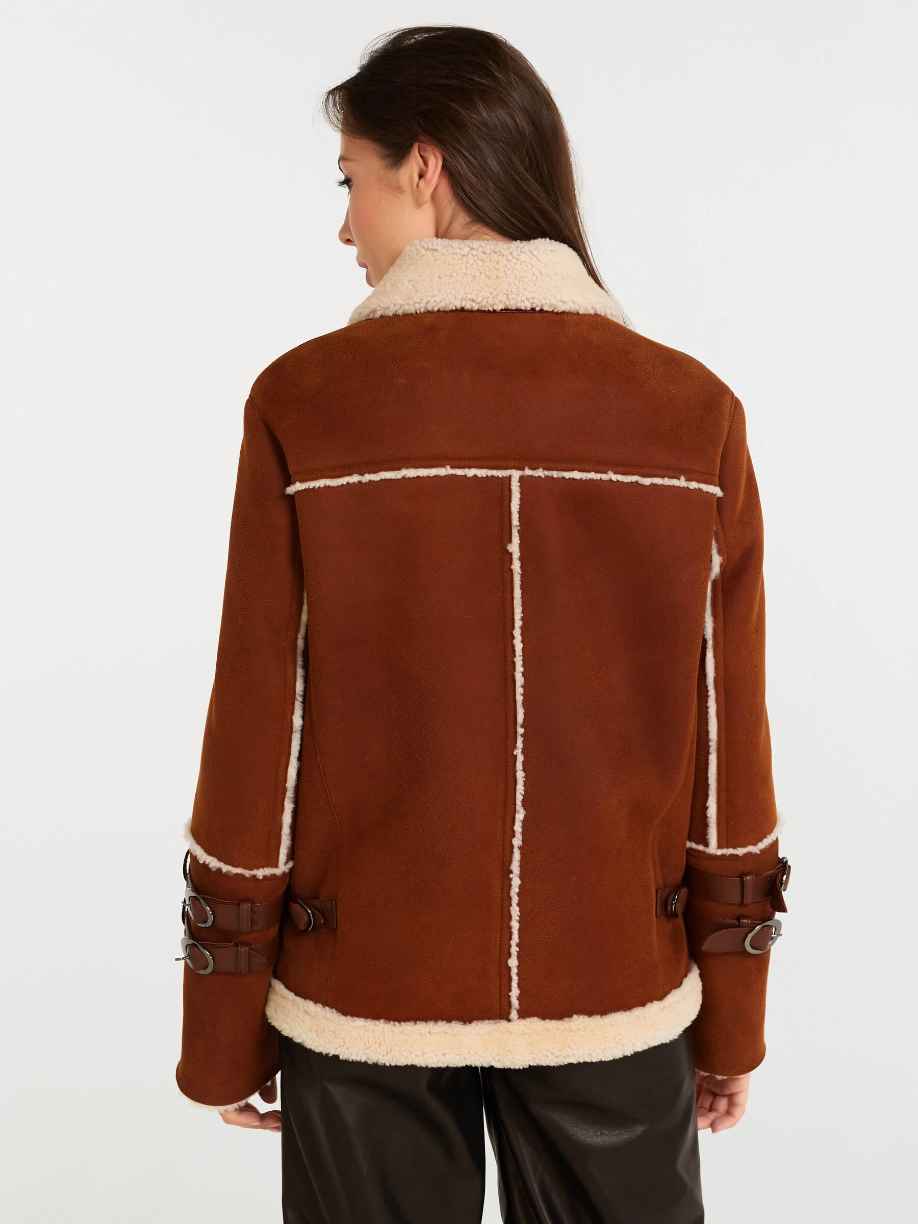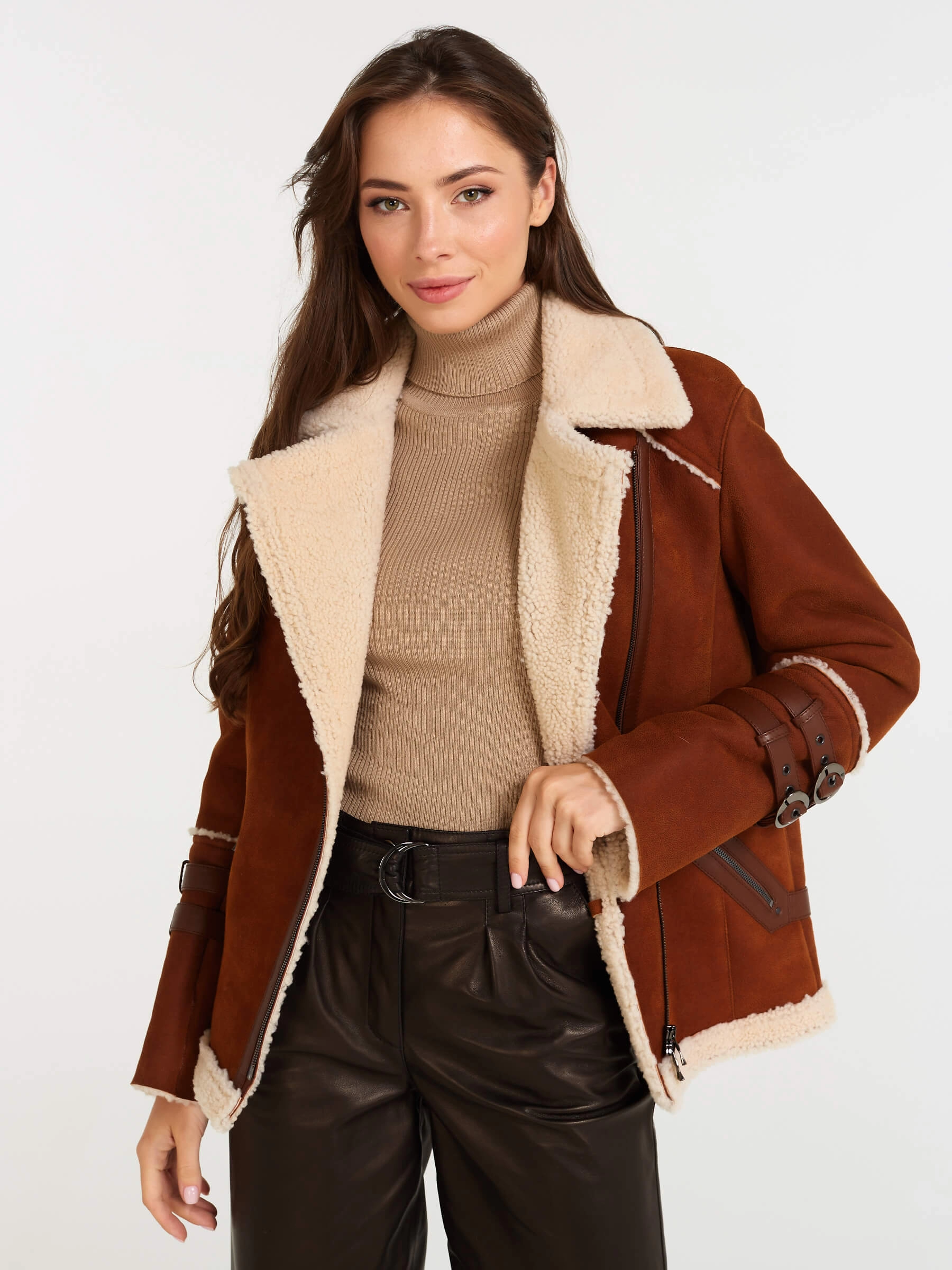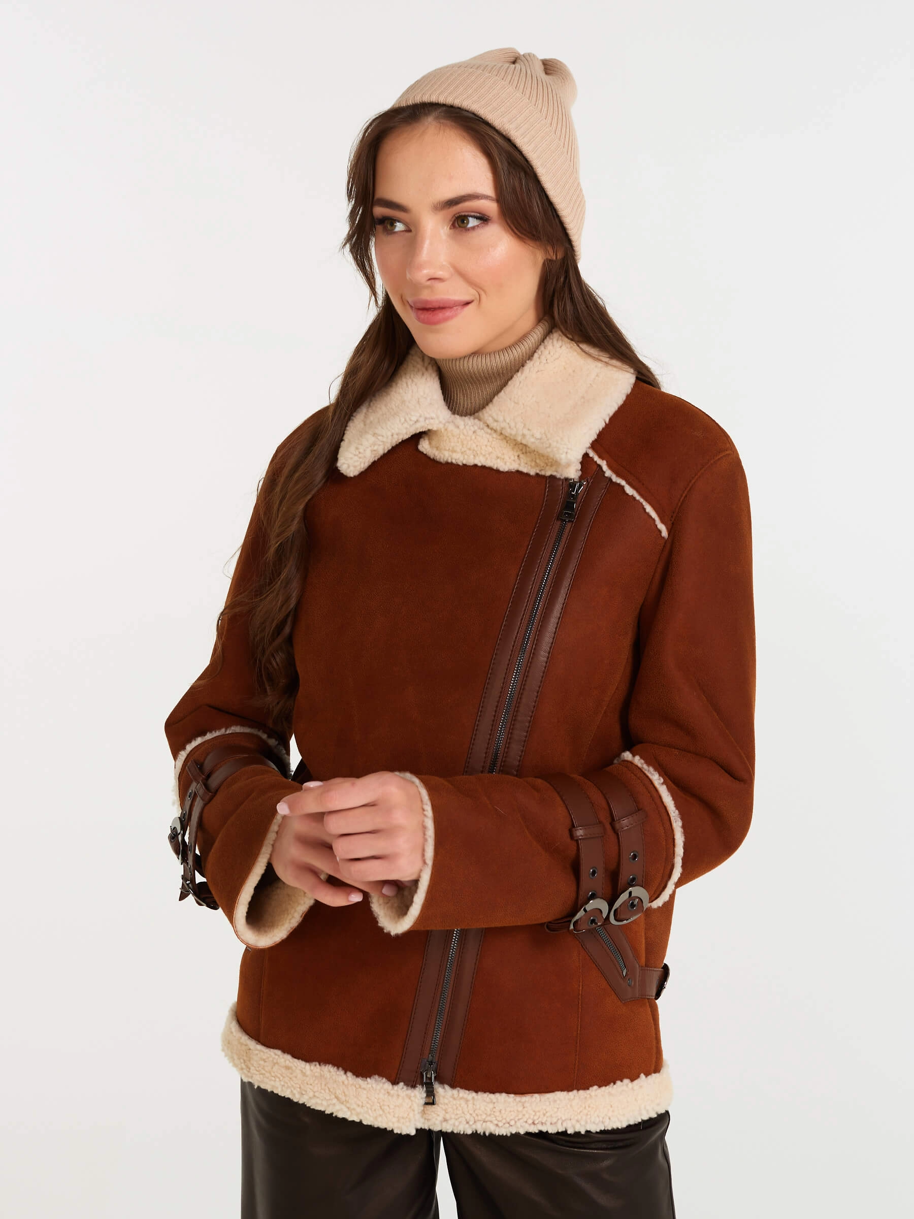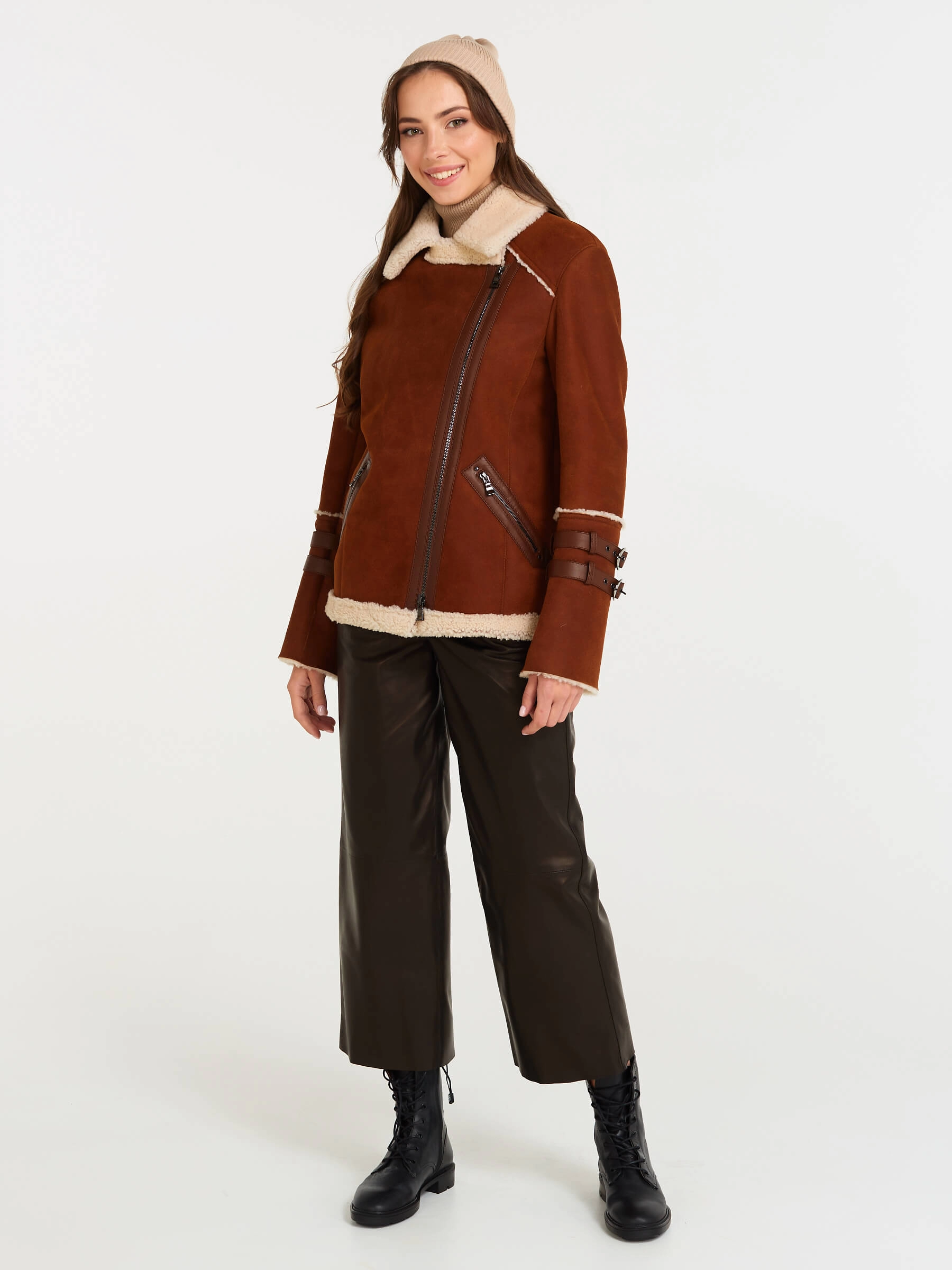 Демисезонный комплект женский: Дубленка 290 + Брюки 05, табачный/черный, р. 44, арт. 111257