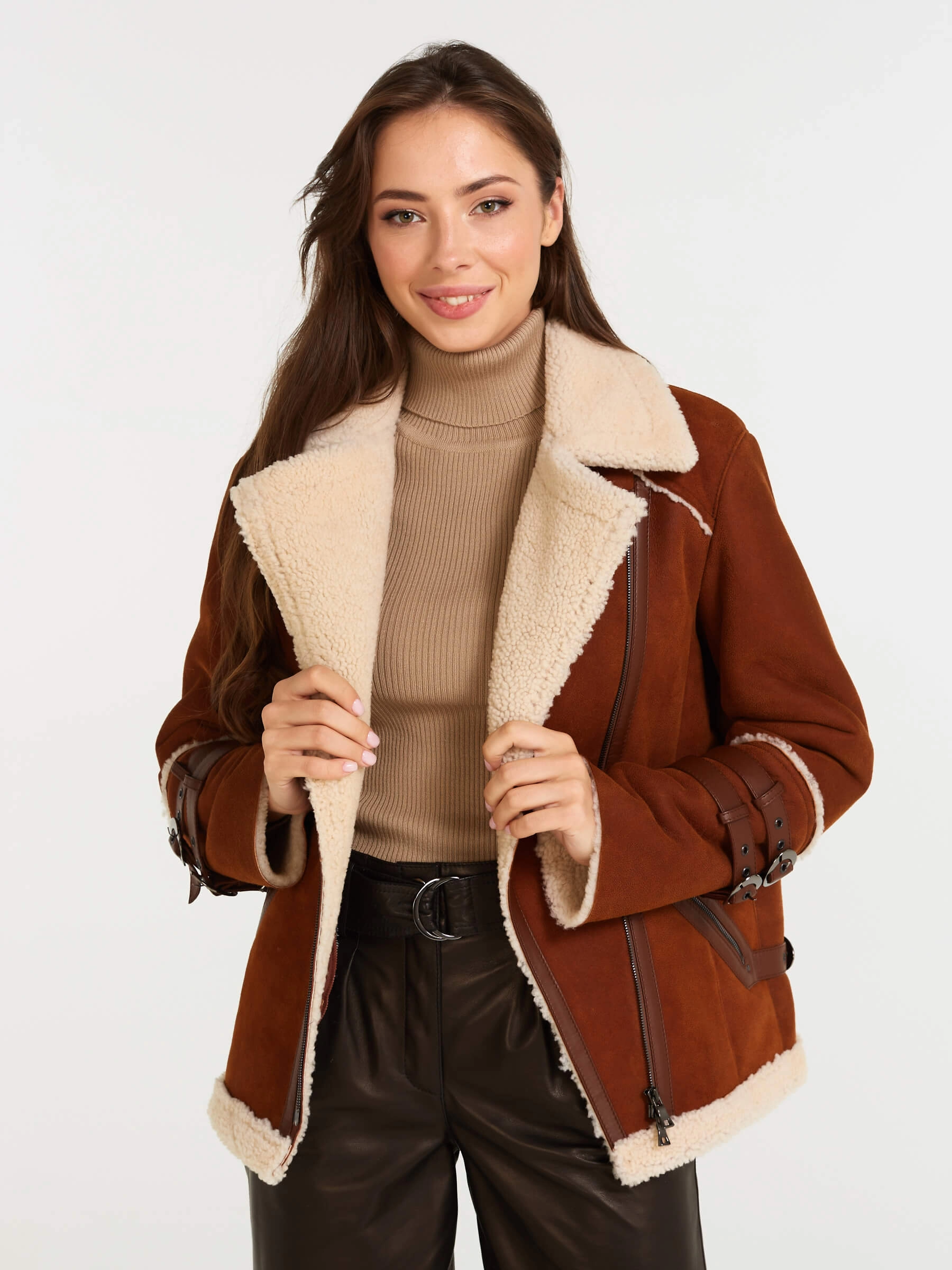 Женская короткая дубленка-косуха из теплой натуральной овчины керли подарит брутальный шарм, абсолютный комфорт и надежную защиту от холода в самые морозные дни! Модель свободного прямого силуэта длиной 70 сантиметров спортивного кроя с втачными рукавами обеспечивает полную свободу движений и непринужденную посадку, а густой шелковистый мех керли с его выразительными упругими завитками дарит невероятное тепло и тактильное удовольствие. Застежка-молния, английский воротник с широкими лацканами, регулируемые манжеты и кожаные паты на рукавах и по бокам создают тот самый непокорный дух байкерской классики, который делает эту модель по-настоящему дерзкой и узнаваемой. Практичные врезные карманы на молниях добавляют функциональности и завершают образ.