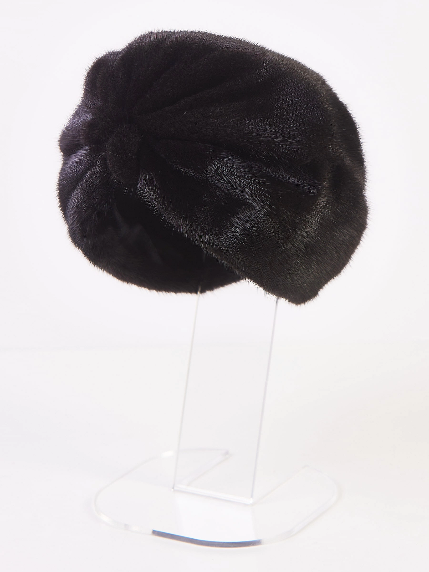 Эту модель выполнили из однотонной шелковистой густой норки, которая хорошо сохраняет тепло. Спереди модель дополнили перемычкой, создающей эффект чалмы.