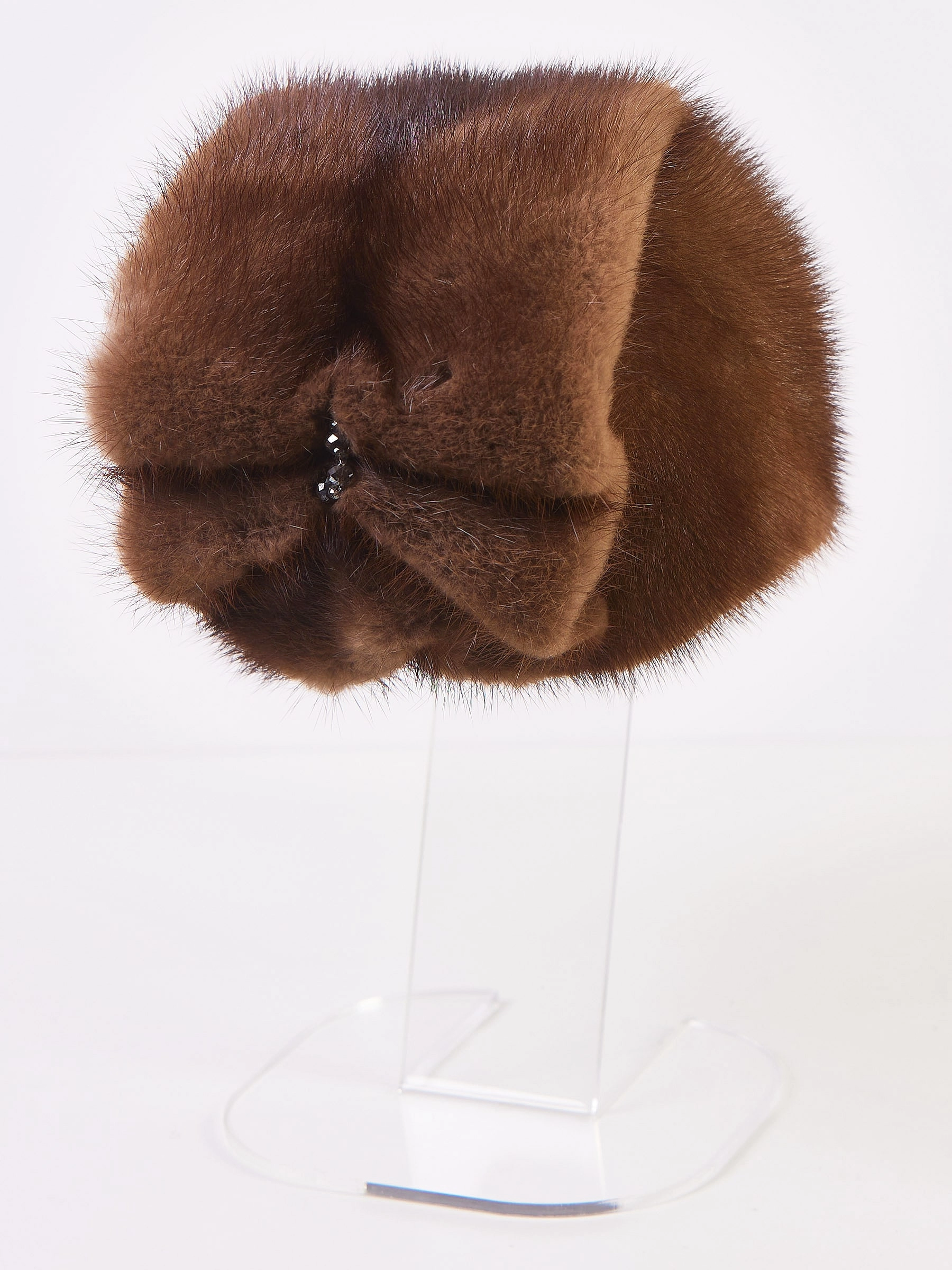 Женская шапка выполнена из шелковистого меха норки с плотной и густой подпушью. Глубокая посадка, затылочная часть собрана в широкие складки. Аксессуар хорошо сохраняет тепло в холодную погоду.