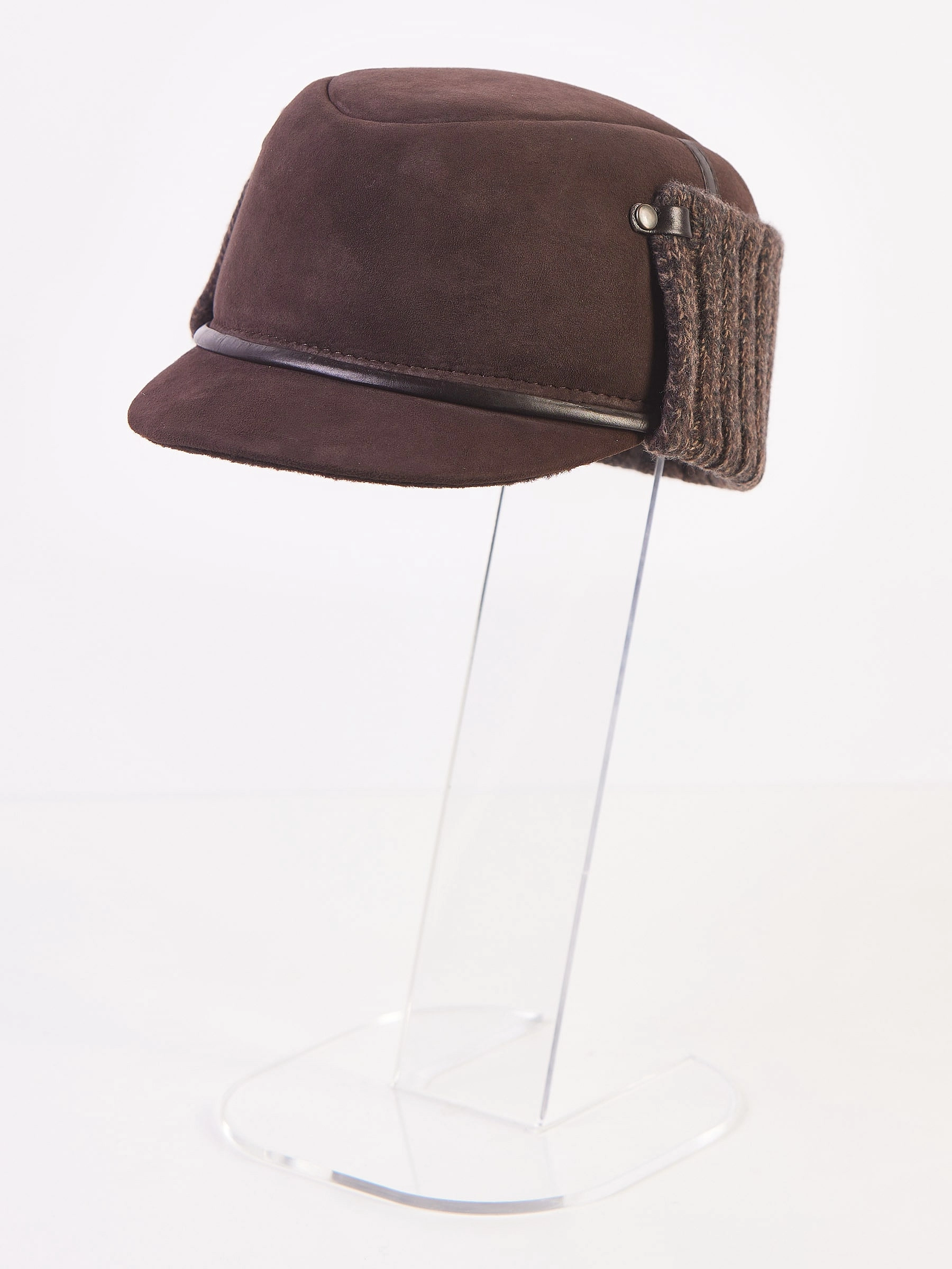 Мужской головной убор выполнен из плотной овчины. Лицевая из натуральной замши. Жесткий козырек. Ветрозащитный отворот выполнен из трикотажа и фиксируется кнопками.