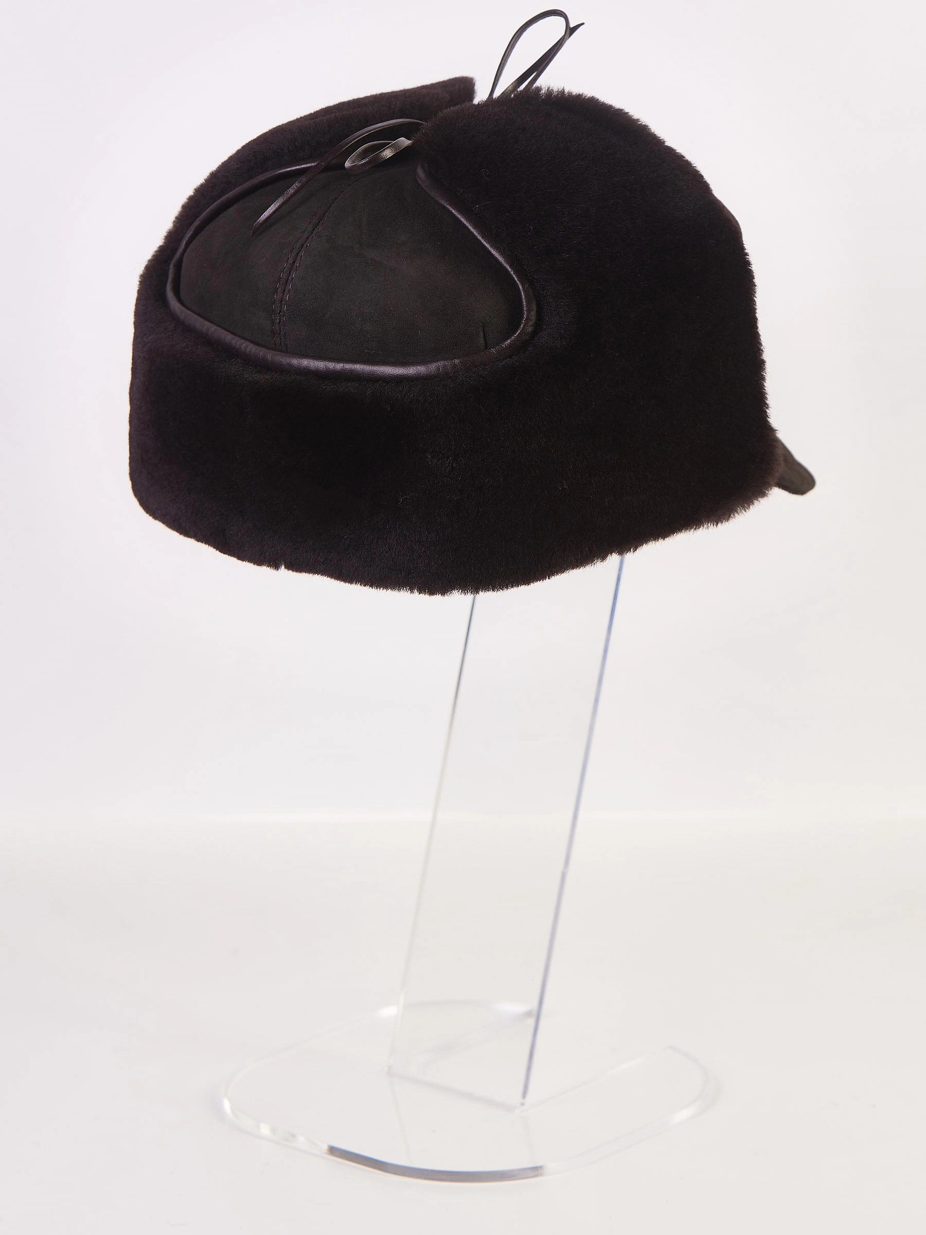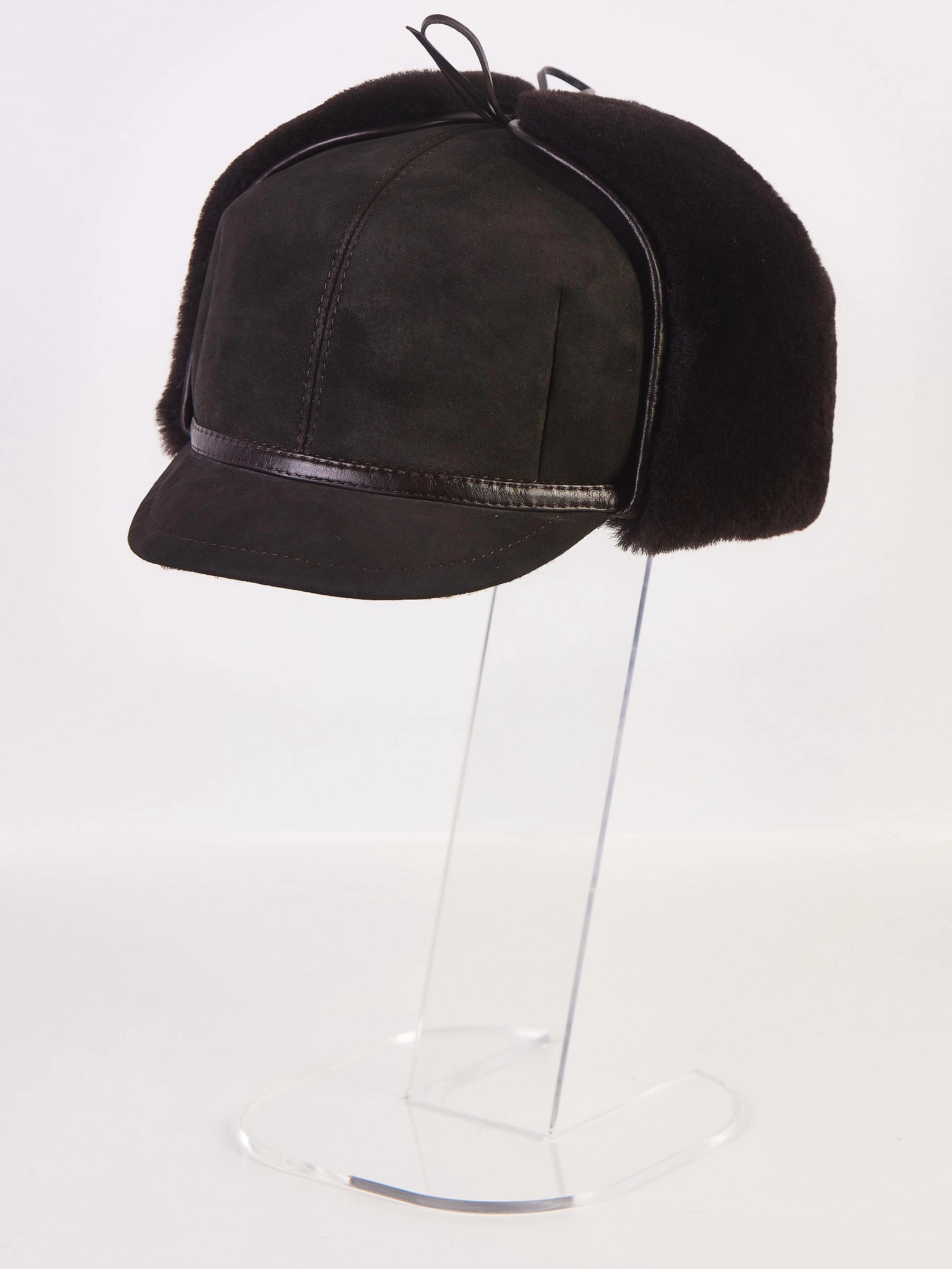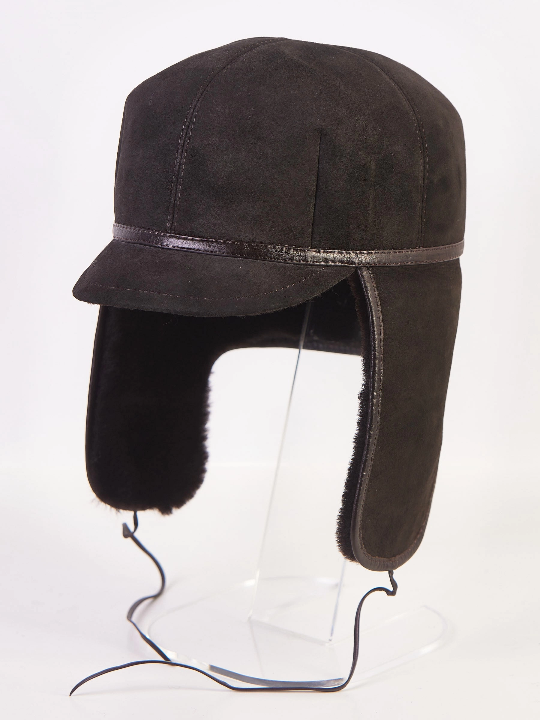 Мужской аксессуар изготовлен из натуральной овчины. Лицевая сторона - замша, внутренняя - плотная овчина. При необходимости ушки изделия отворачиваются и фиксируются тонкими шнурками из натуральной кожи.