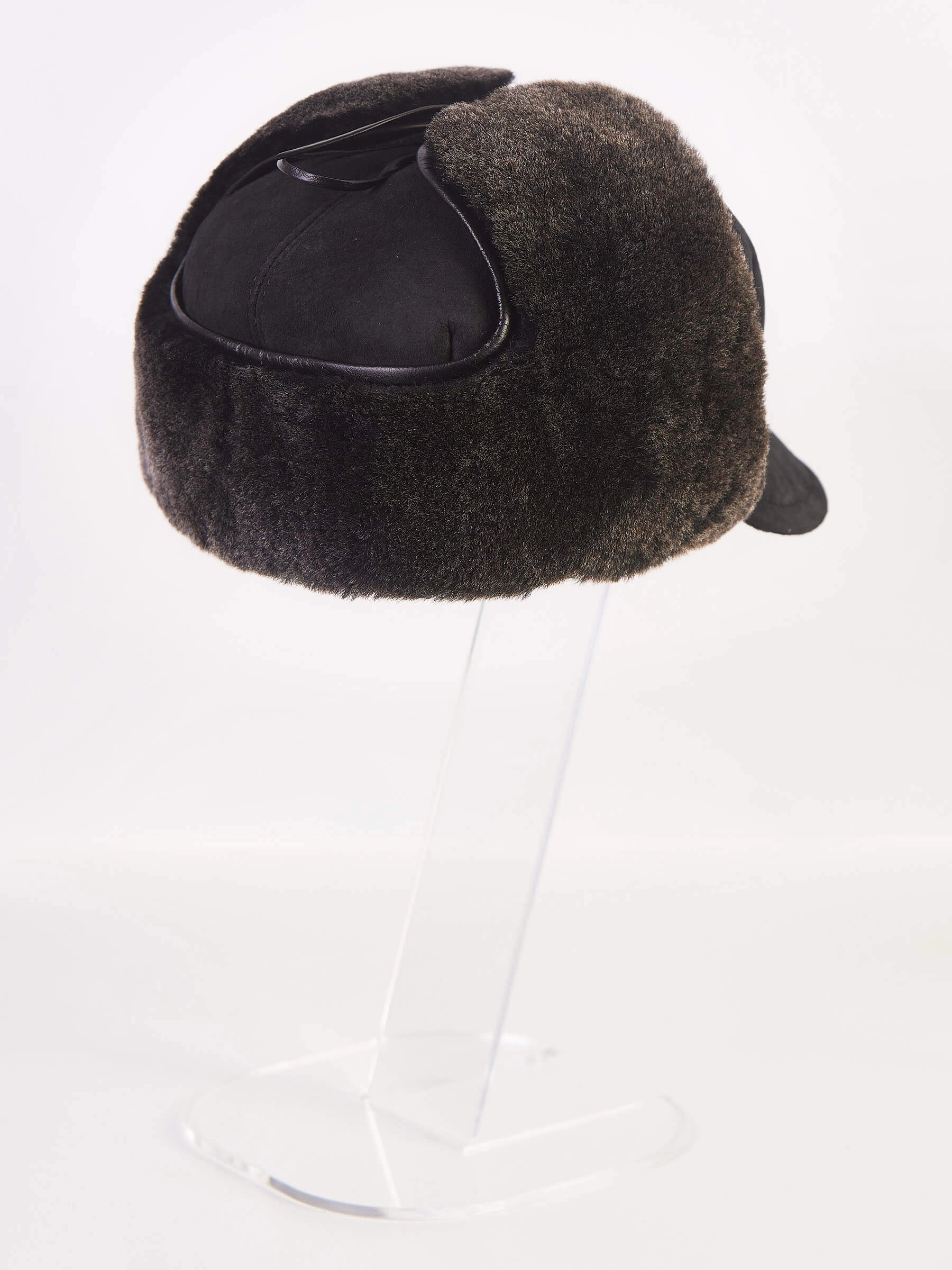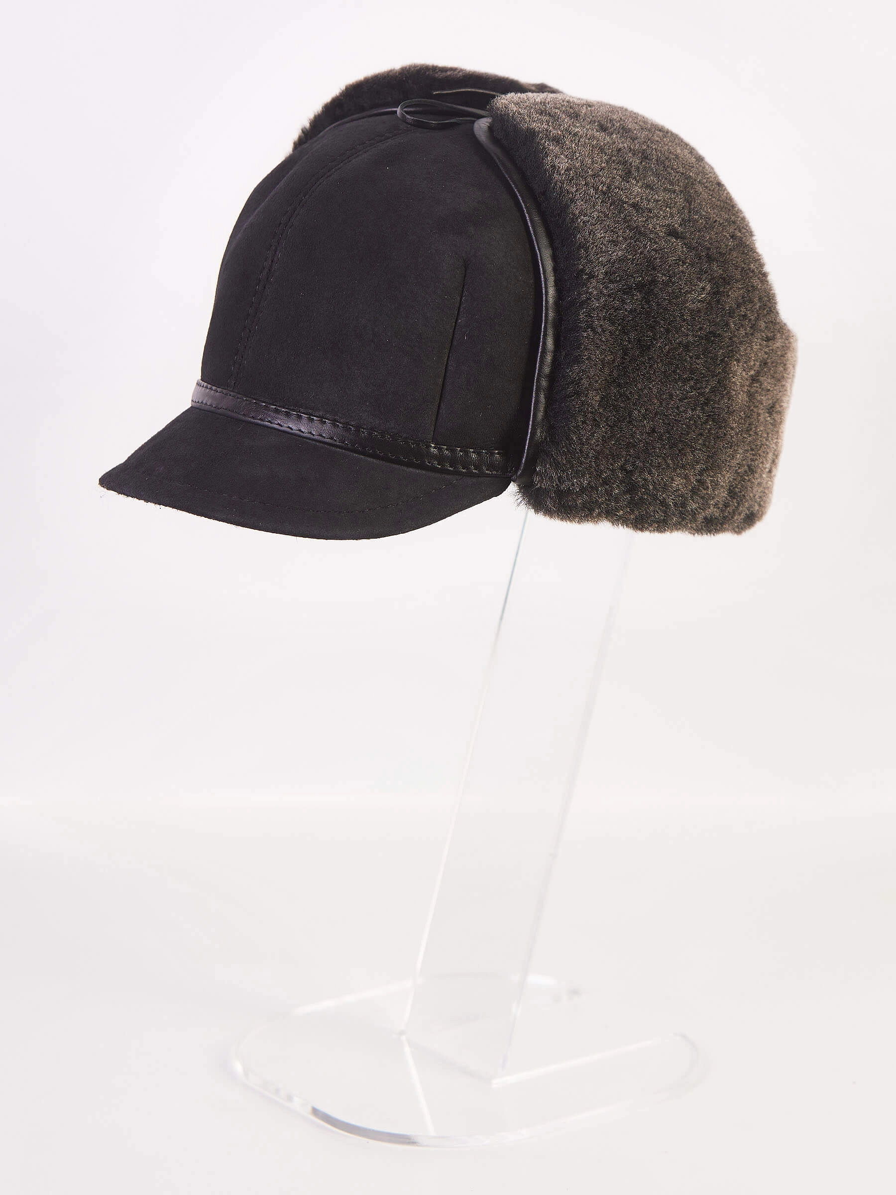 Мужской аксессуар изготовлен из натуральной овчины. Лицевая сторона - замша, внутренняя - плотная овчина. При необходимости ушки изделия отворачиваются и фиксируются тонкими шнурками из натуральной кожи.