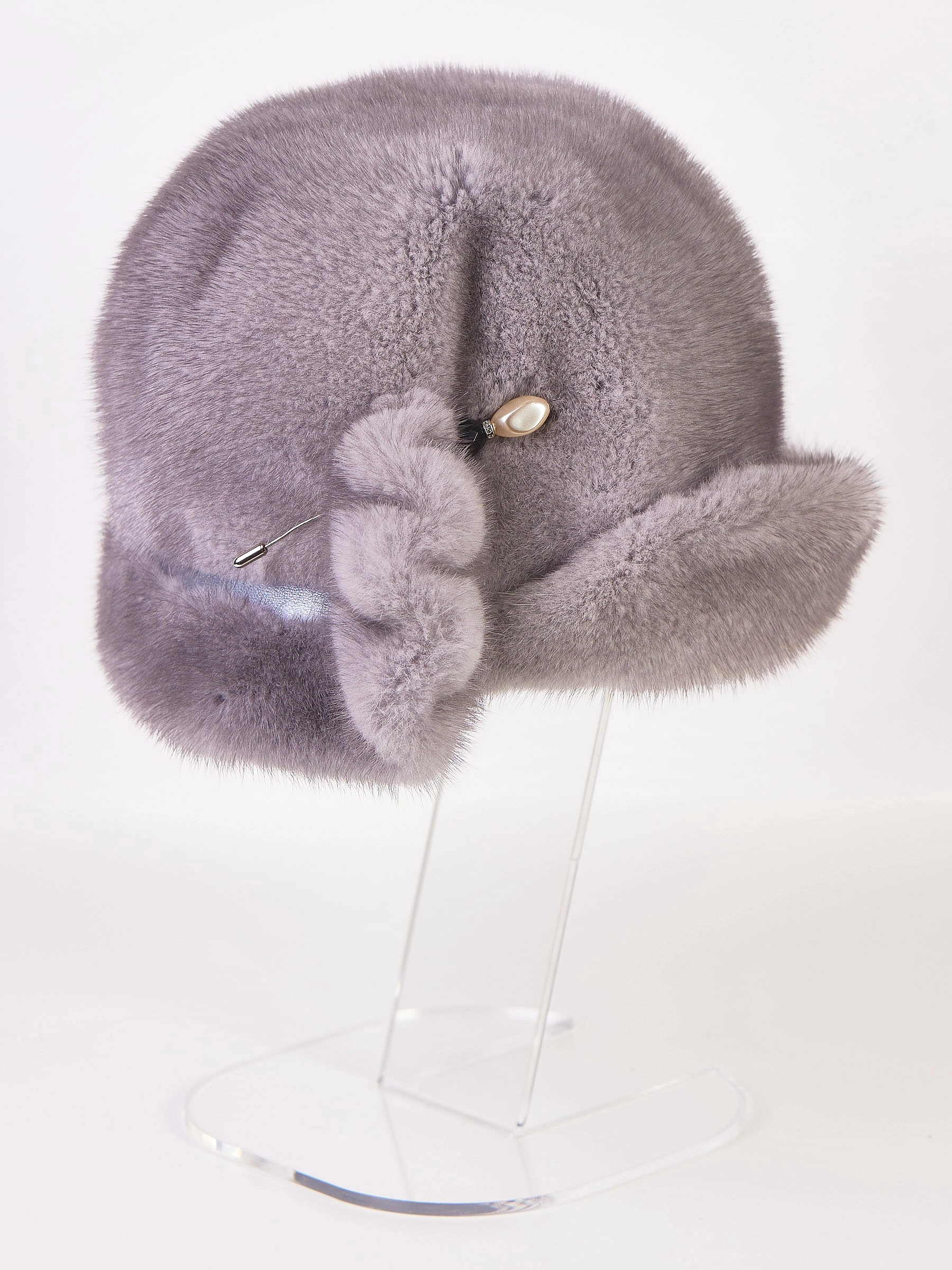 Женский головной убор Забава - объемный, но при этом легкий и теплый. Аксессуар выполнили из шелковистого меха норки с густой подпушью. Декоративная булавка в тандеме с натуральной кожей послужила украшением.