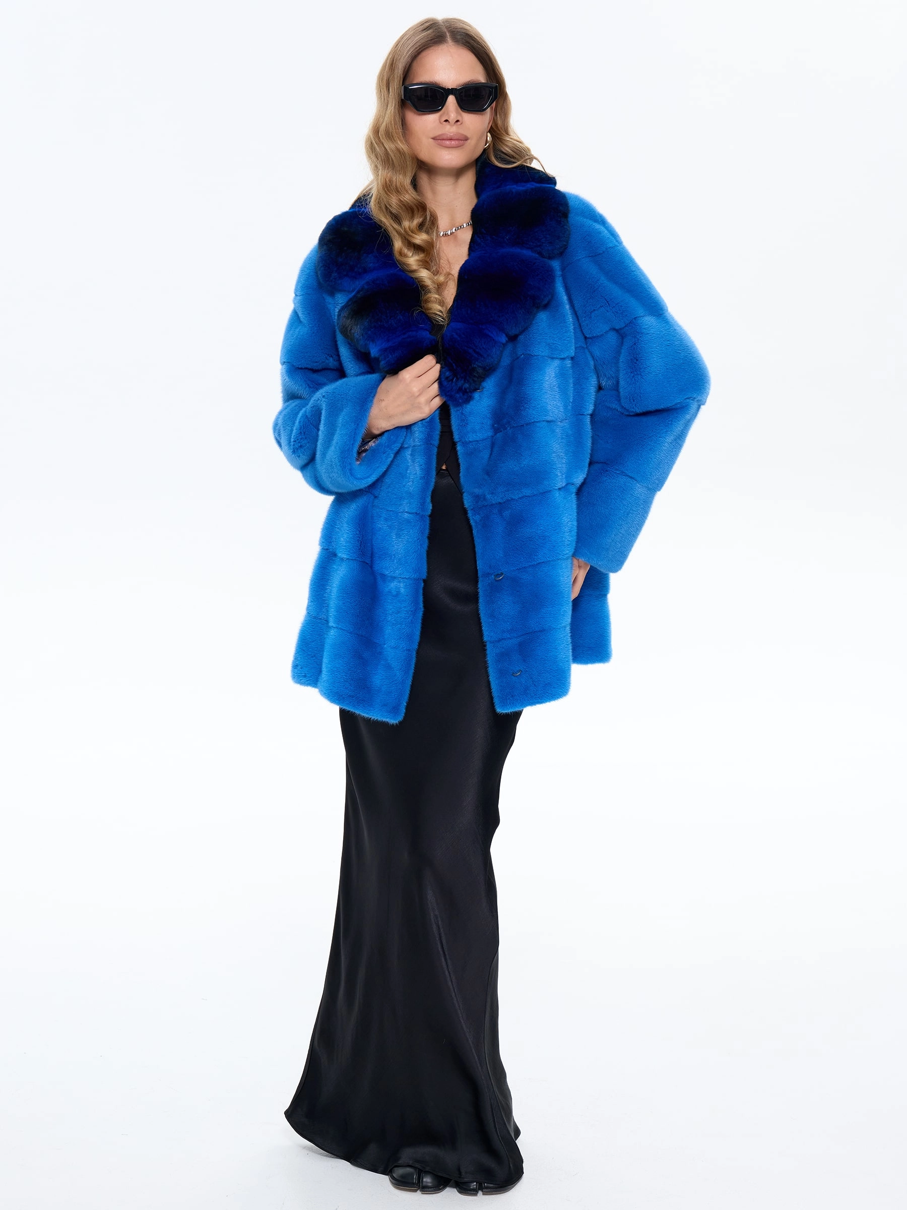 Товар голубая норковая шуба с шиншилой 2а, размер 54, артикул 65460 выполнен из мех норки с застежкой клипсы. Рассчитан на сезон: зима. Длина изделия 73 см, силуэт прямой.