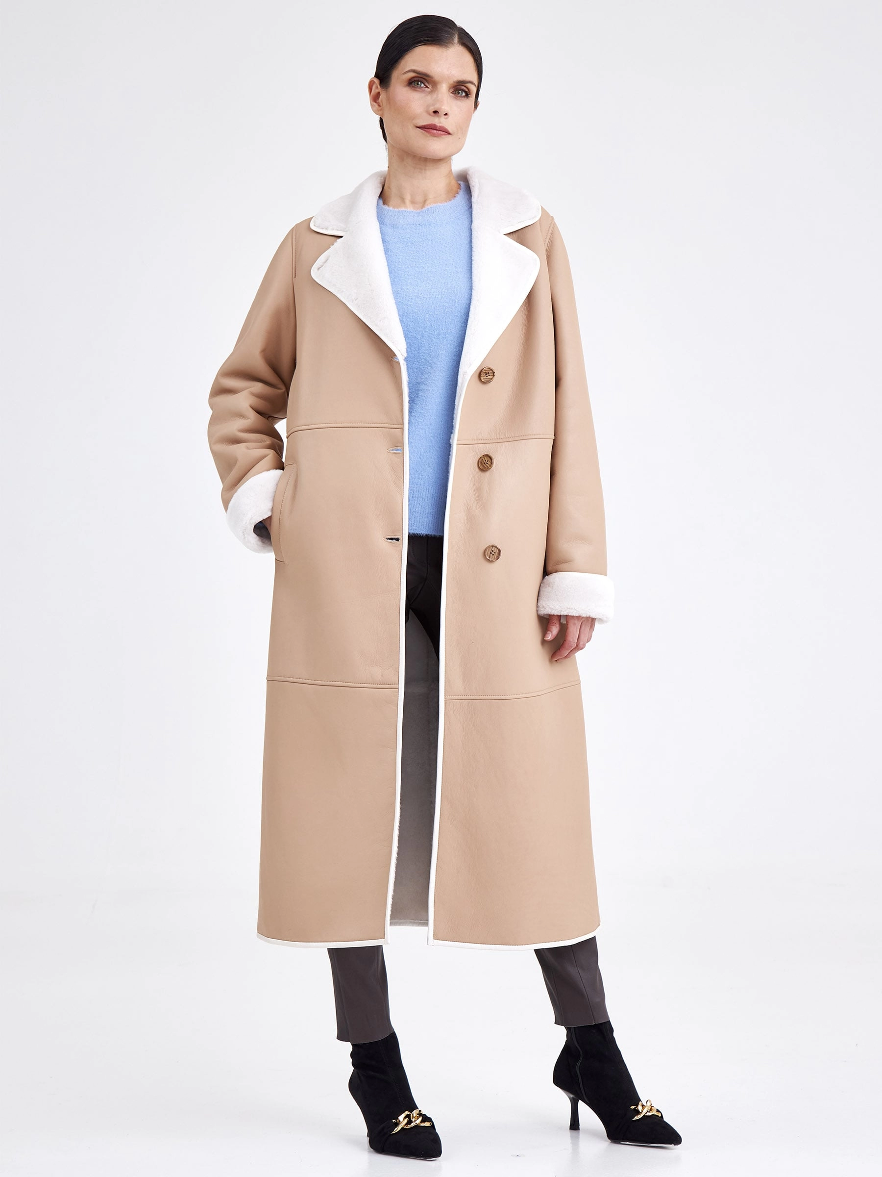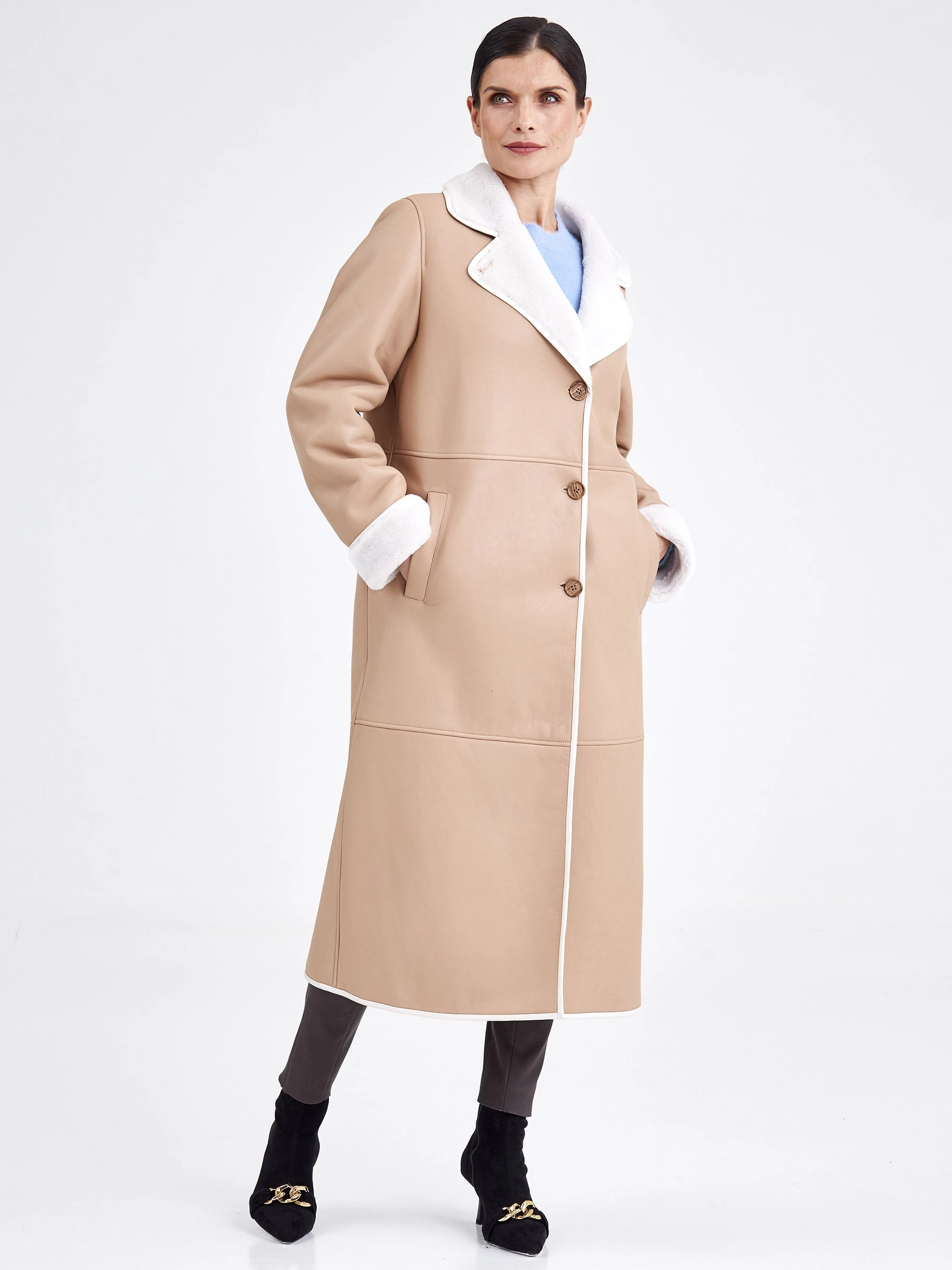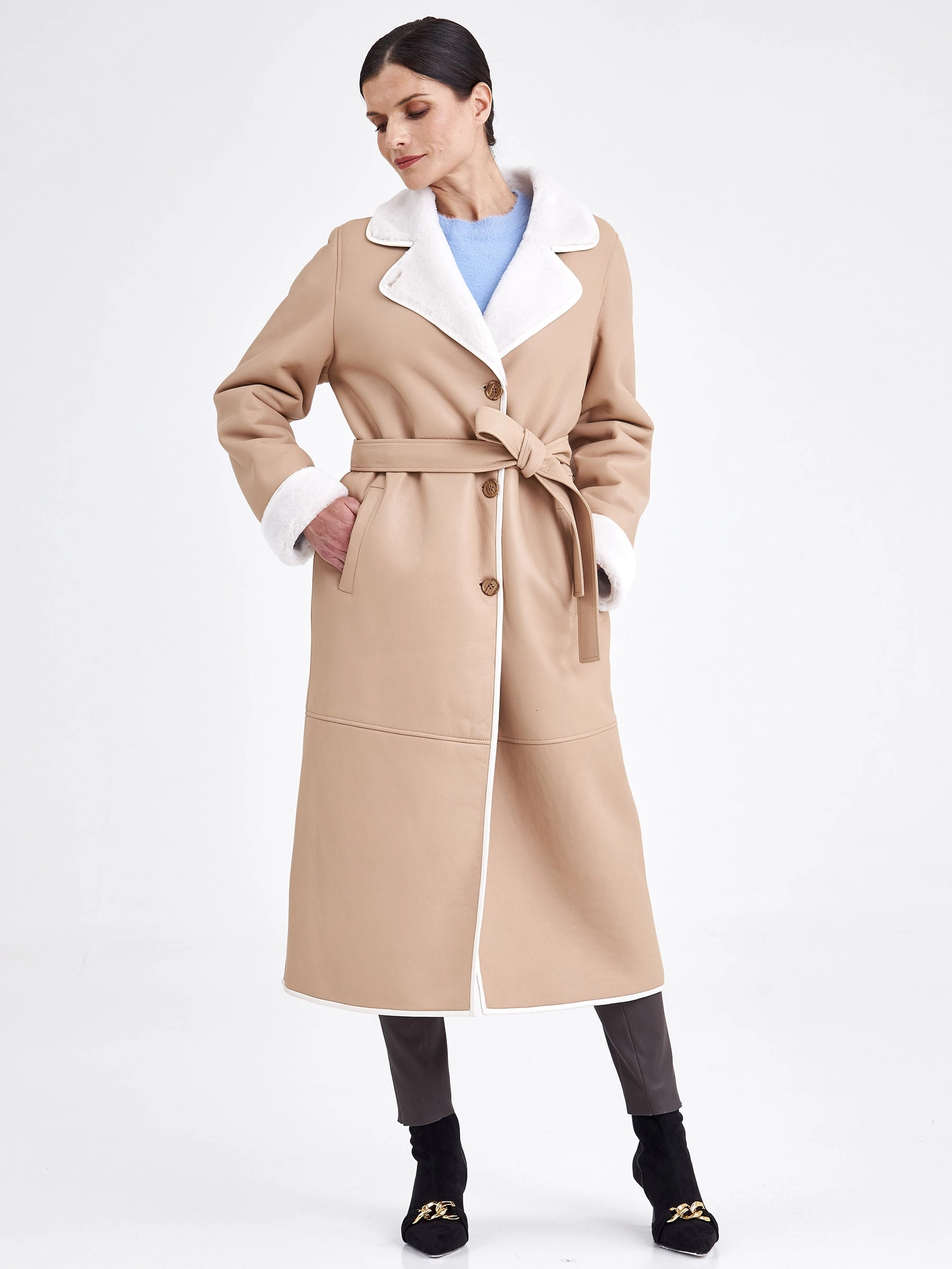 Это строгое и лаконичное пальто из овчины длиной свыше 90 см выполнено из нежной овчины ягнят с максимально густым мехом, что гарантирует отличное тепло. Прямой крой и застёжка на пуговицы обеспечивают безупречную посадку, а английский воротник и борт подчёркнуты тонким кожаным кантом — без лишнего декора, чтобы на первый план вышли качество и комфорт. Длинный кожаный пояс позволяет легко менять силуэт. Совет стилиста: это пальто — образец «тихой роскоши»: сочетайте его с кашемировым монокомплектом, шёлковым платьем-футляром или прямыми шерстяными брюками для безупречного делового или вечернего образа, используя пояс, чтобы акцентировать талию, а аксессуары выбирайте сдержанные и безупречного качества — гладкую кожаную сумку, перчатки и ботильоны на тонком каблуке в единой цветовой гамме.
