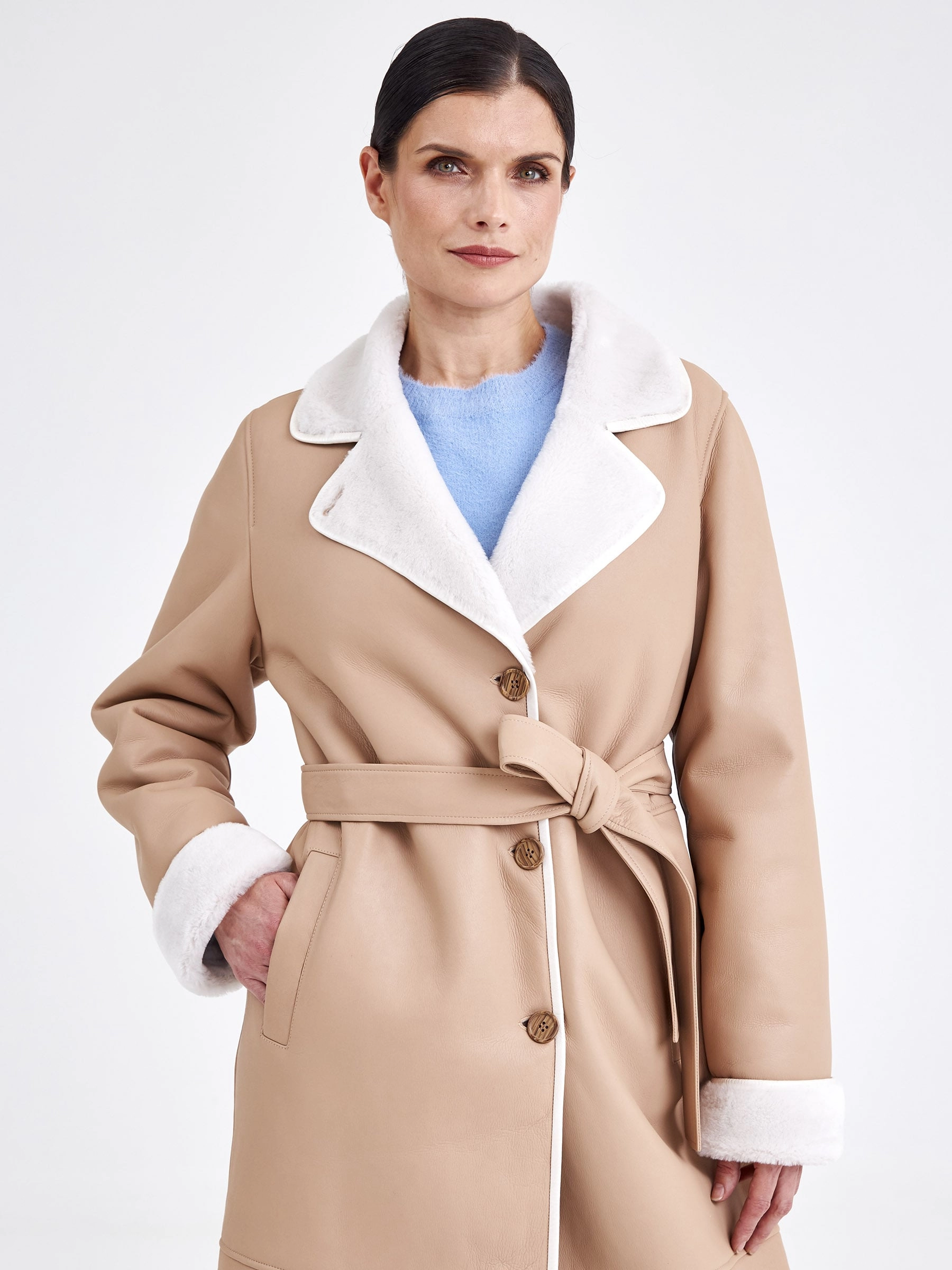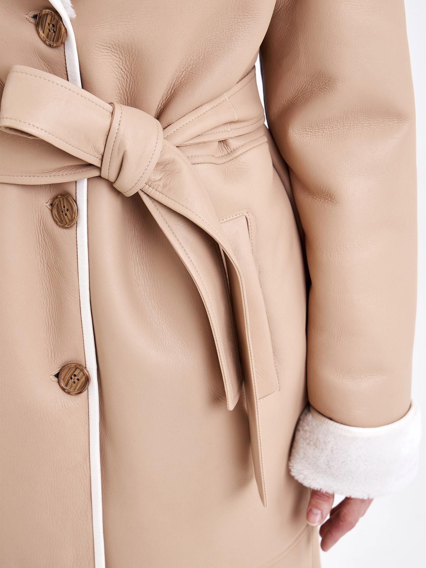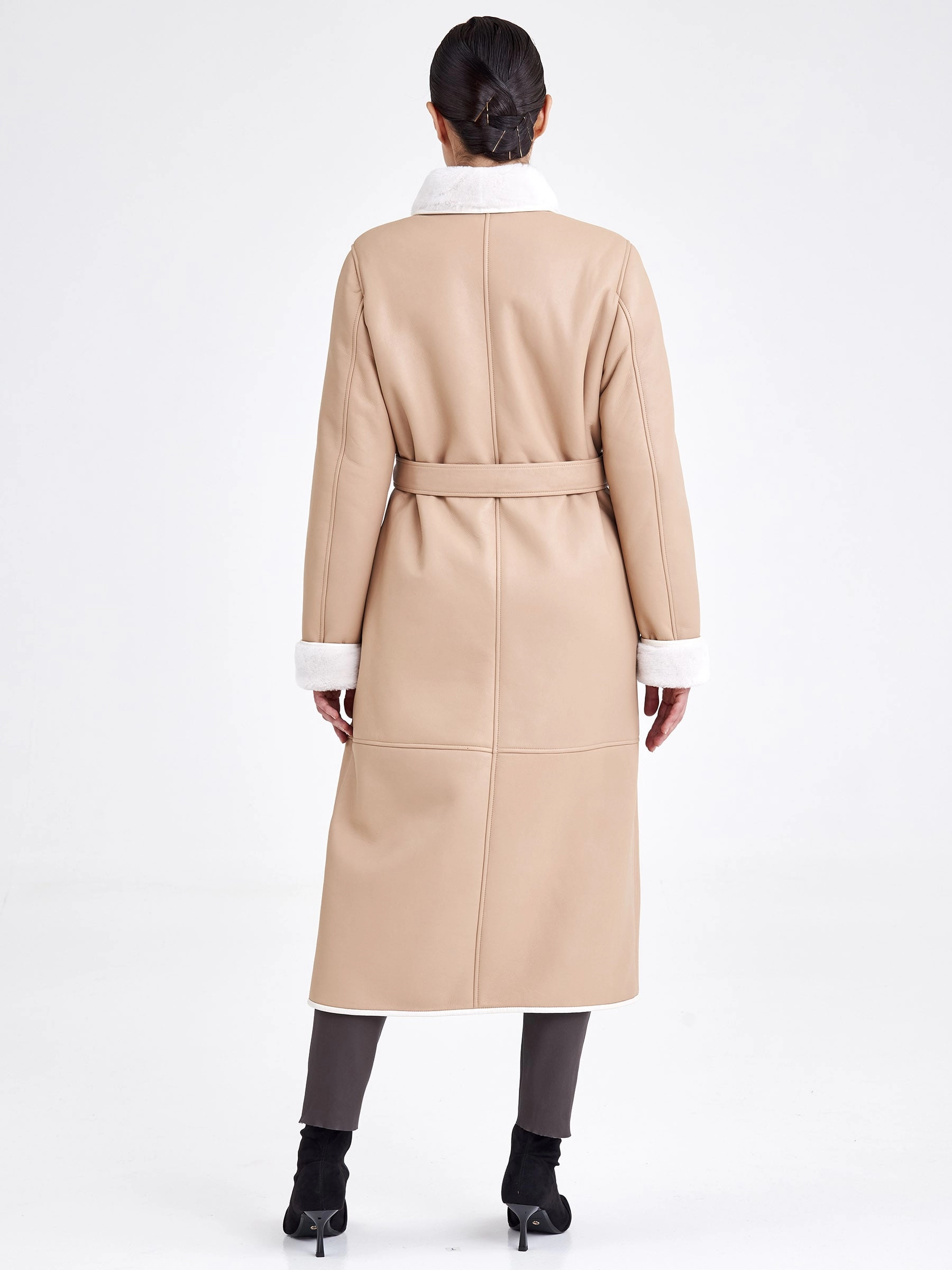 Это строгое и лаконичное пальто из овчины длиной свыше 90 см выполнено из нежной овчины ягнят с максимально густым мехом, что гарантирует отличное тепло. Прямой крой и застёжка на пуговицы обеспечивают безупречную посадку, а английский воротник и борт подчёркнуты тонким кожаным кантом — без лишнего декора, чтобы на первый план вышли качество и комфорт. Длинный кожаный пояс позволяет легко менять силуэт. Совет стилиста: это пальто — образец «тихой роскоши»: сочетайте его с кашемировым монокомплектом, шёлковым платьем-футляром или прямыми шерстяными брюками для безупречного делового или вечернего образа, используя пояс, чтобы акцентировать талию, а аксессуары выбирайте сдержанные и безупречного качества — гладкую кожаную сумку, перчатки и ботильоны на тонком каблуке в единой цветовой гамме.