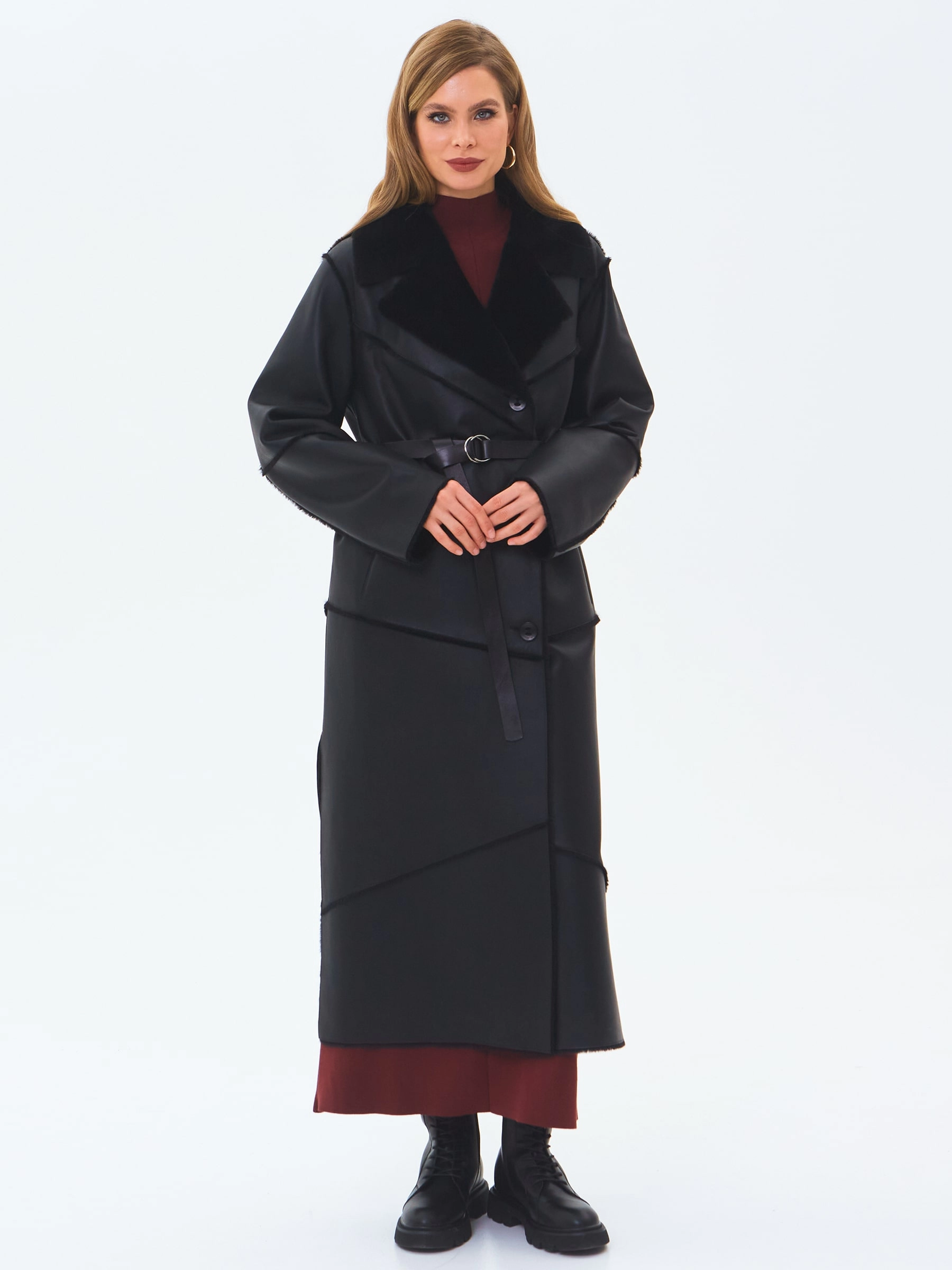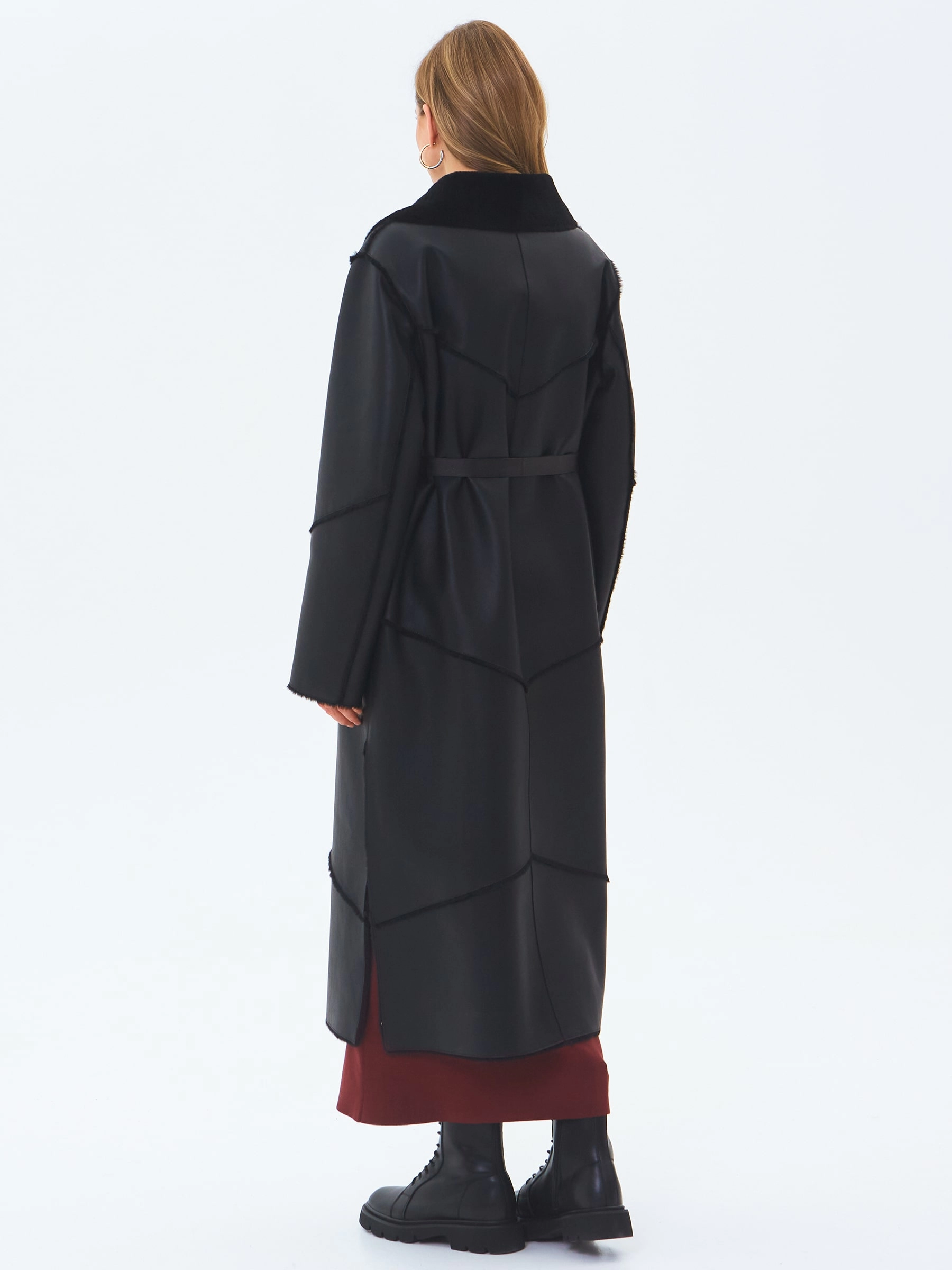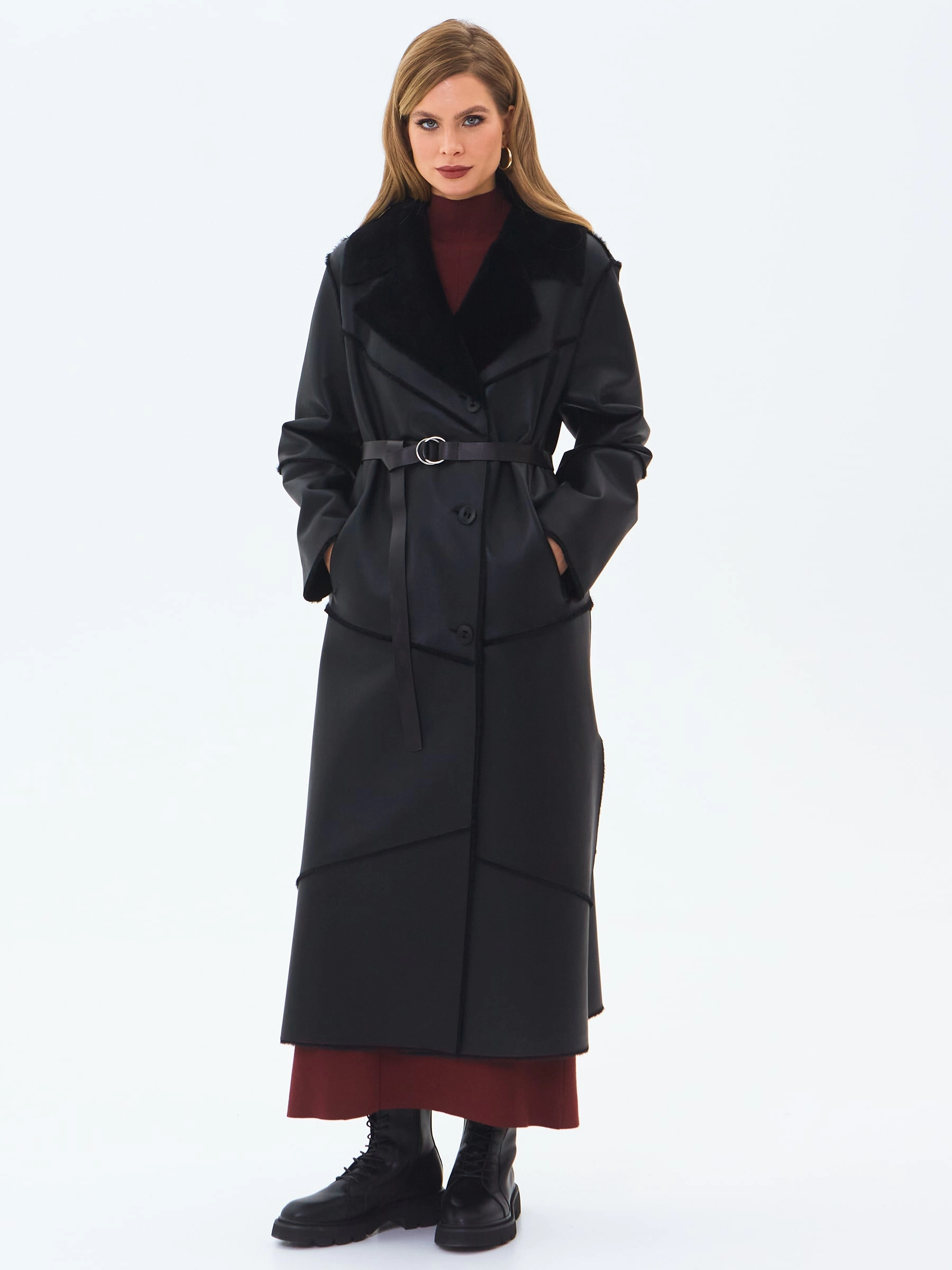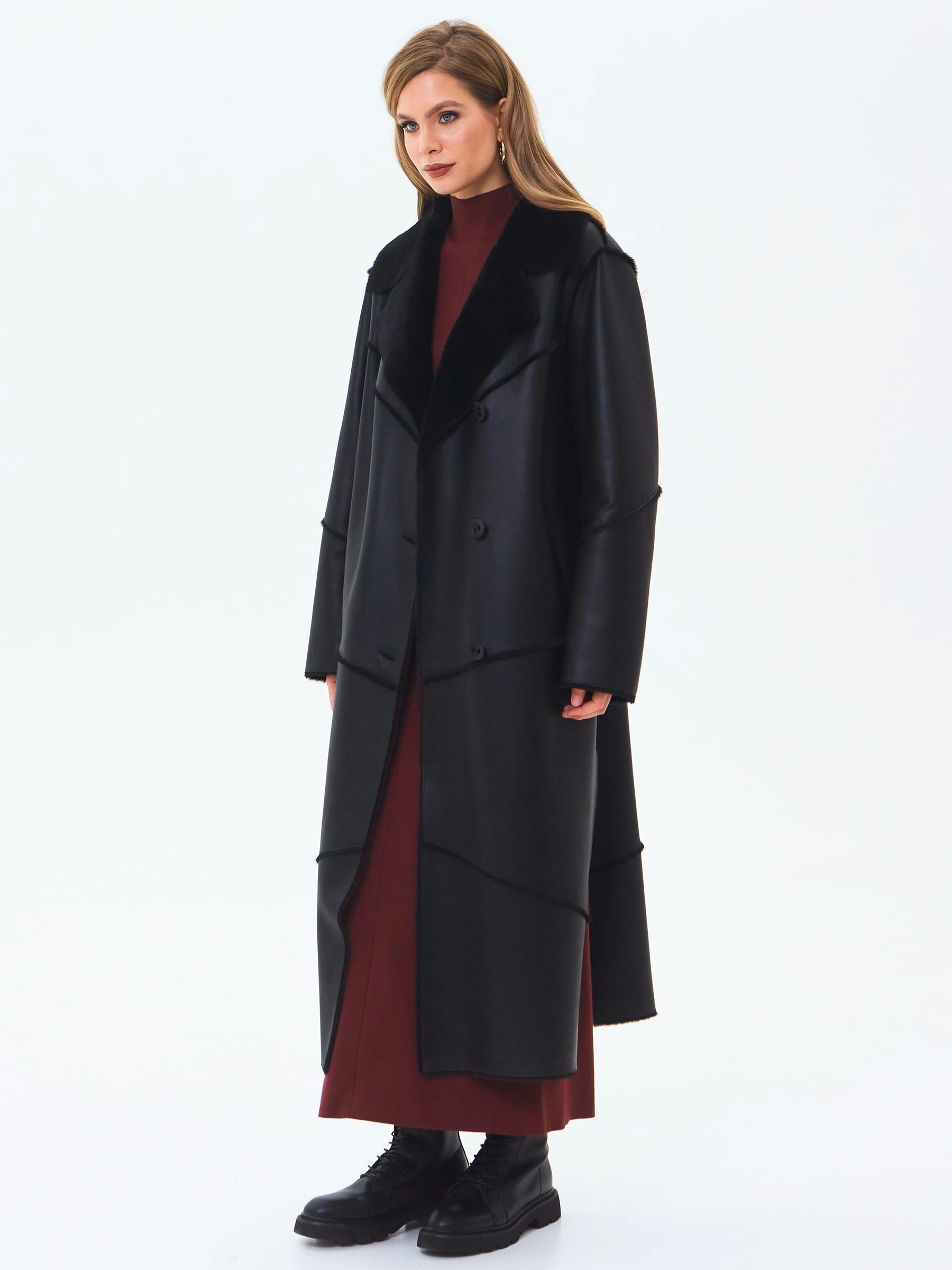 Длинное классическое женское полупальто из овчины премиум-класса черного цвета — воплощение вневременной элегантности и безупречного качества: модель с вывернутыми наружу швами выполнили из бережно выделанной овчины «мерино», где внутри — мягкий теплый мех, а снаружи — гладкая благородная поверхность под кожу, благодаря чему изделие получилось максимально теплым, но при этом легким и комфортным. Прямой свободный крой длиной 125 см со спущенным плечом обеспечивает безупречную посадку, классический английский воротник добавляет статусности, а два врезных боковых кармана усиливают практичность; застежка фиксируется кожаным поясом, позволяющим при желании подчеркнуть линию талии, а нарочитая лаконичность и отсутствие лишнего декора делают модель универсальной и всегда востребованной. Совет стилиста: минималистичный дизайн и классический крой делают это полупальто идеальной инвестиционной вещью — носите его с чем угодно: от строгих костюмов и платьев-футляров до повседневных джинсов и свитеров крупной вязки, позво