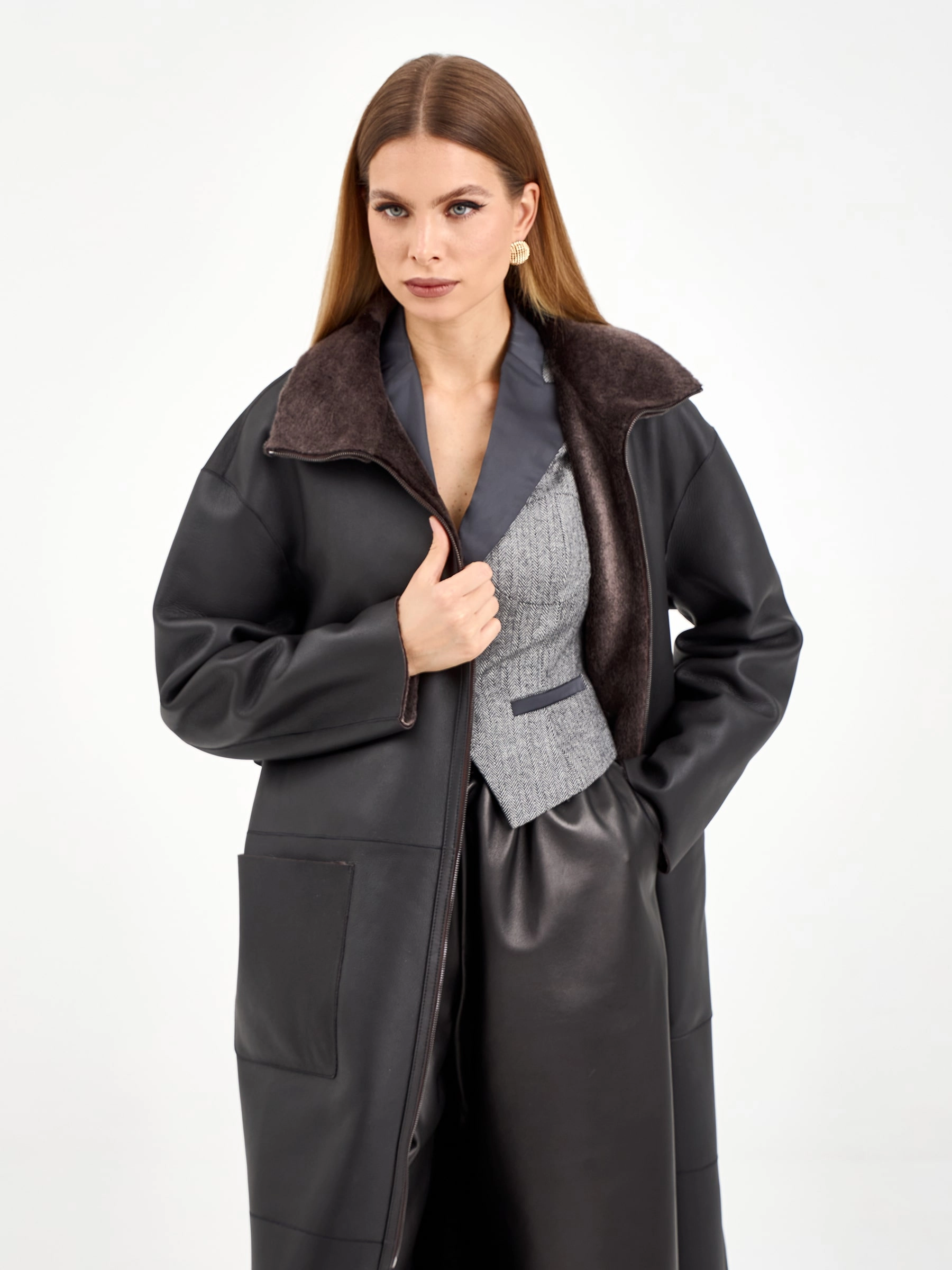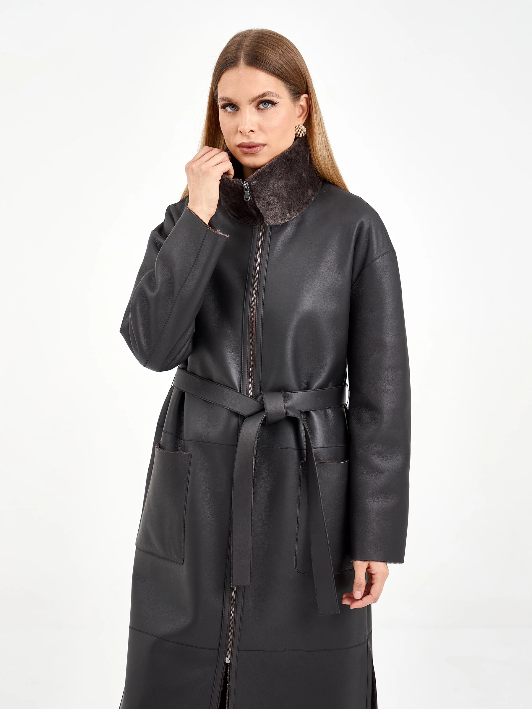Товар коричневая длинная женская дубленка 2071, размер 48, артикул 64990 выполнен из овчина "мерино" с застежкой молния. Рассчитан на сезон: зима. Длина изделия 120 см, силуэт прямой.