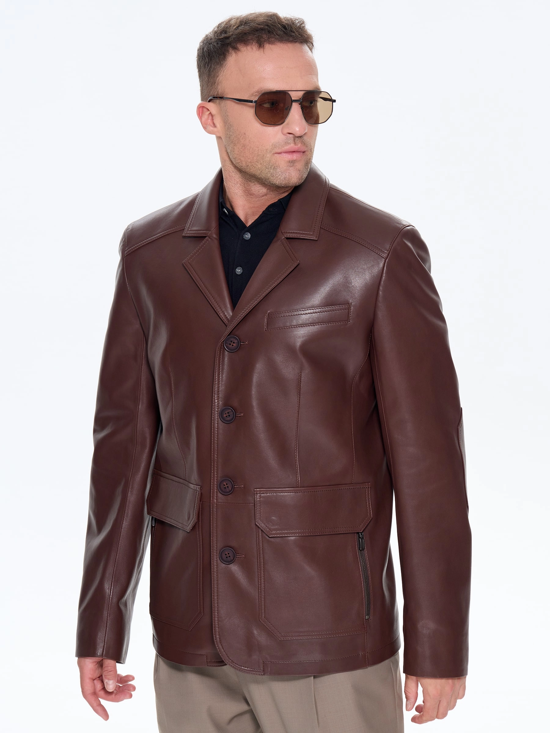 Товар коричневый мужской кожаный пиджак 530, размер 48, артикул 29770 выполнен из натуральной кожи с застежкой пуговицы. Рассчитан на сезон: весна-лето. Длина изделия 51-74 см, силуэт полуприлегающий.