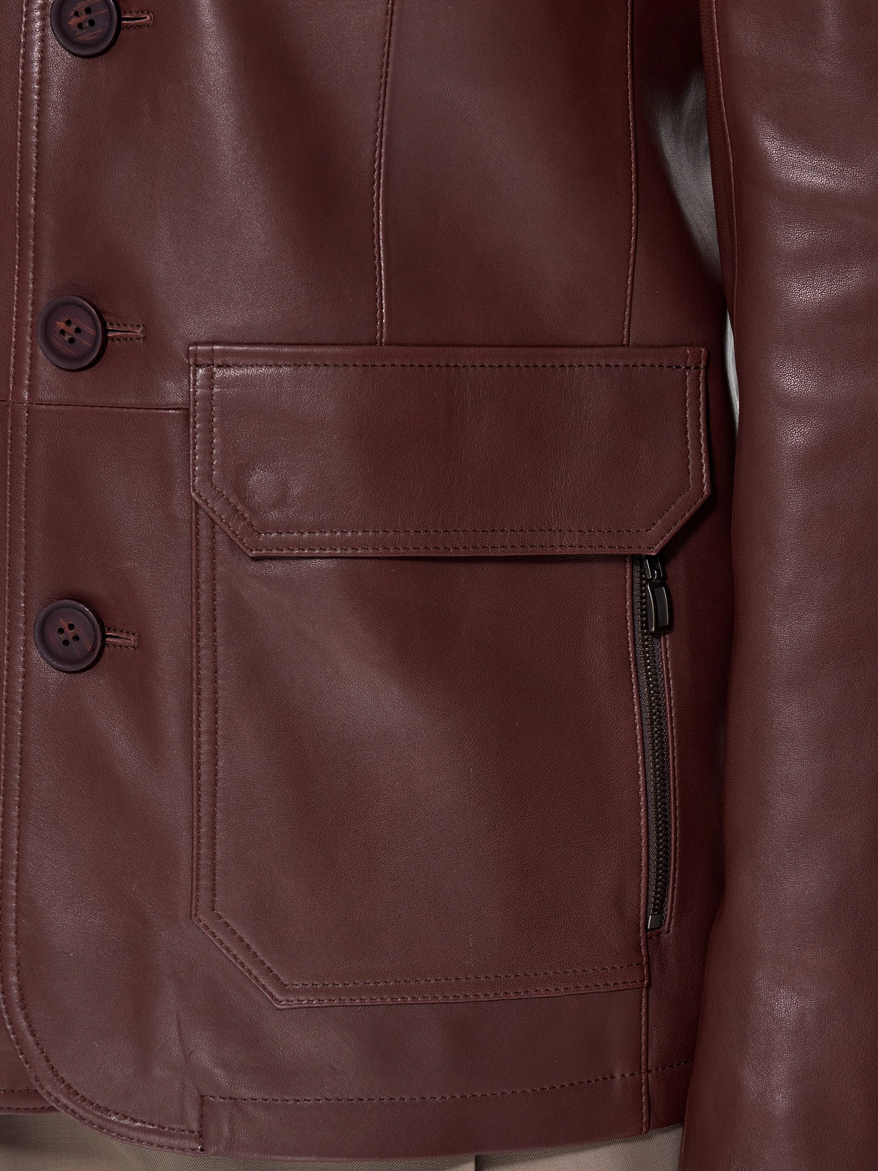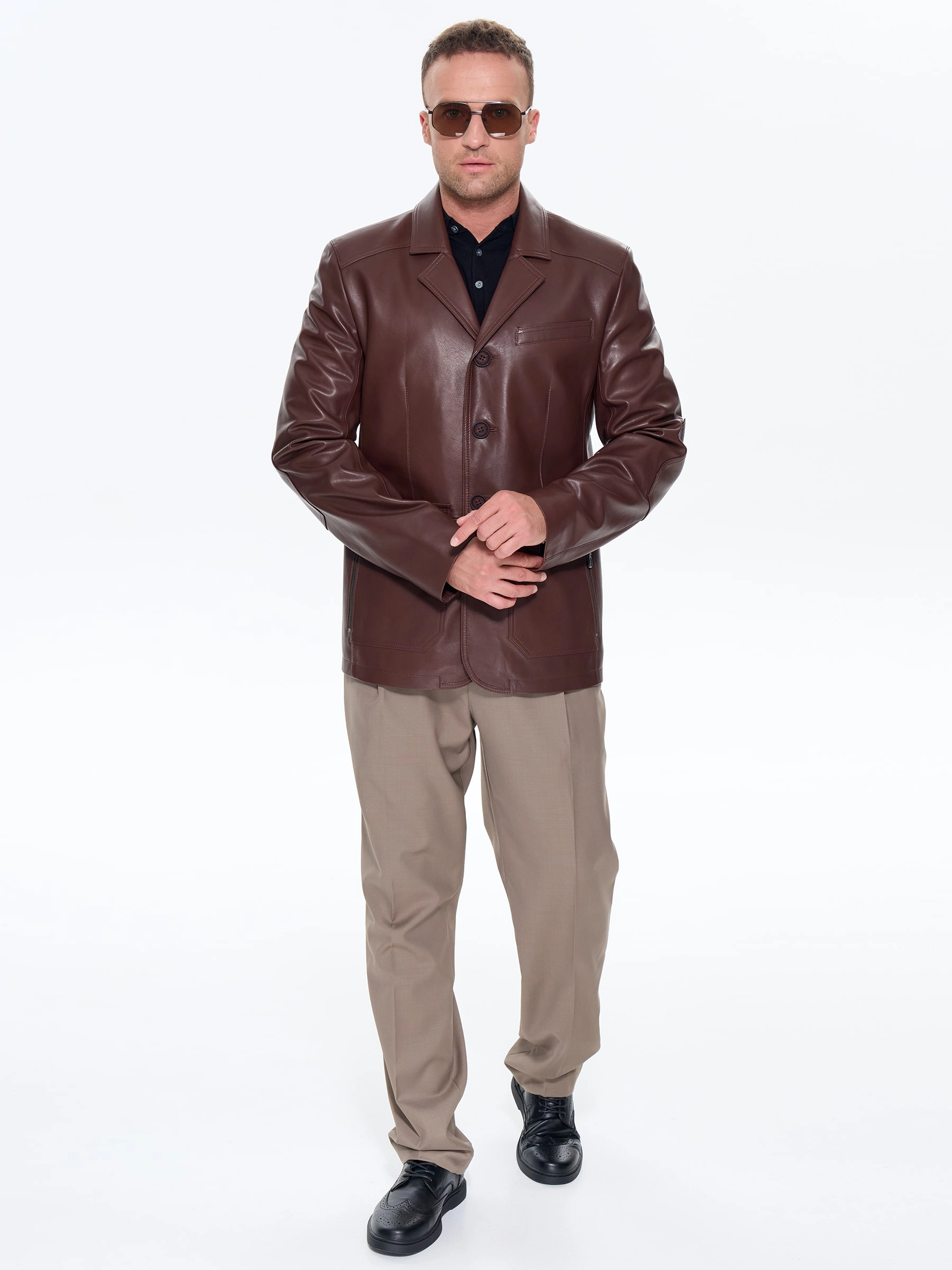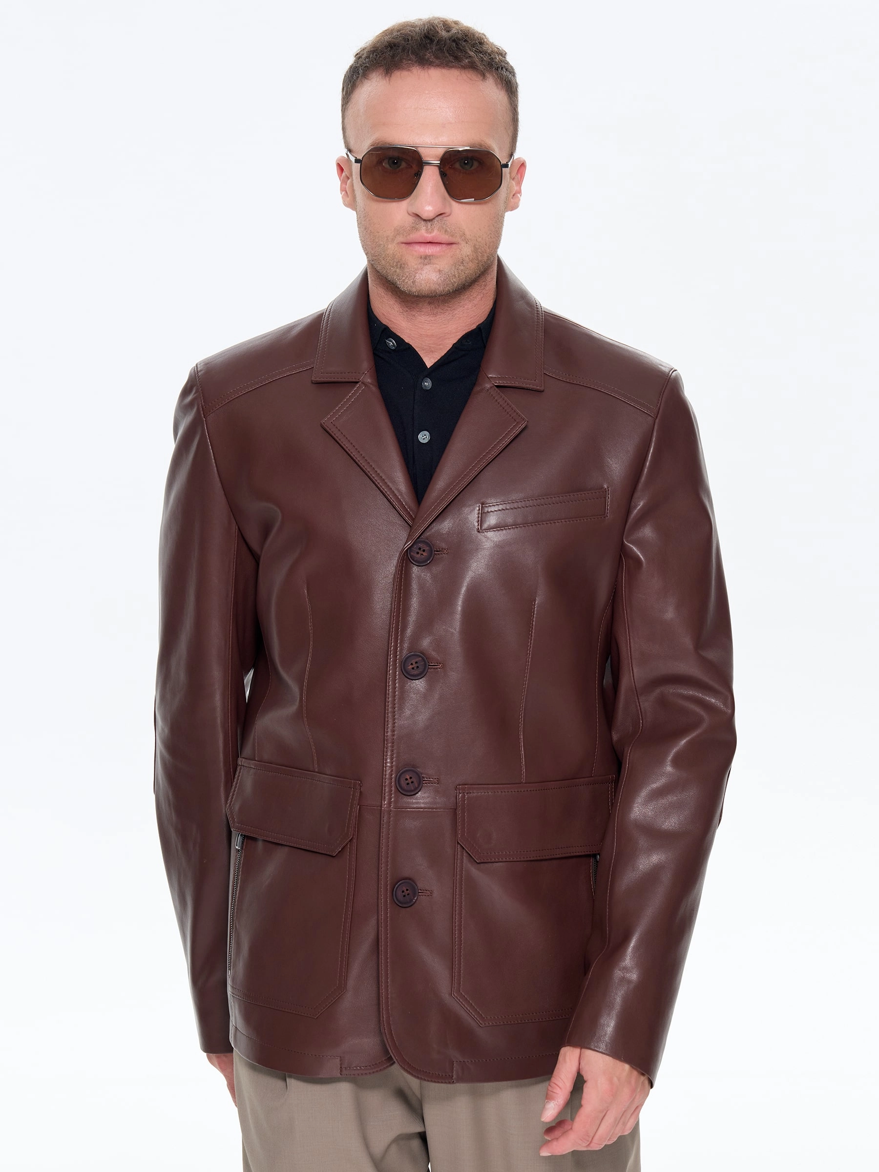 Коричневый кожаный пиджак на пике популярности. Он прекрасно сочетается не только с брюками, но и с любыми джинсами. Профессиональный крой, идеальная посадка по фигуре. Приталенный силуэт. Застежка пуговицы. Элегантности к модели добавляют крупные накладные карманы со стеганным рисунком.