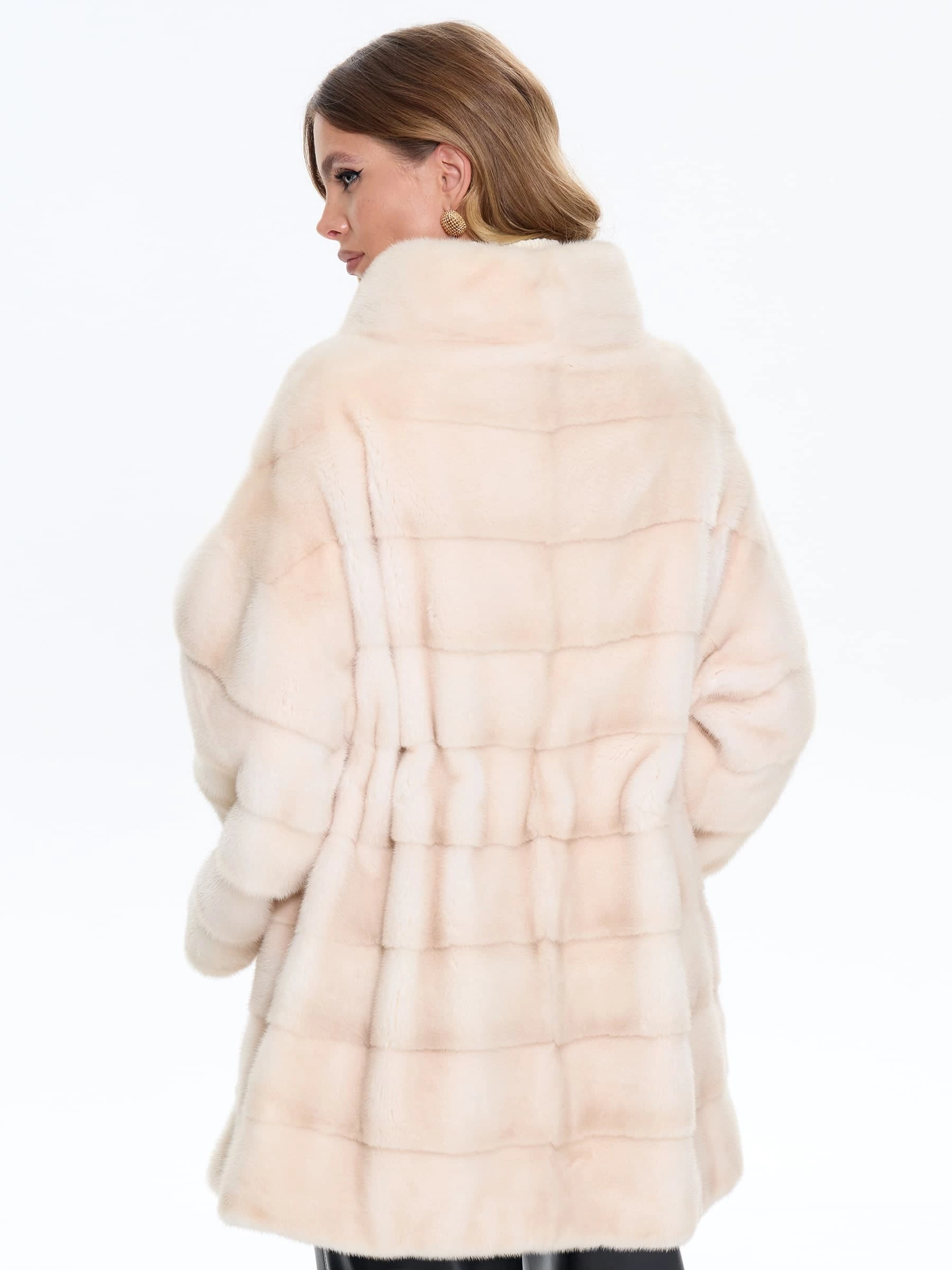 Короткую шубу прямого покроя выполнили из элитной натуральной норки с густым глянцевым ворсом и равномерным окрасом в диагональной раскладке. Тщательная ручная отборка шкурок гарантирует идеальную мягкость. Спущенный крой рукавов создает модный силуэт, который визуально смягчает линию плеч, добавляет образу лёгкости и не стесняет движения, что делает модель идеальной для вождения и активных прогулок. Воротник-стойка подчёркивает шею, создаёт лаконичный контур и прекрасно сочетается с шарфами и объемными аксессуарами. Скрытые клипсы надёжно фиксируют изделие, не повреждая мех и сохраняя чистоту линий. Модель дополнена двумя боковыми карманами и широким кожаным поясом