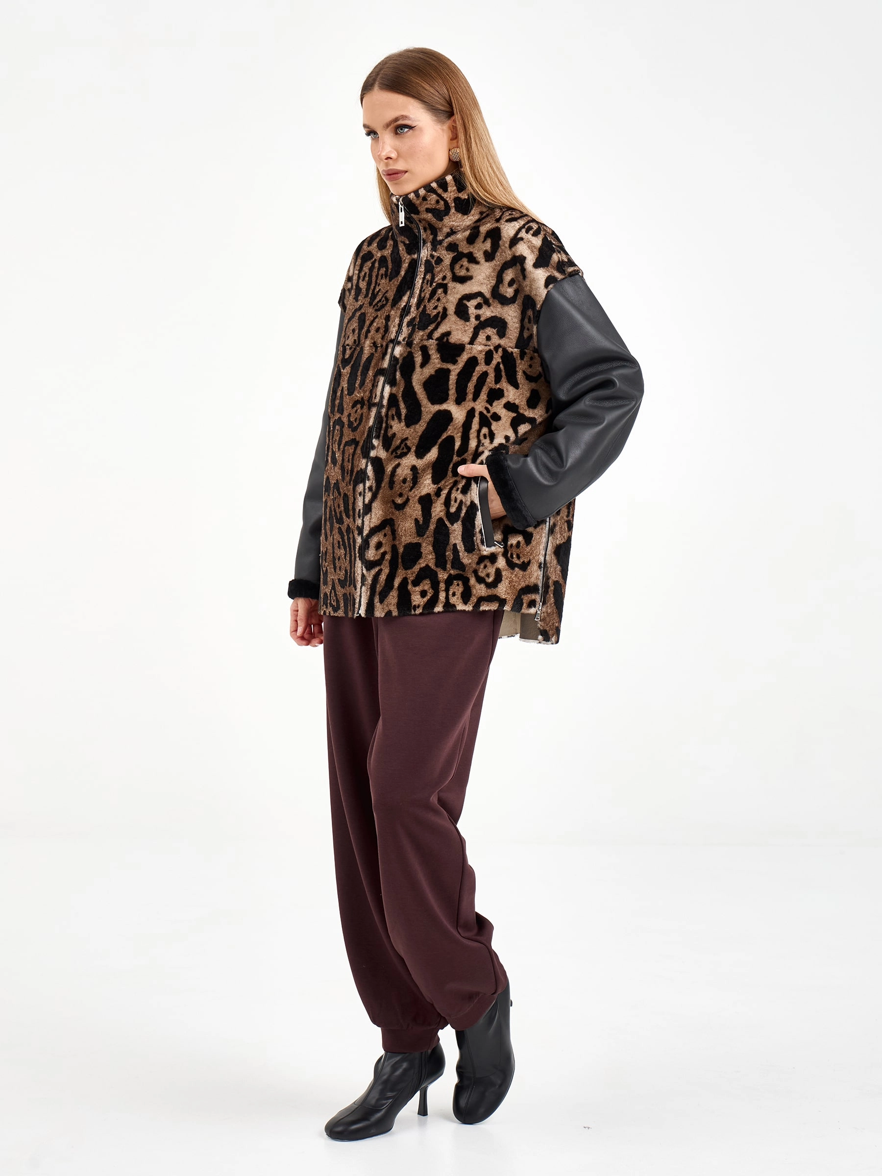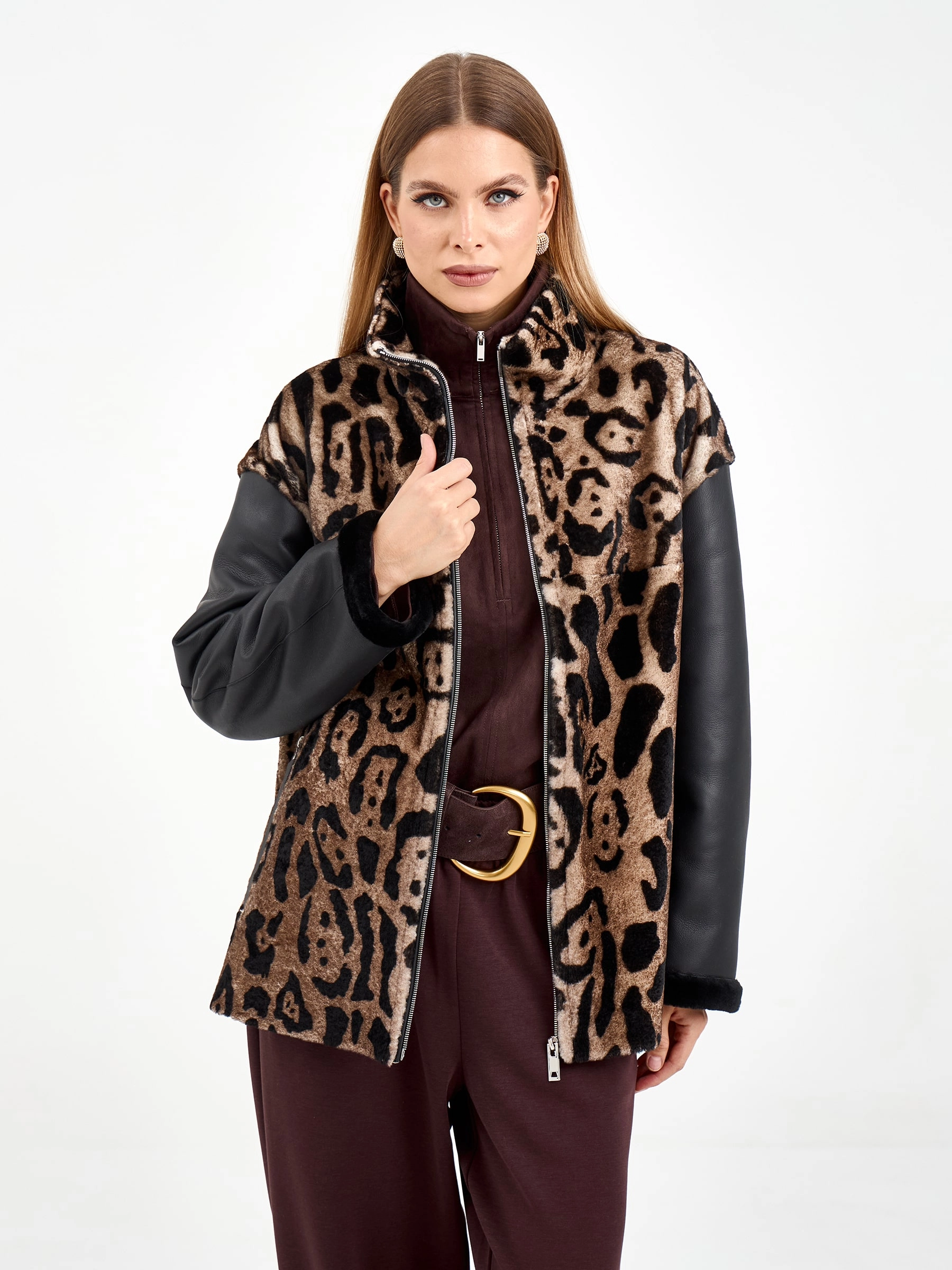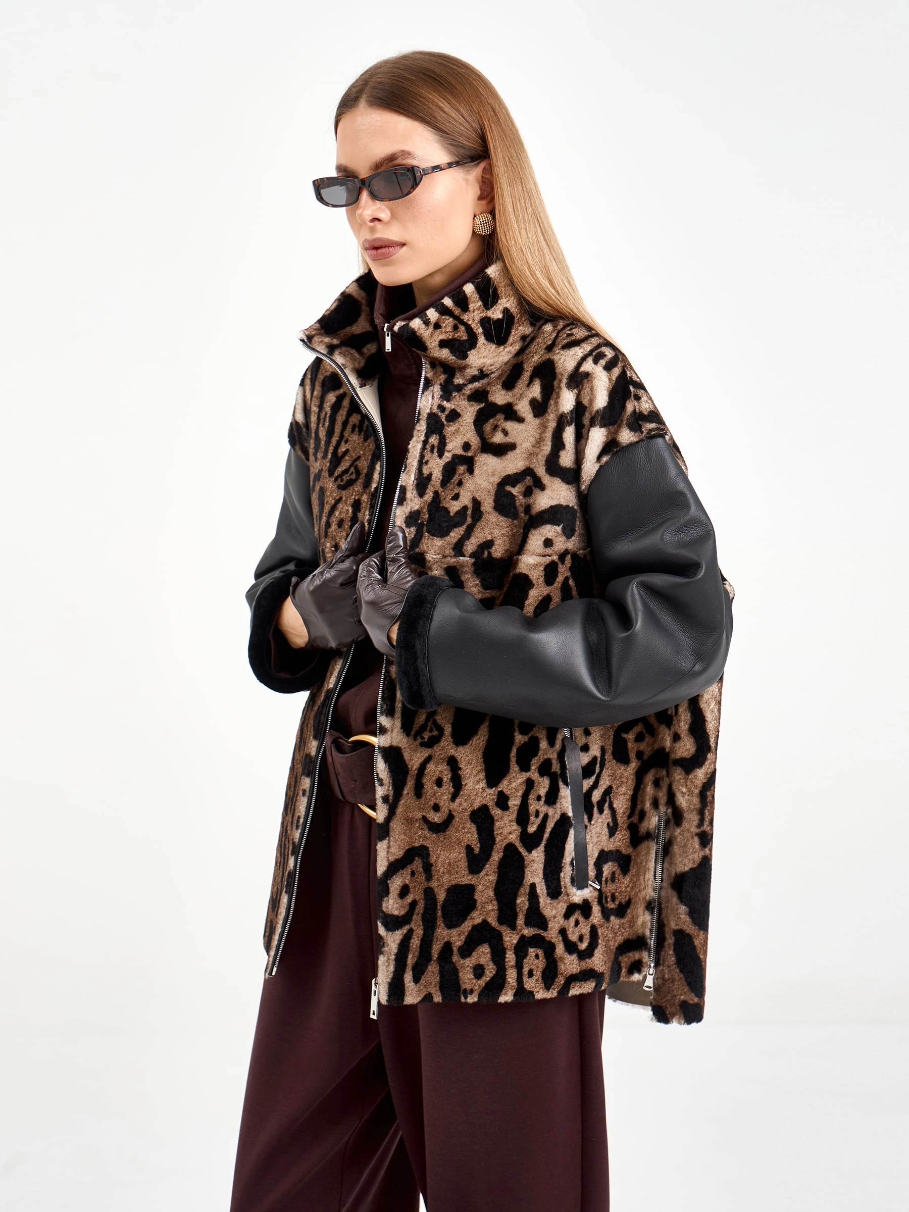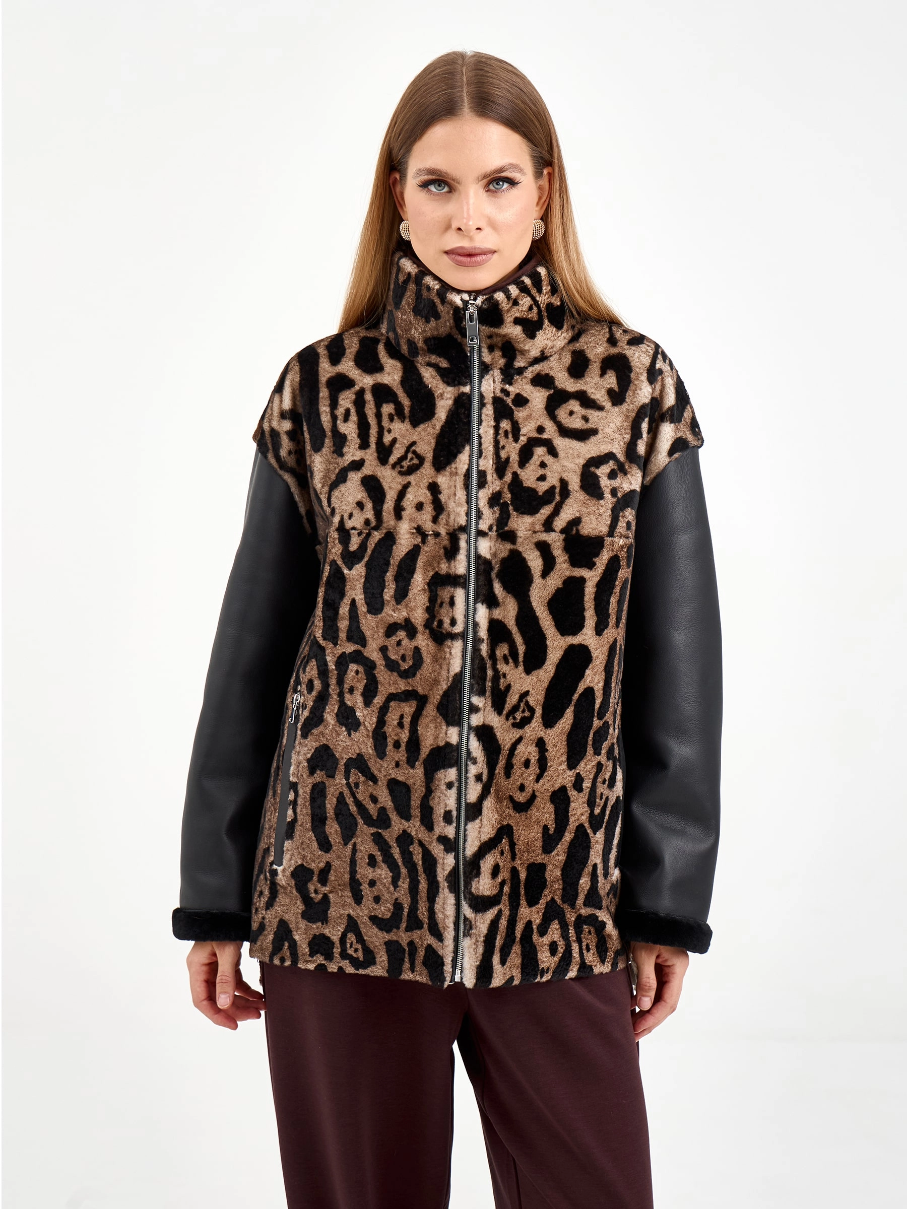 Короткая комбинированная дубленка из овчины мерино с леопардовым принтом и кожаными рукавами. Модель свободного кроя длиной 75 см с воротником-стойкой и спущенным рукавом сочетает смелые текстурные контрасты. Боковые разрезы и врезные карманы застегиваются на молнии, подчеркивая современный дизайн. Стилисты рекомендуют носить с монохромными базовыми вещами — черными узкими джинсами, водолазкой и кожаными ботильонами, чтобы выразительная фактура дубленки стала центром образа. Идеальный выбор для создания смелого городского образа, где дерзкая эстетика встречается с непревзойденным комфортом.