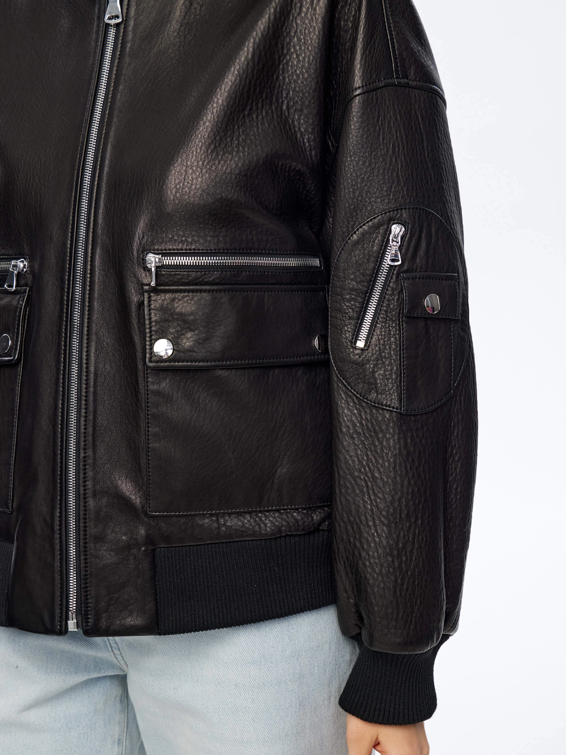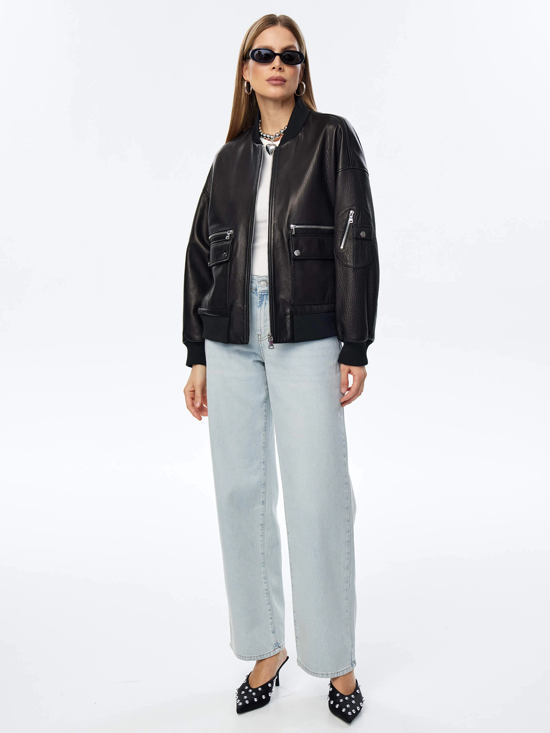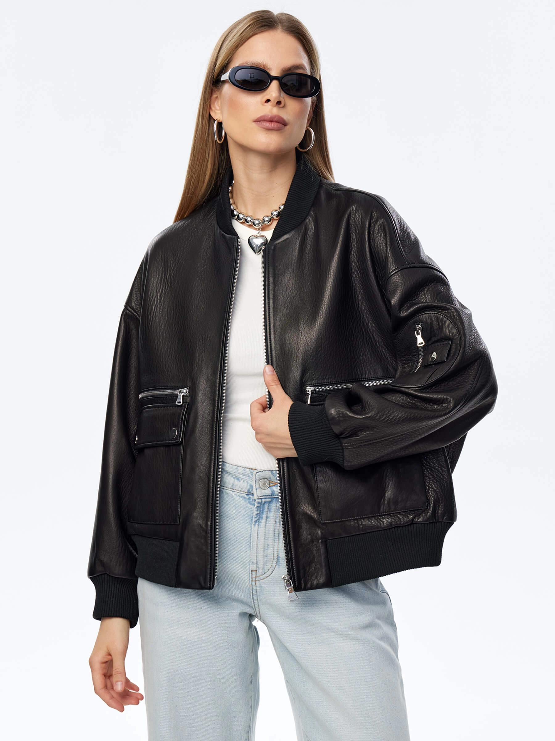 Товар короткая кожаная куртка бомбер для женщин премиум класса 3064, черная, размер 44, артикул 24040 выполнен из натуральной кожи с застежкой молния. Рассчитан на сезон: весна-осень. Длина изделия 60 см, силуэт свободный.