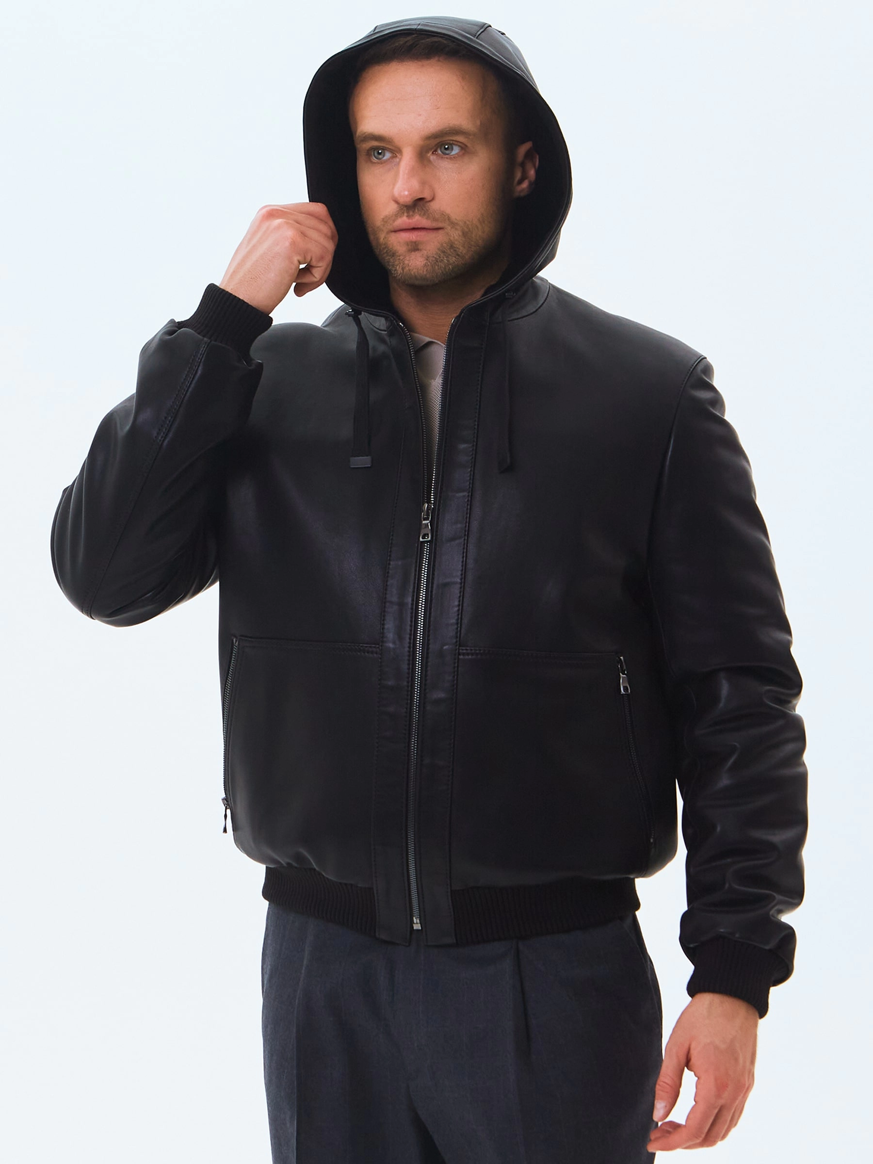 Короткая мужская кожаная дубленка бомбер с капюшоном премиум класса 561мех, черная, размер 48, артикул 71550