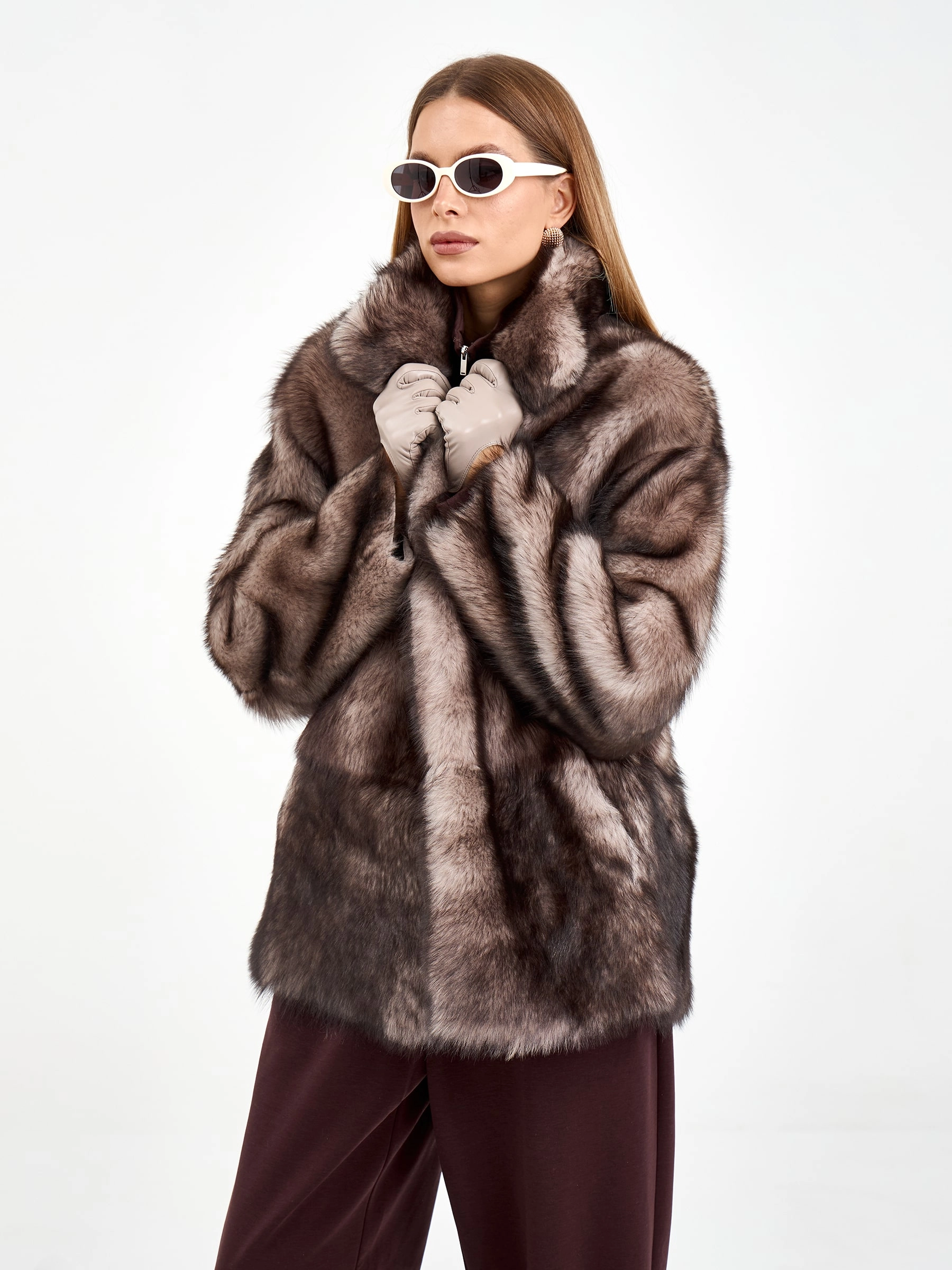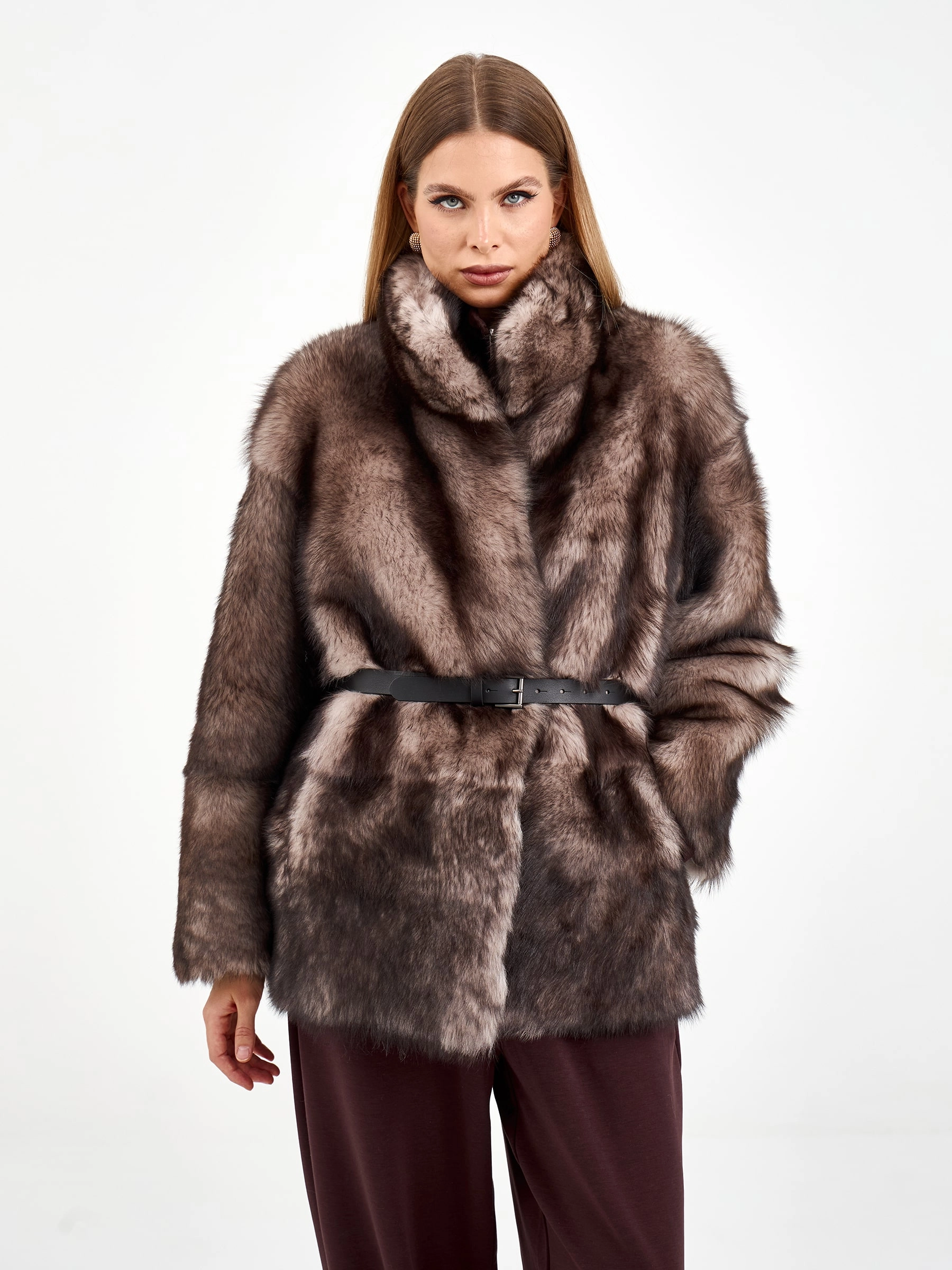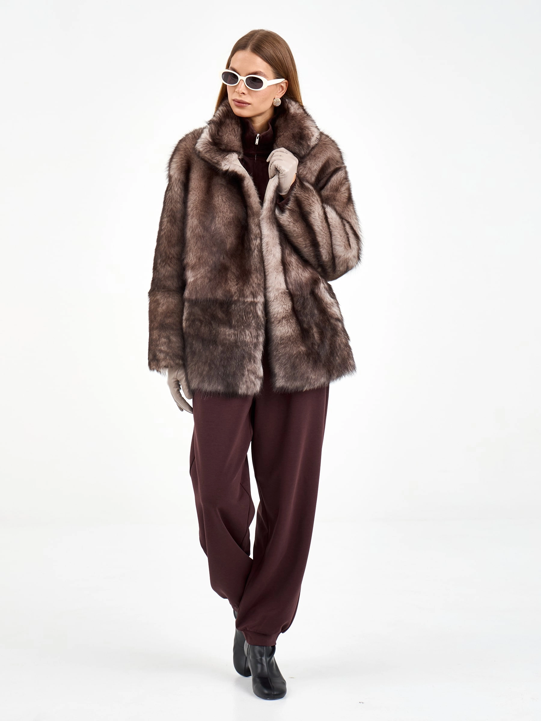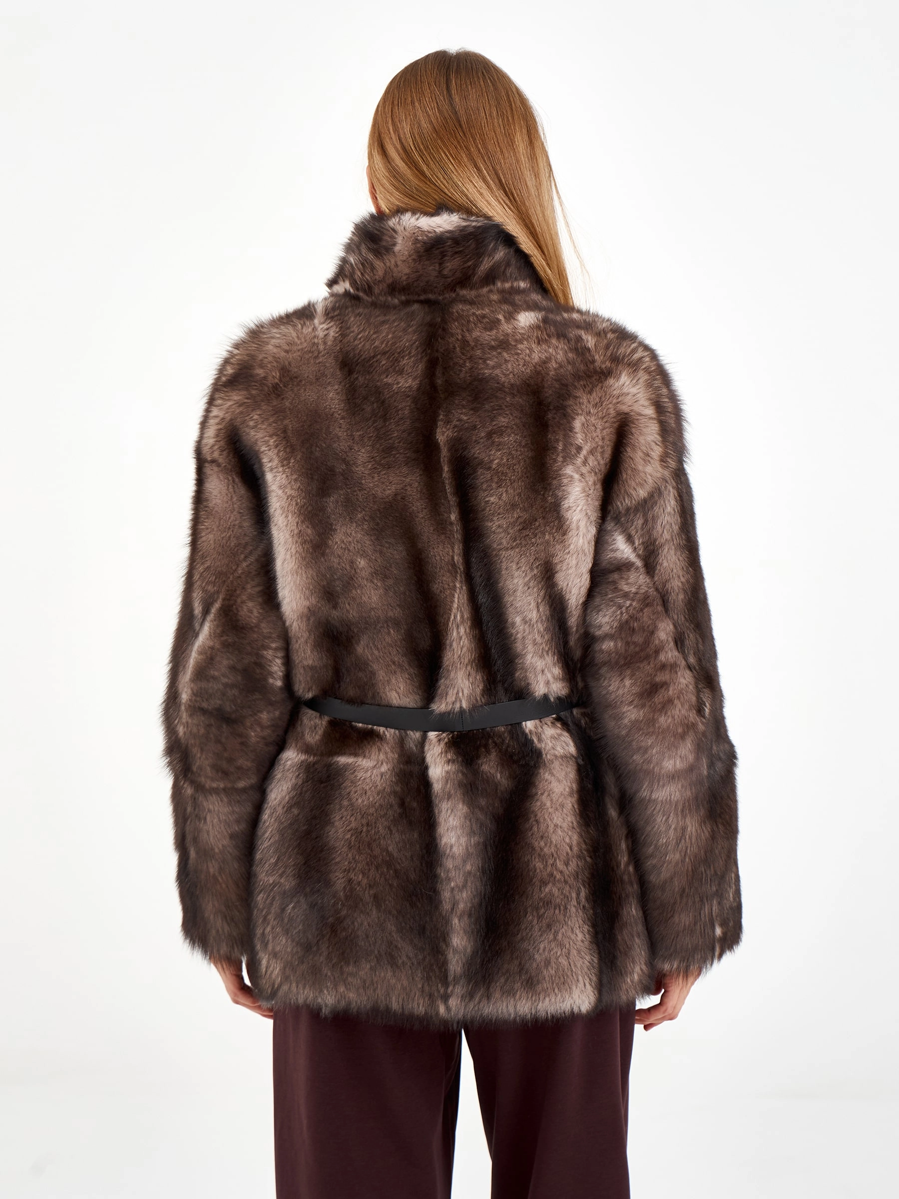 Короткая дубленка свободного кроя из натуральной овчины с удобным воротником-стойкой. Модель длиной 70 см со спущенным рукавом создана для повседневной носки, даря непревзойденный комфорт и чувство стиля. Для создания модного образа наденьте ее с объемным свитером, прямыми джинсами и анкл-ботами.