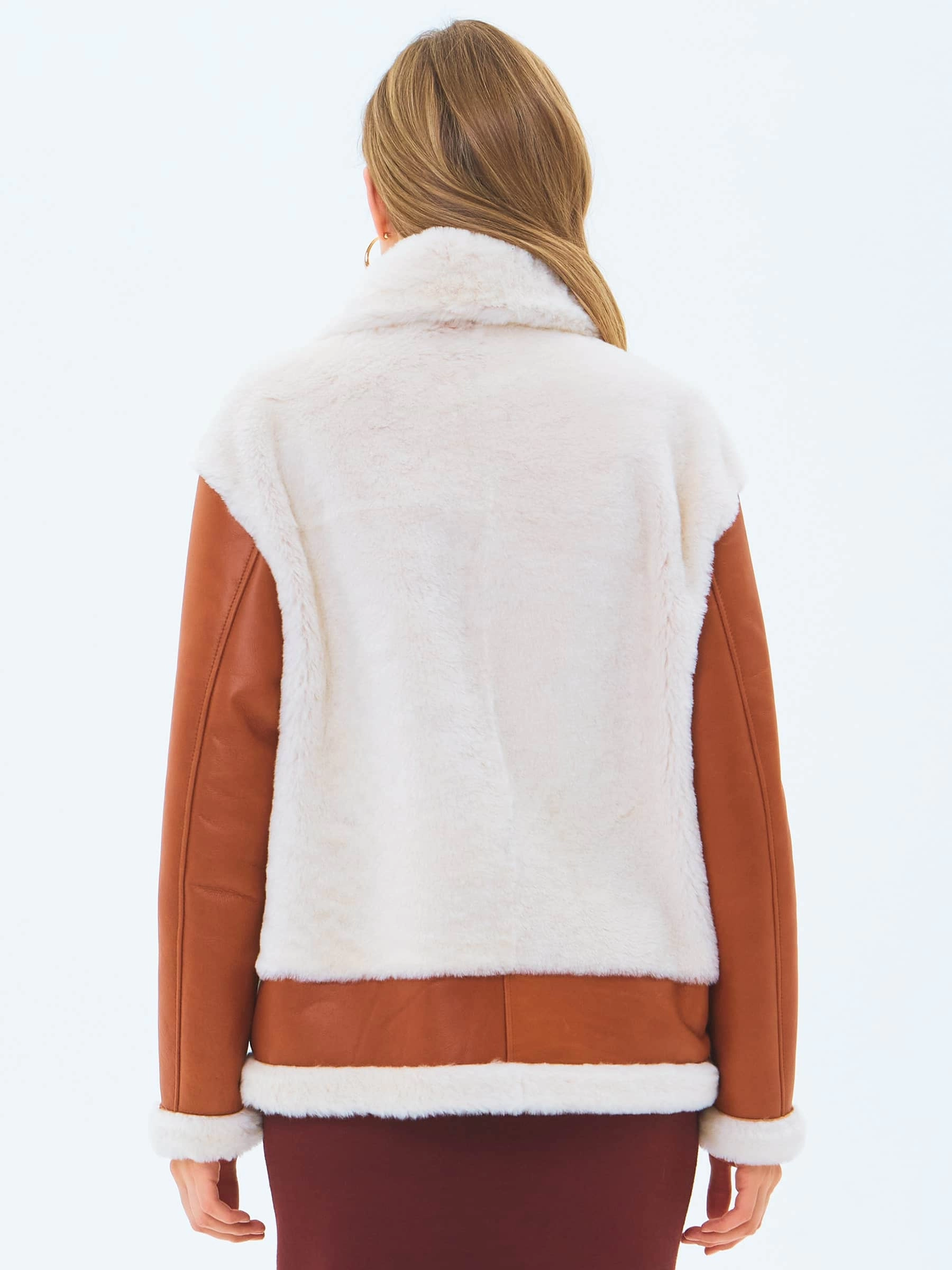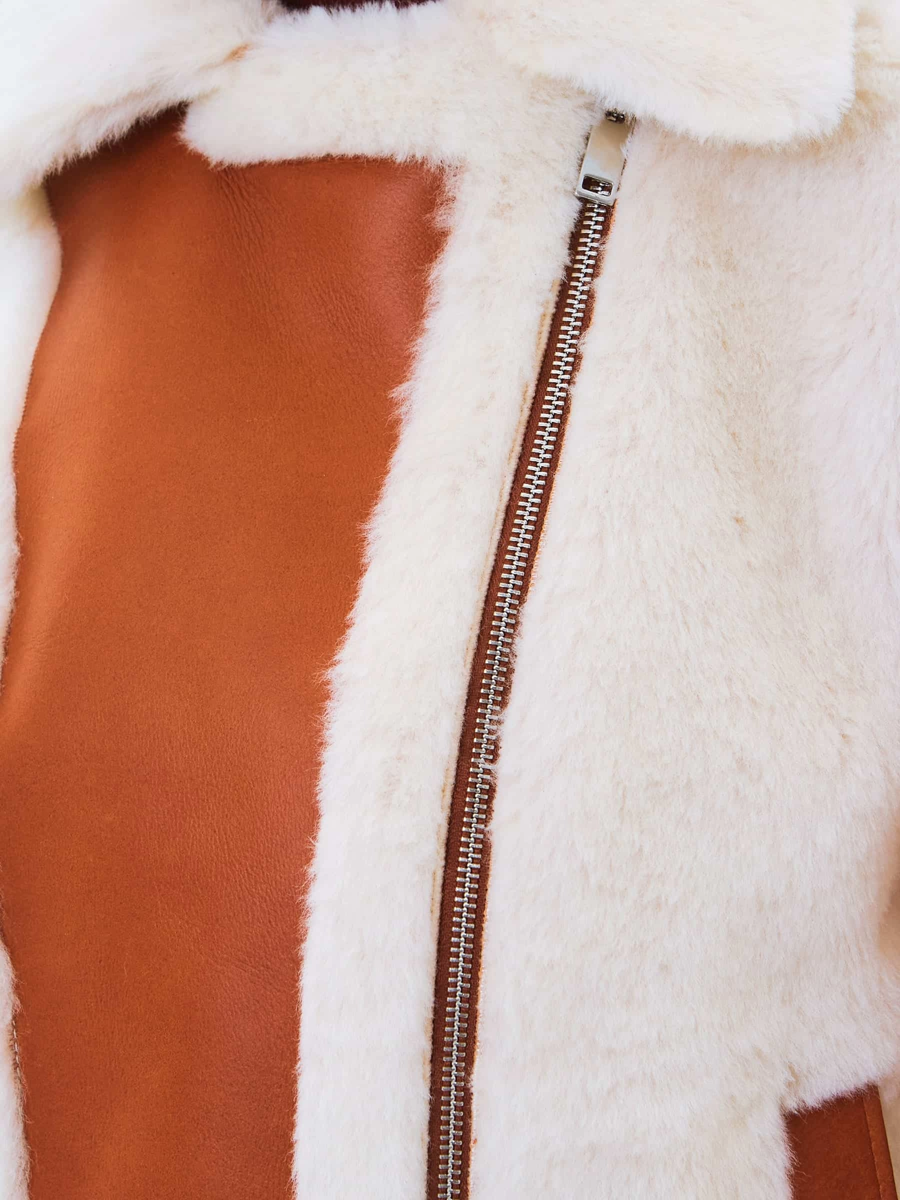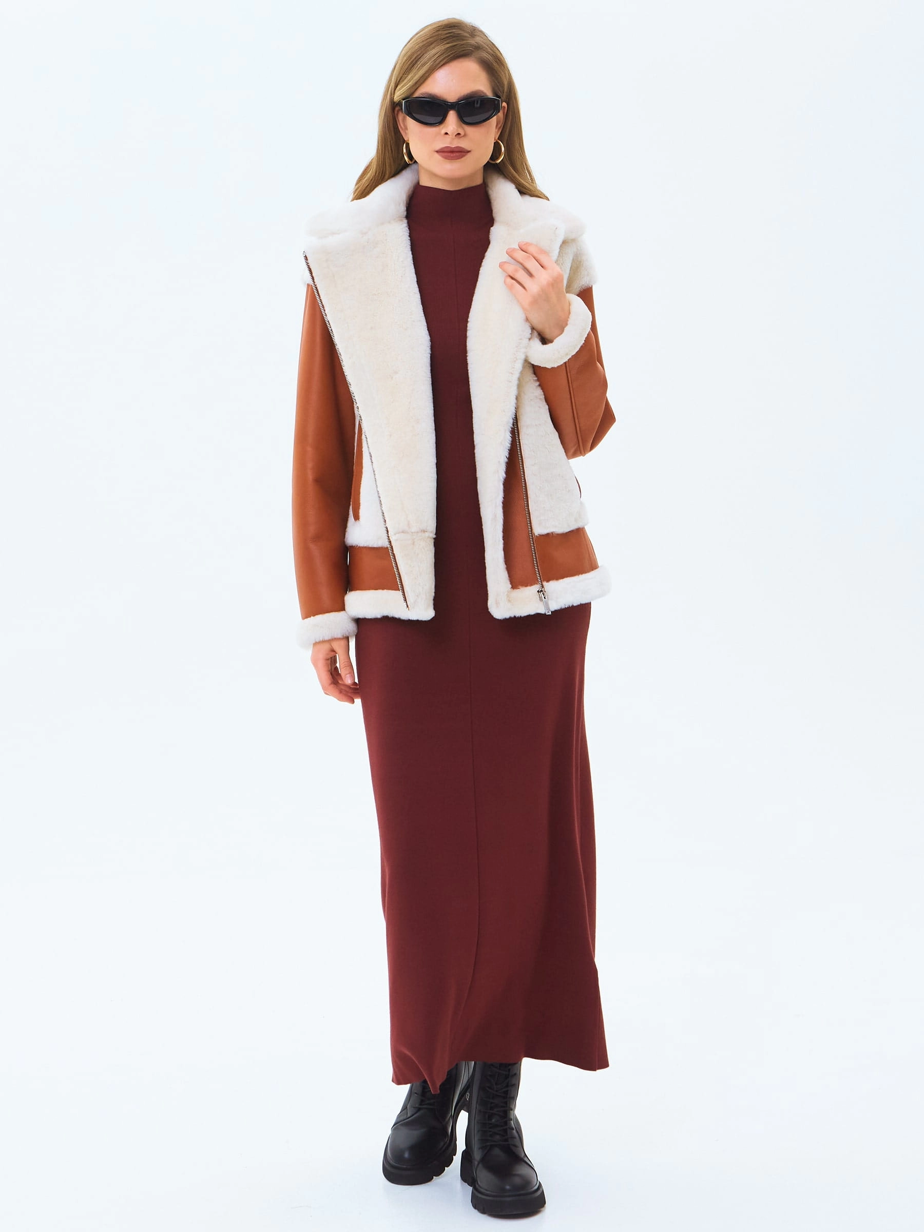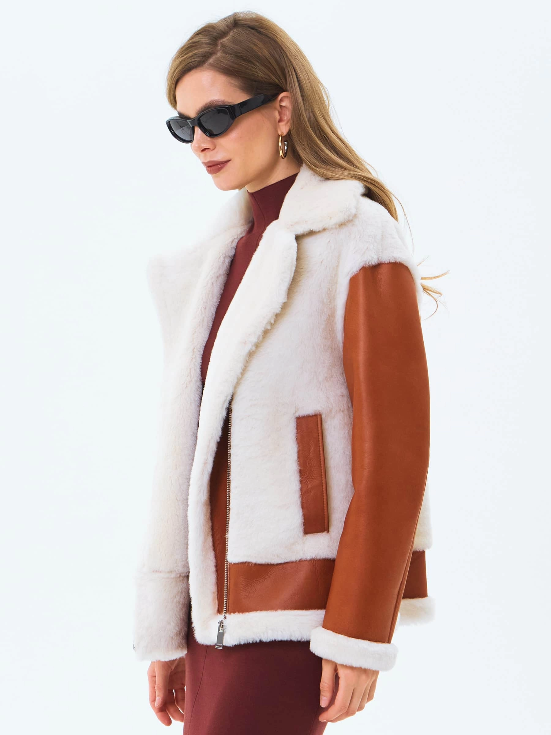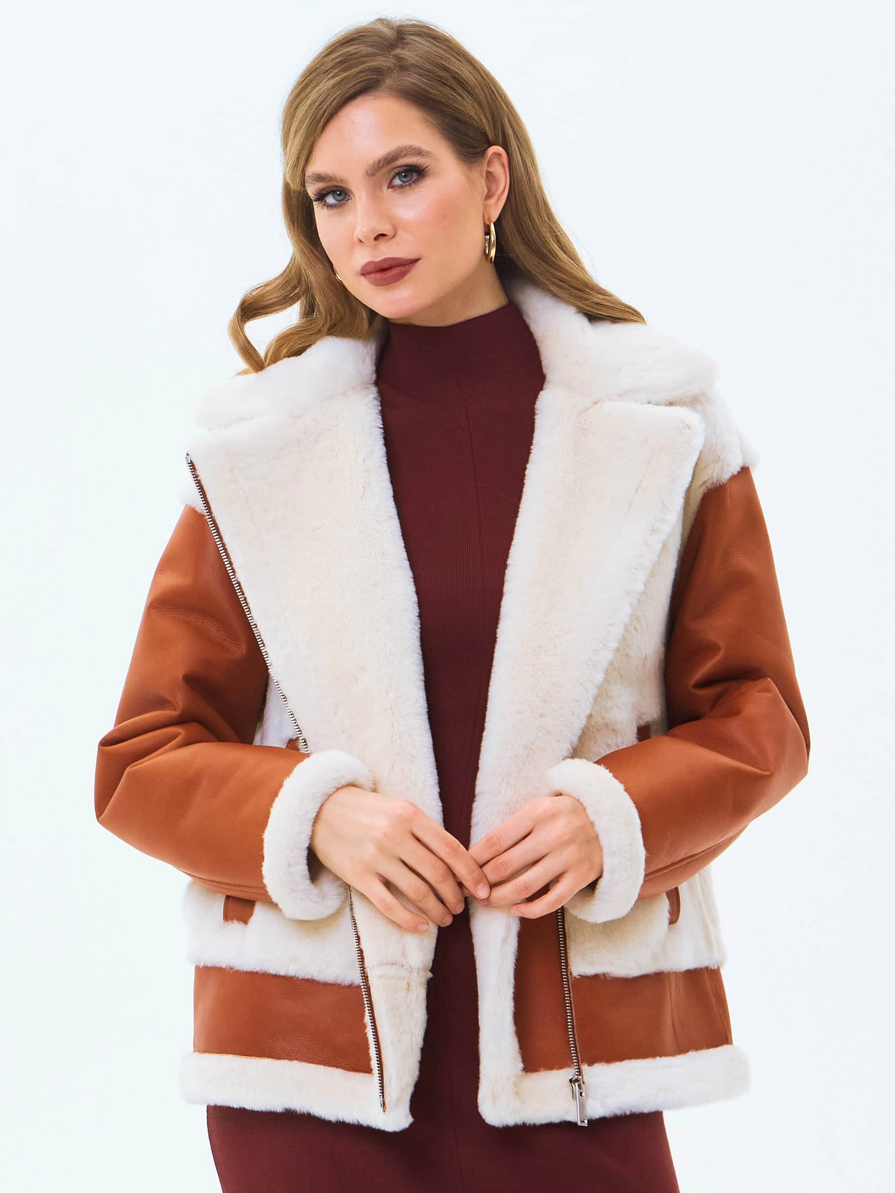 Укороченную дубленку-косуху выполнили из натуральной овчины мерино, сочетая детали с гладкой и меховой поверхностью. Модель свободного кроя с отложным воротником и широкими лацканами хорошо удерживает тепло в холодную погоду,надежно защитит от ветра. Изделие дополнили двумя врезными карманами и застежкой в виде крупной молнии.