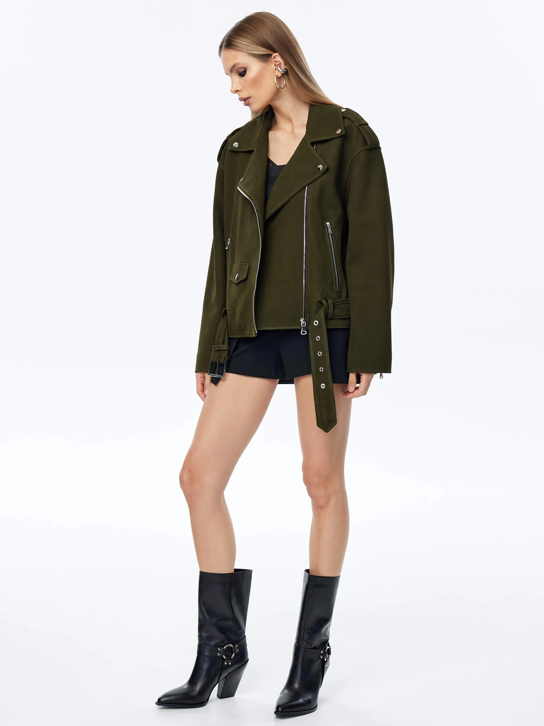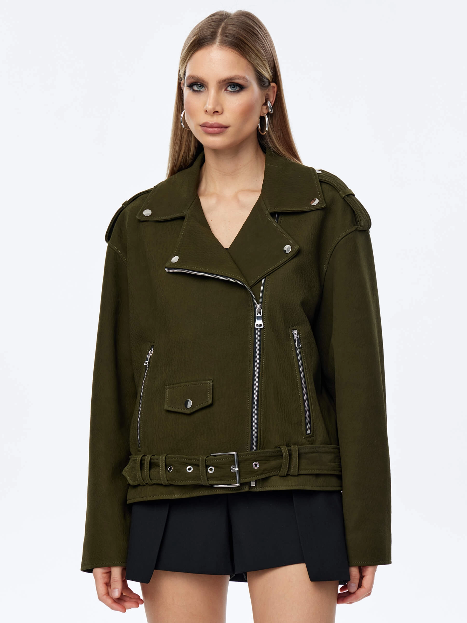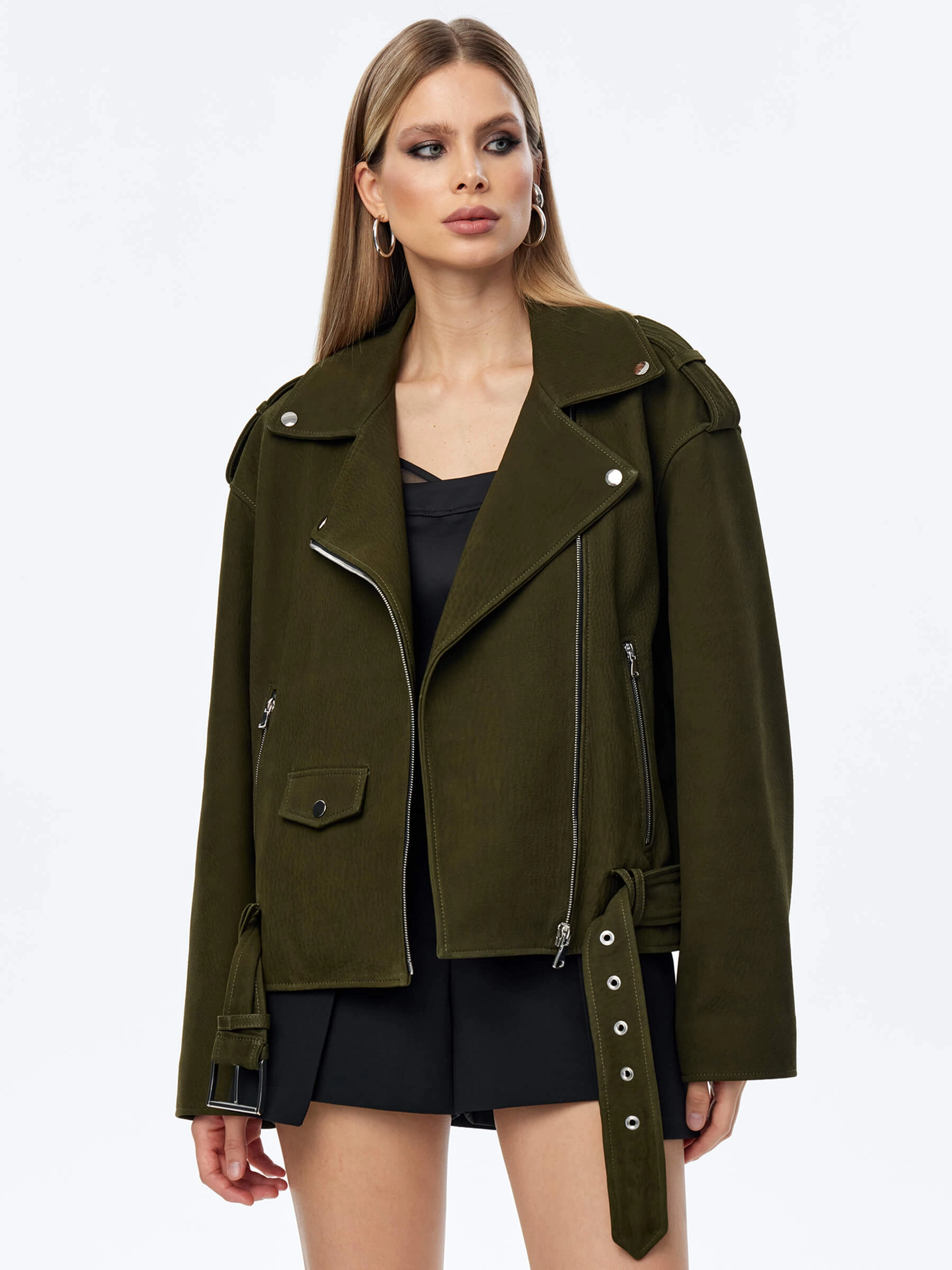 Товар короткая женская кожаная куртка косуха с поясом премиум класса 3052, хаки, размер 44, артикул 23970 выполнен из натуральной кожи. Рассчитан на сезон: весна-осень. Длина изделия 60 см, силуэт свободный.