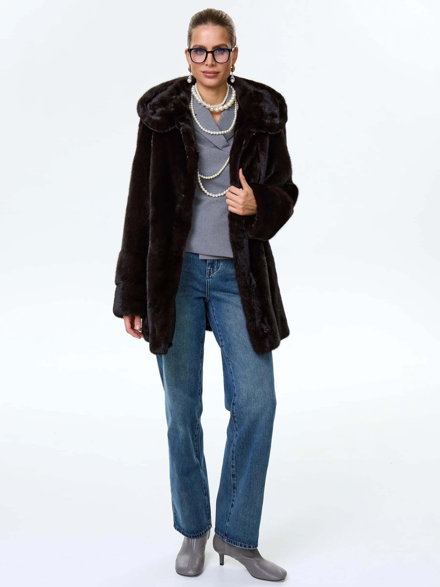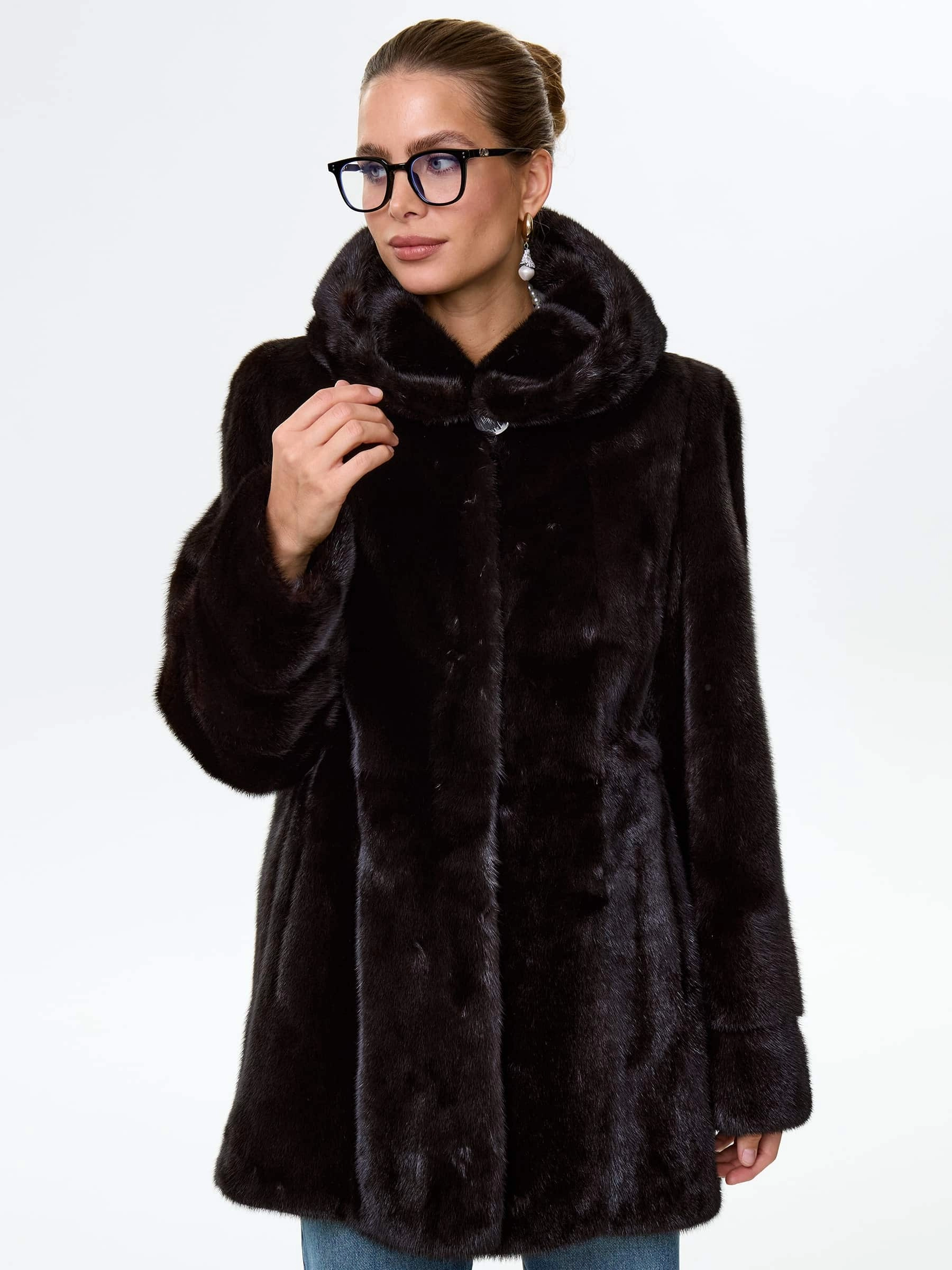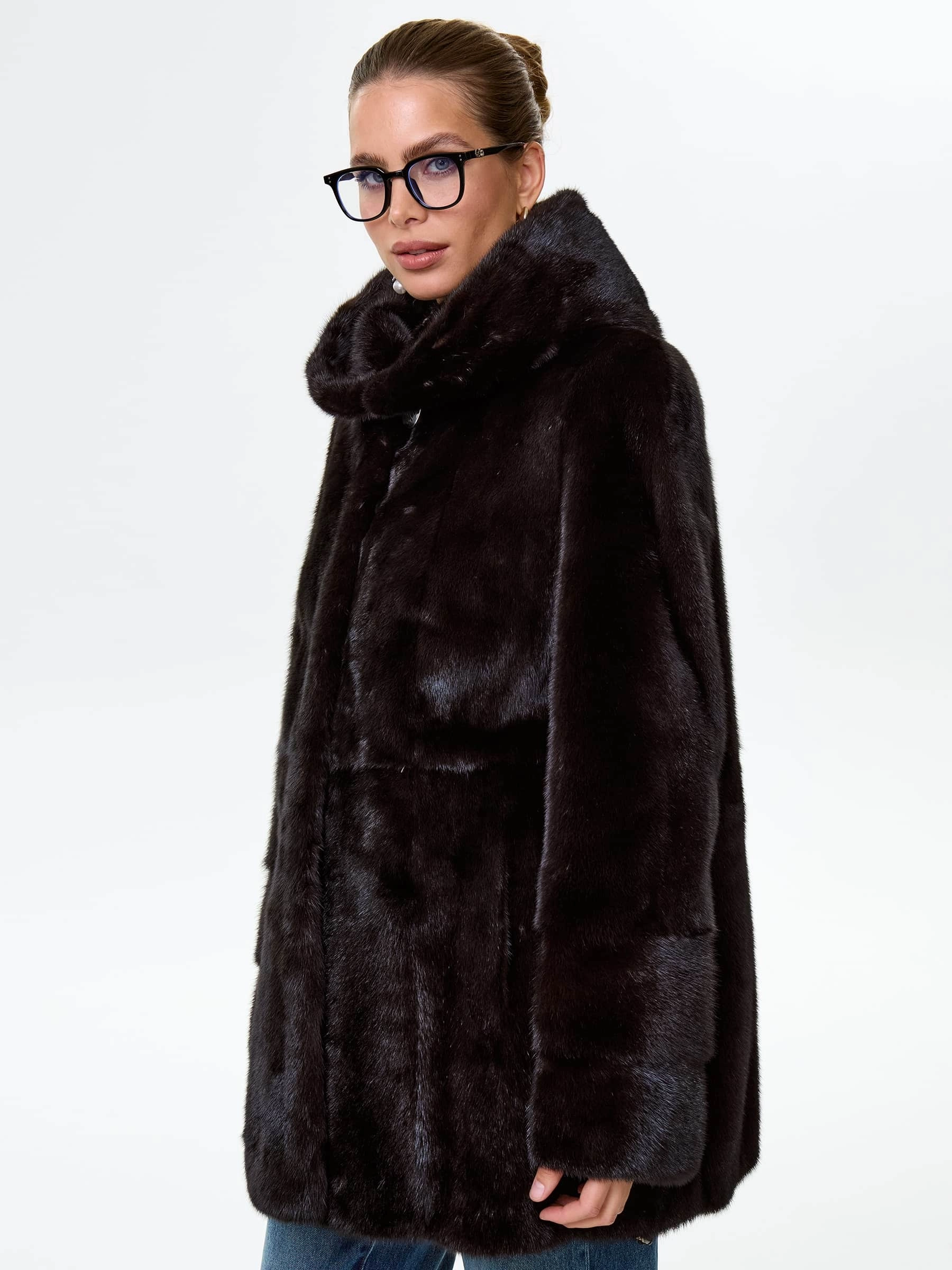 Короткая женская норковая шуба автоледи с капюшоном Елена(к), черная, размер 52, артикул 64540