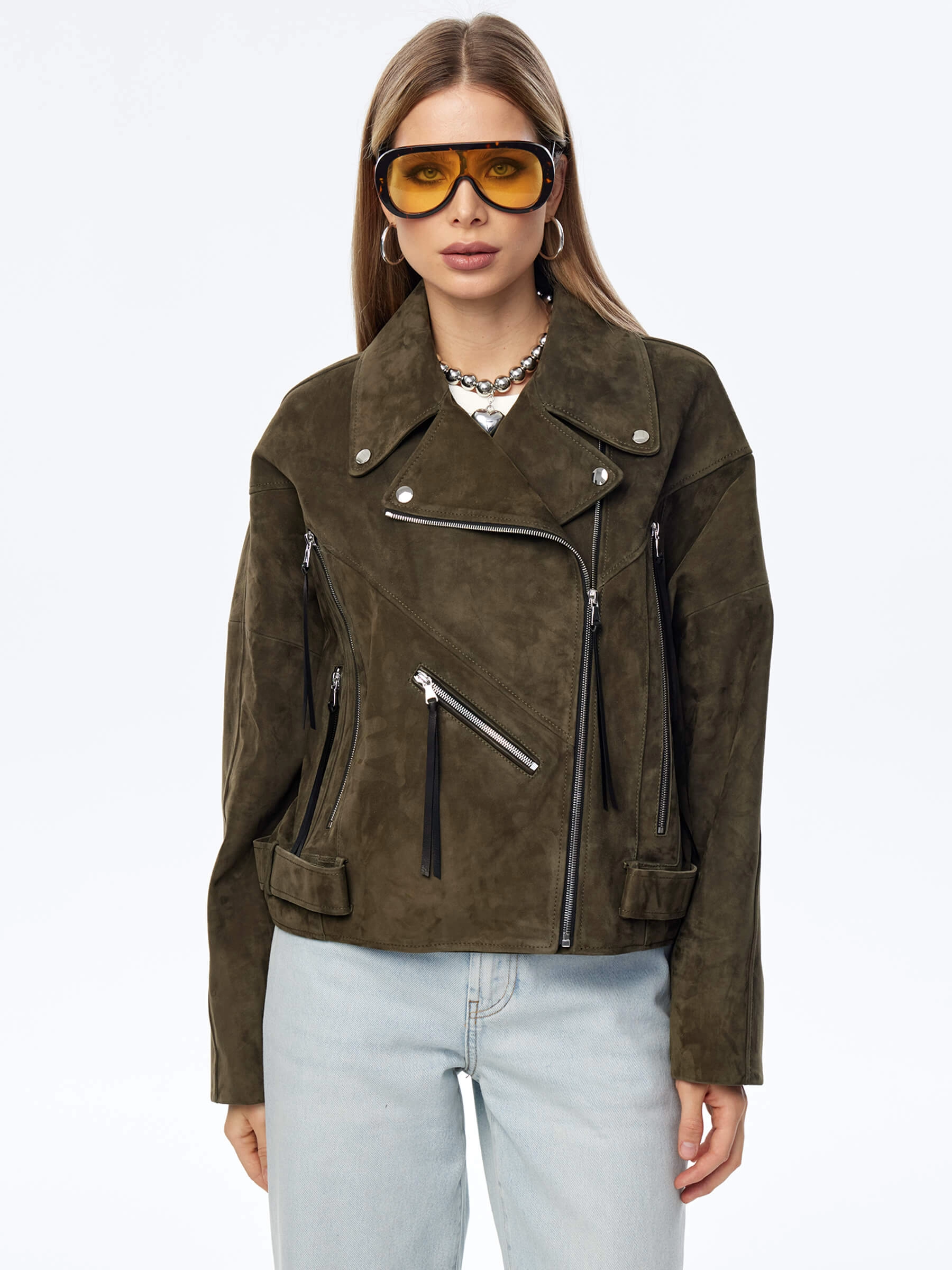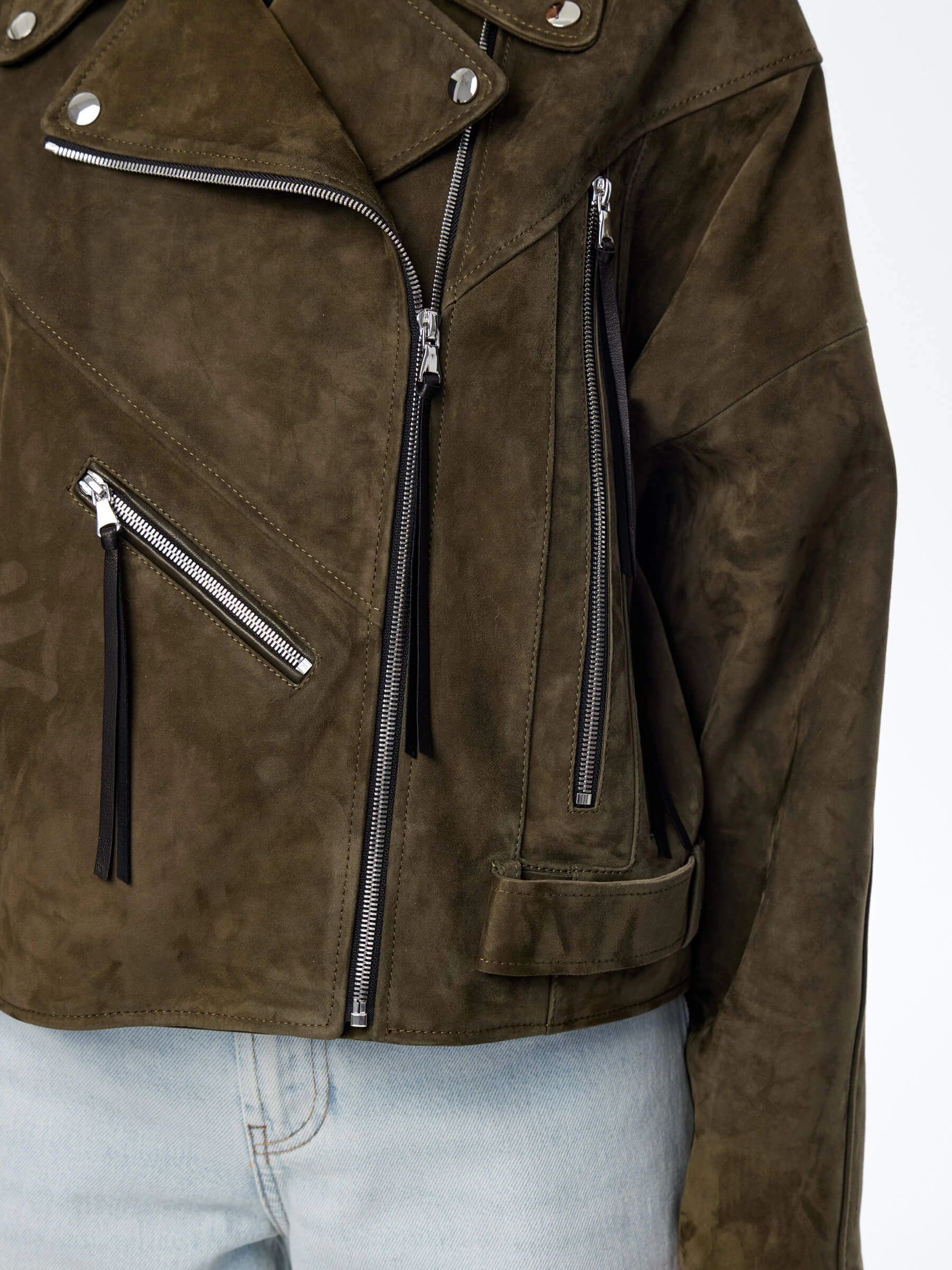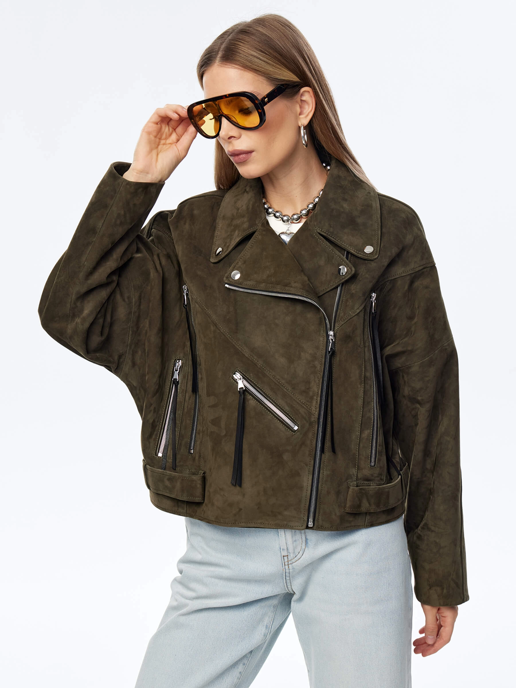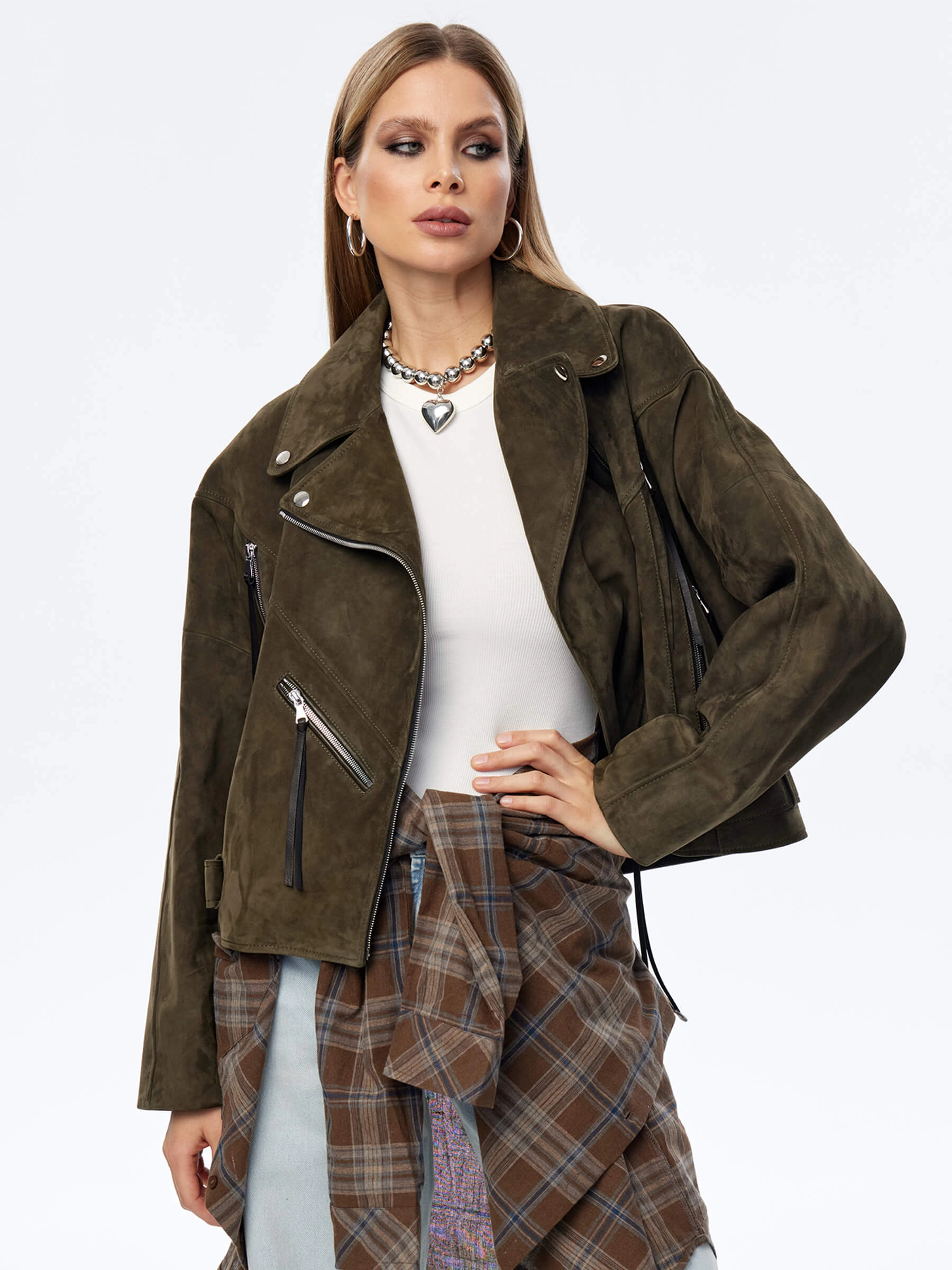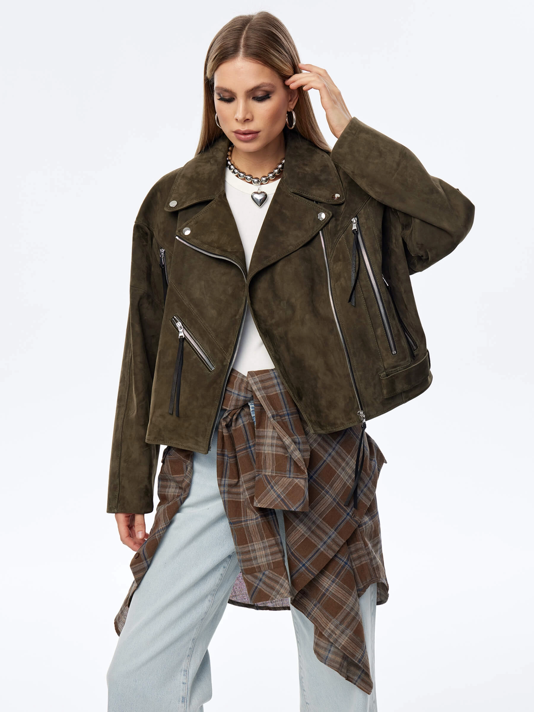 Короткая женская замшевая куртка косуха премиум класса 3051з, хаки, размер 44, артикул 23930