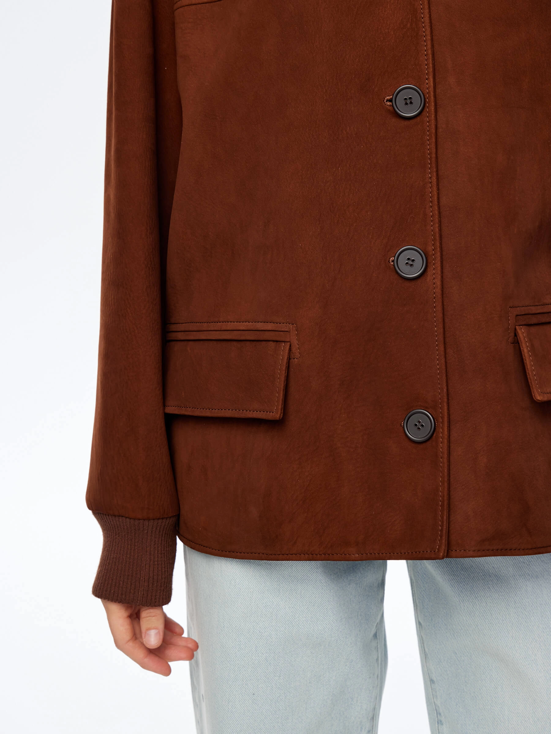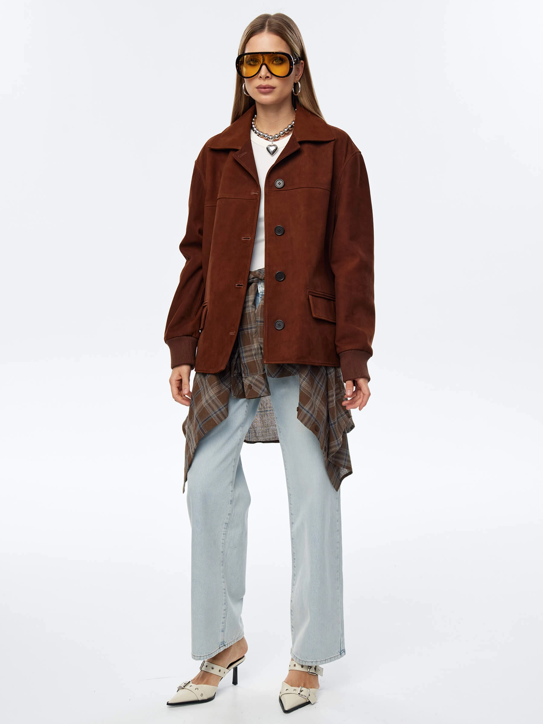 Для пошива удлиненной куртки-бомбер с английским воротником и двумя карманами закрывающиеся клапанами, использовали мягкую фактурную кожу премиум класса. Модель прямого силуэта, со спущенной линией плеч не ограничивает движения, удобно садится по фигуре. Дополнительный комфорт добавят трикотажные манжеты. Посадку по фигуре можно подчеркнуть узким поясом.
