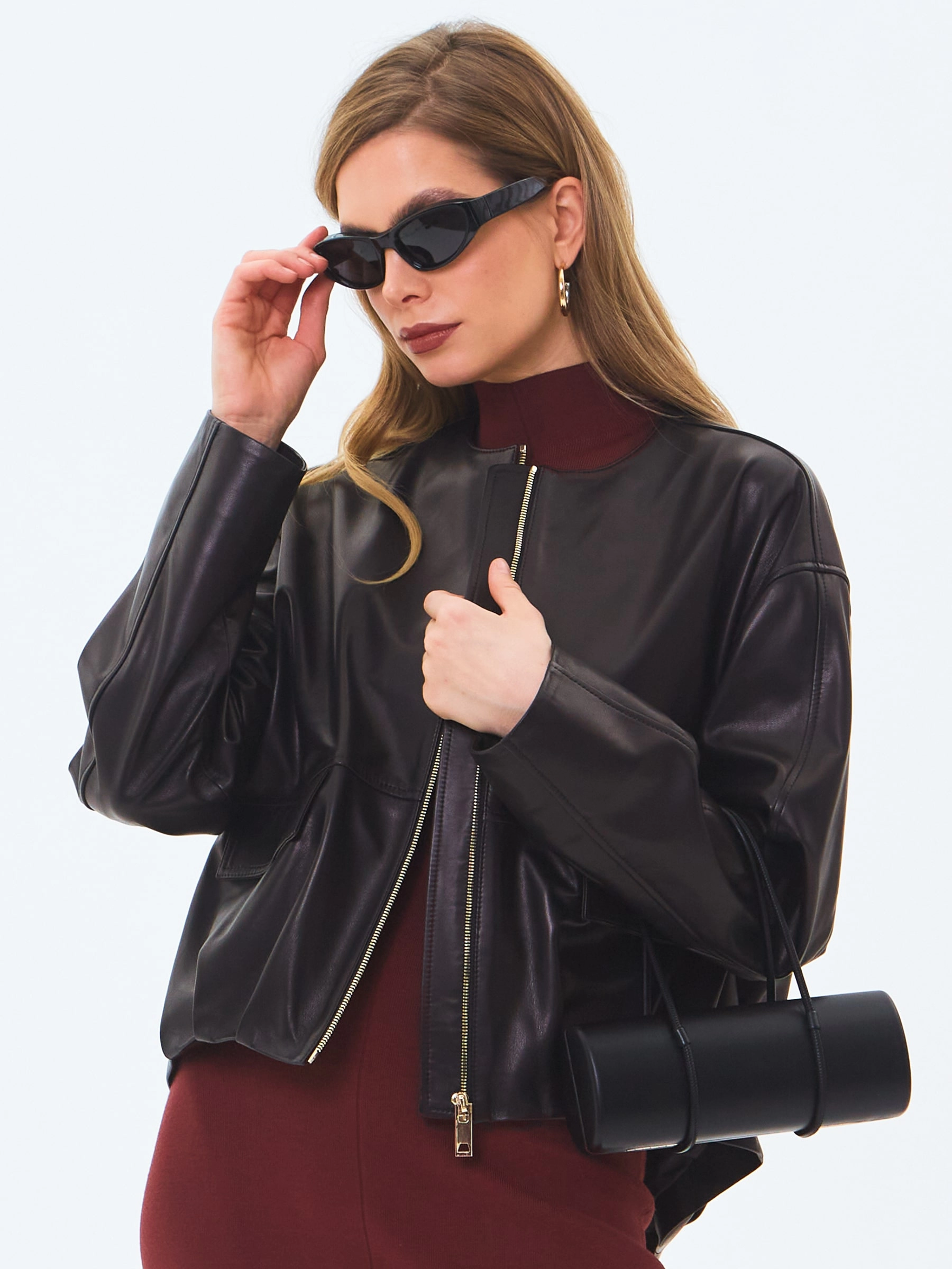Короткую куртку бомбер с круглым воротом выполнили из тонкой гладкой кожи премиум класс. Модель свободного кроя и двумя накладными карманами с клапанами застегивается молнией.