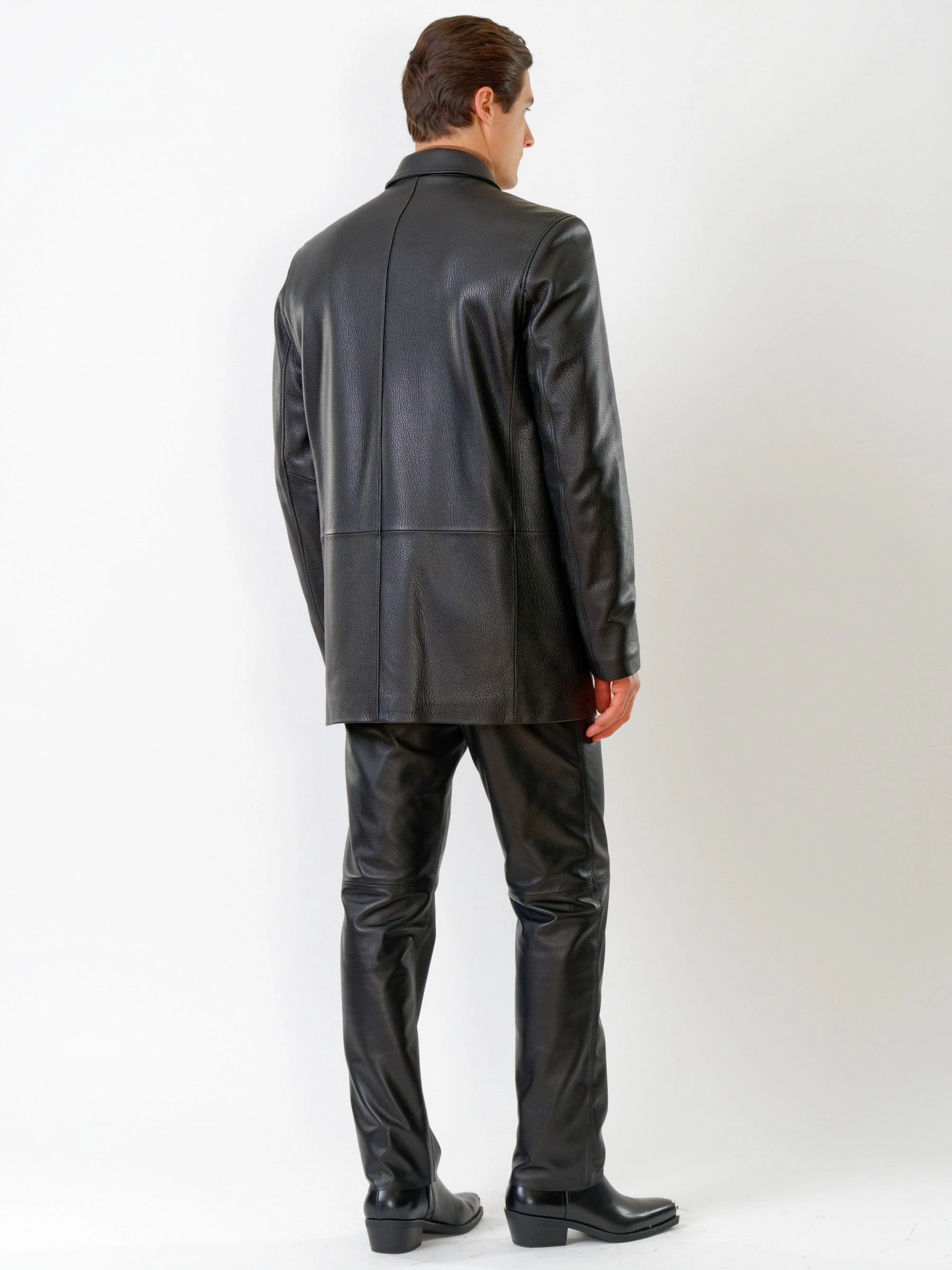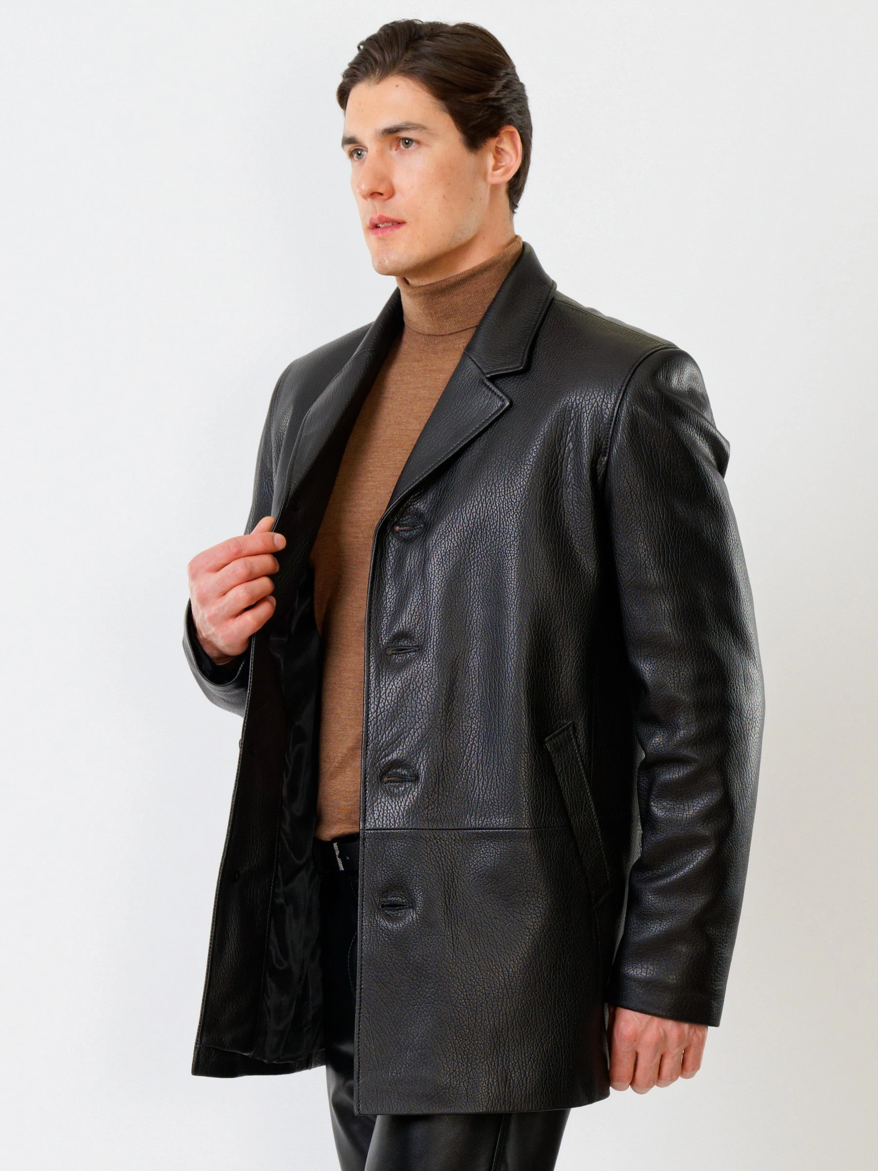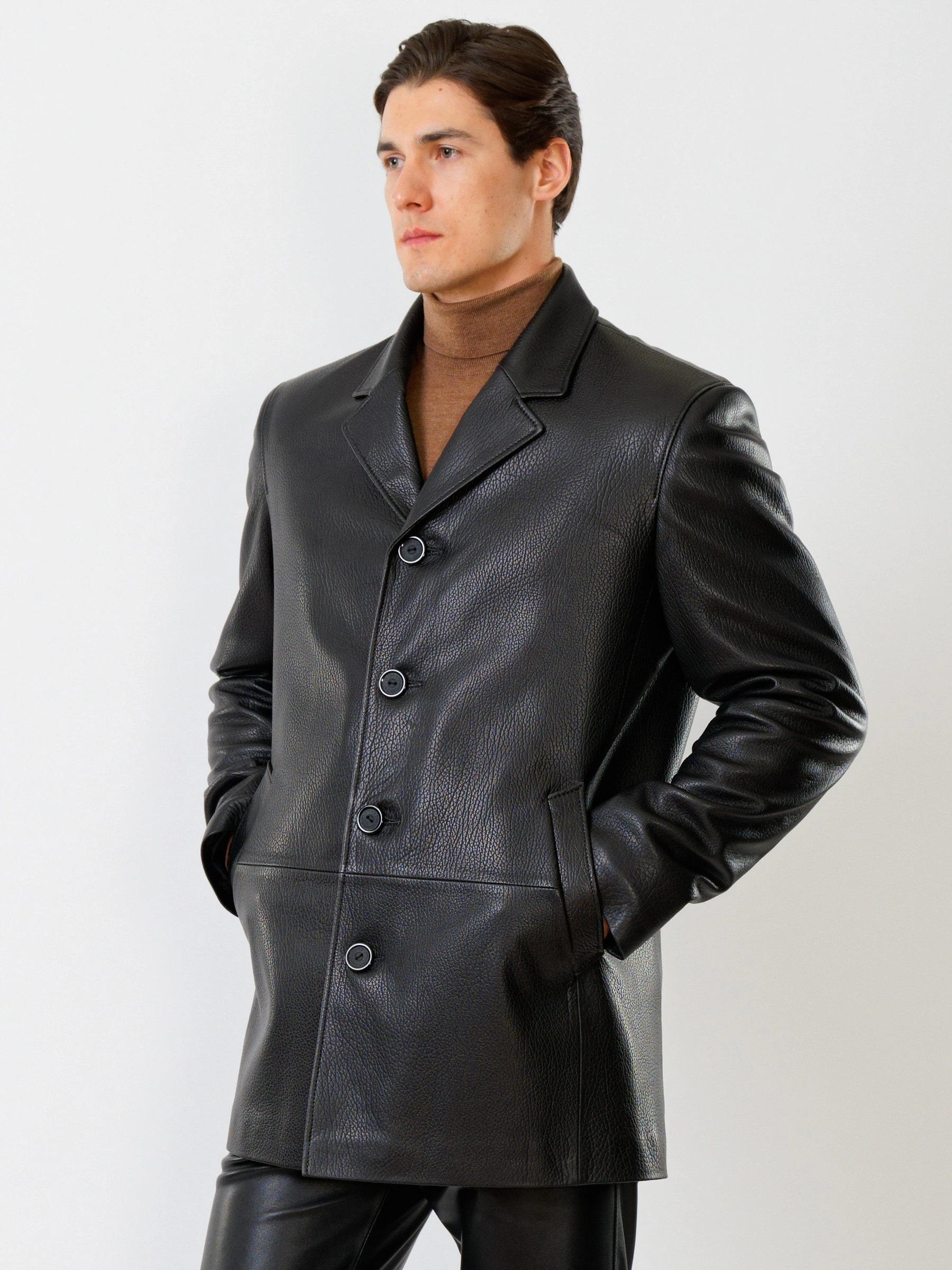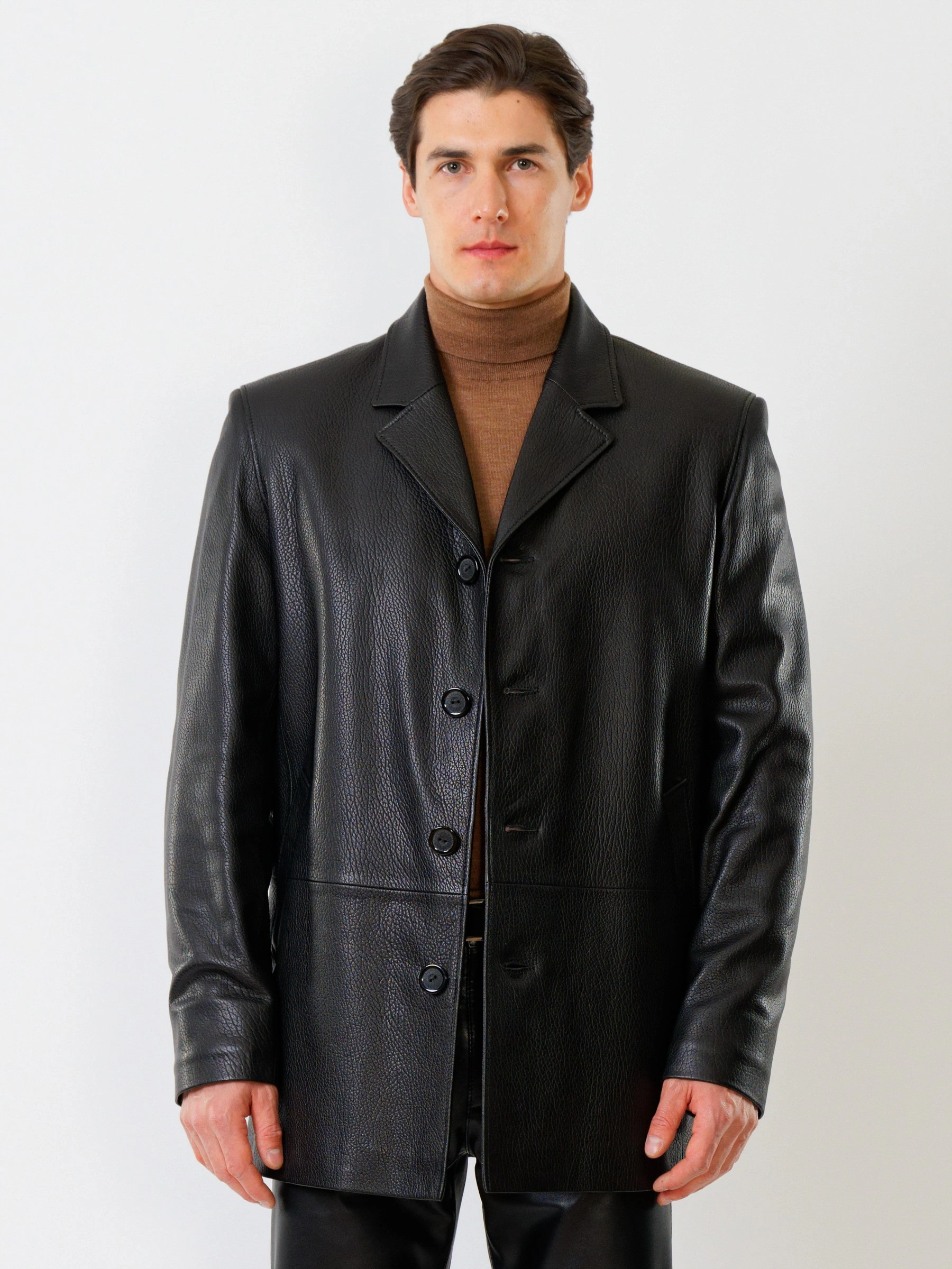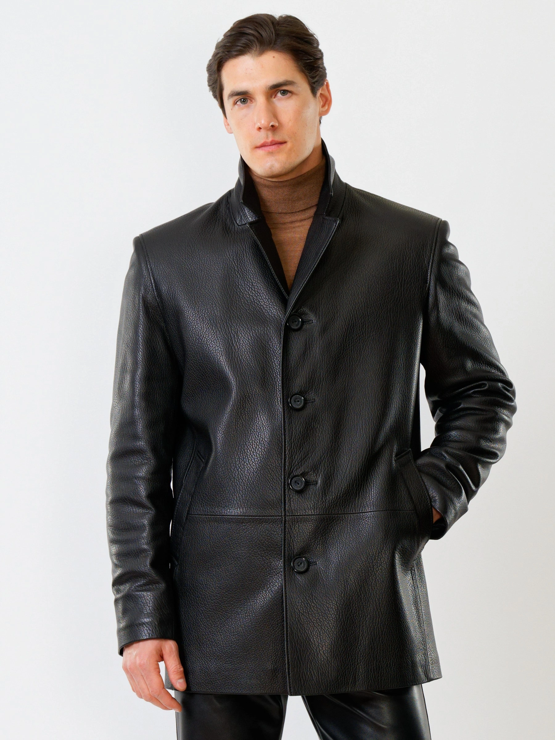 Мужская куртка на пуговицах в современном исполнении. Черная кожа особой выделки. Модель комфортно садится по фигуре поверх пиджака. Прямой силуэт. Английский воротник. Рукав втачной двухшовный. Ширина рукавов и специальное построение плечевого пояса, обеспечивают комфортную посадку на любой тип фигур. Широкий усиленный подборт предотвращает деформацию. Эргономичные усиленные листочки наружных карманов. Предусмотрены внутренние застёгивающиеся карманы для документов. Особая обработка петель под пуговицы предотвращает их изнашивание. Безупречная работа наших портных.