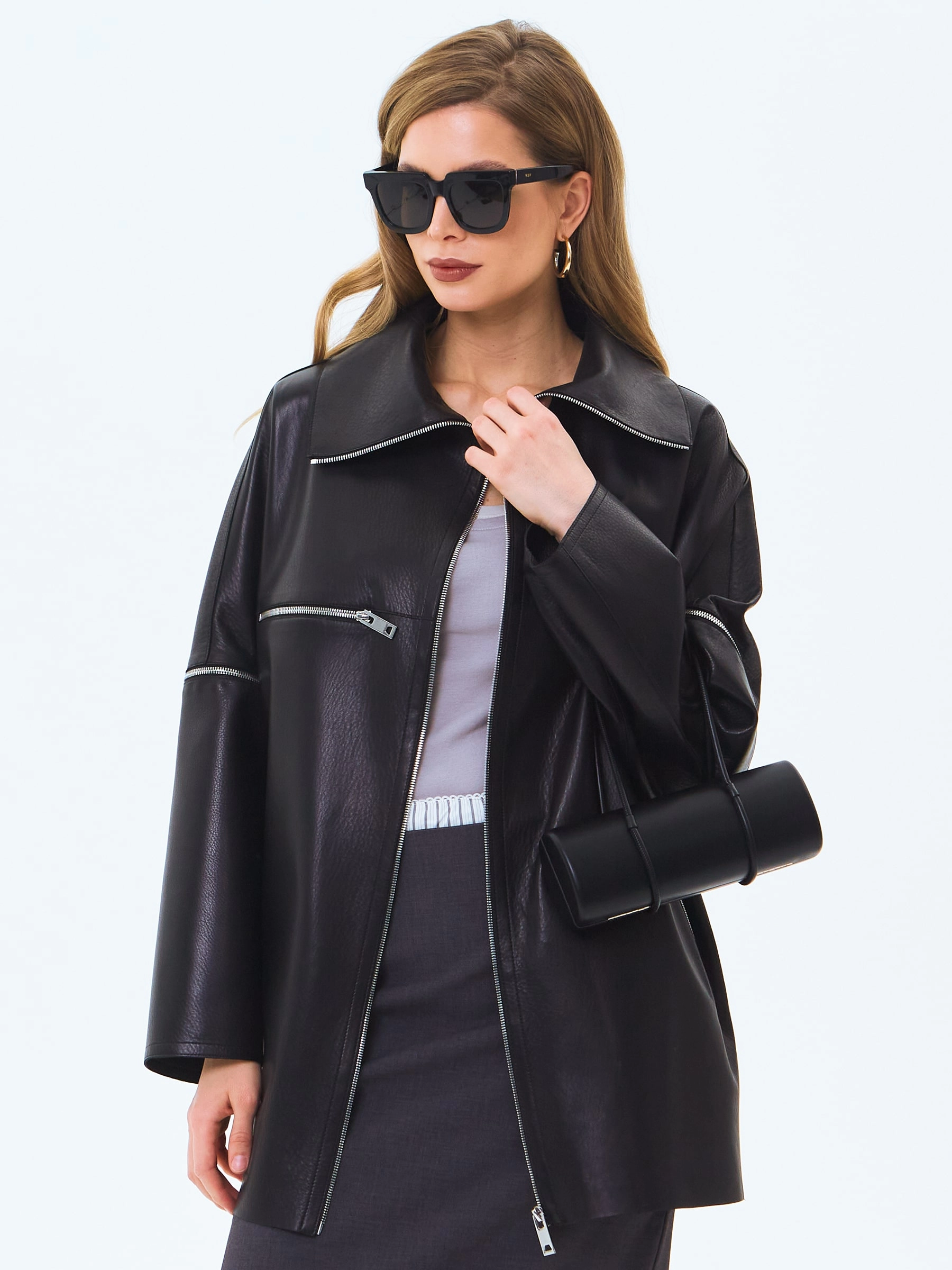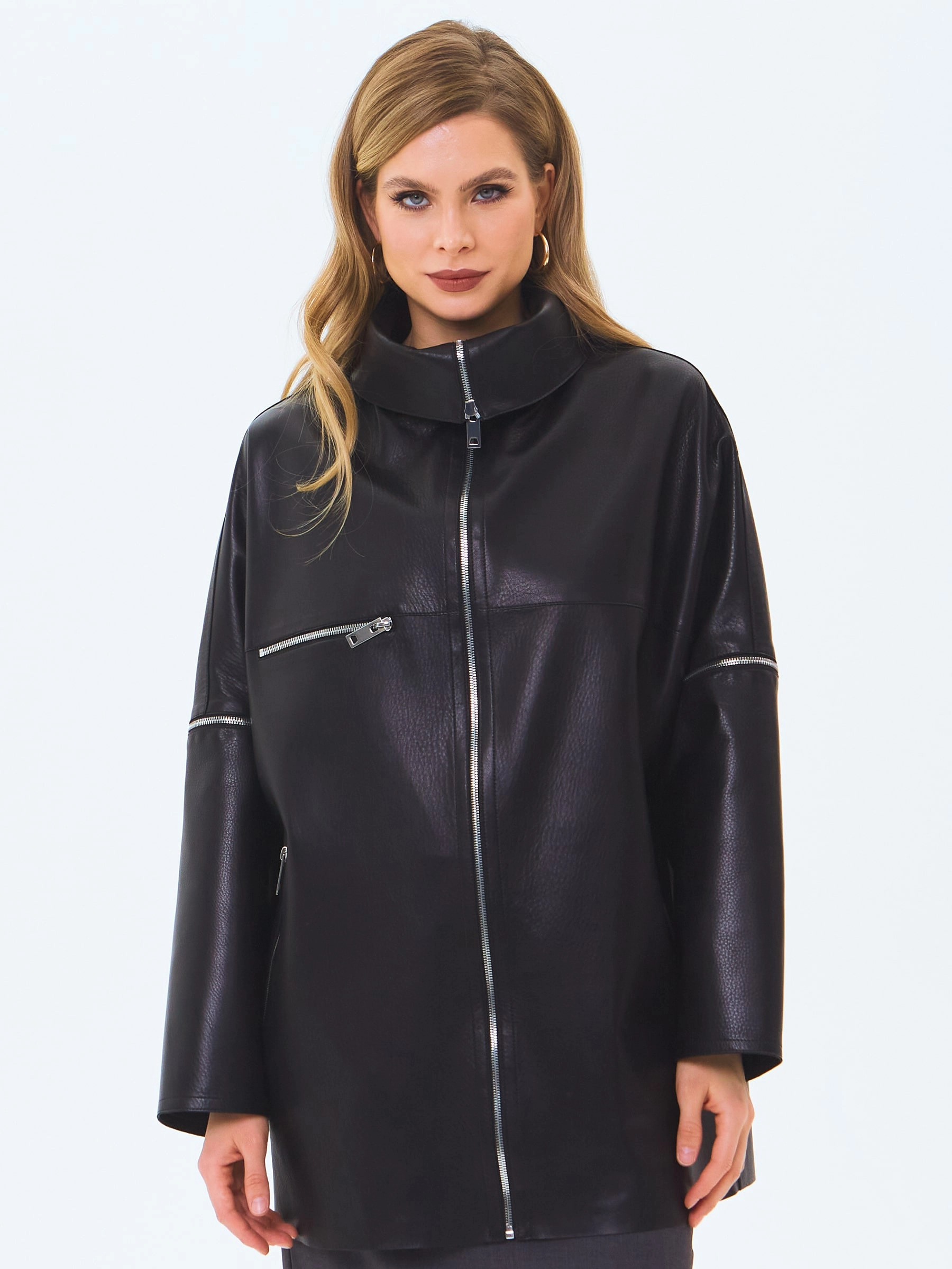 Эта модель может послужить не только как куртка, но и как отличным жакетом. Изделие выполнили из натуральной кожи премиум класс. Свободный крой. Широкий рукав-трансформер. Отложной воротник может легко изменить форму в виде стойки. Куртку-жакет дополнили удобными карманами застегивающиеся крупными молниями.