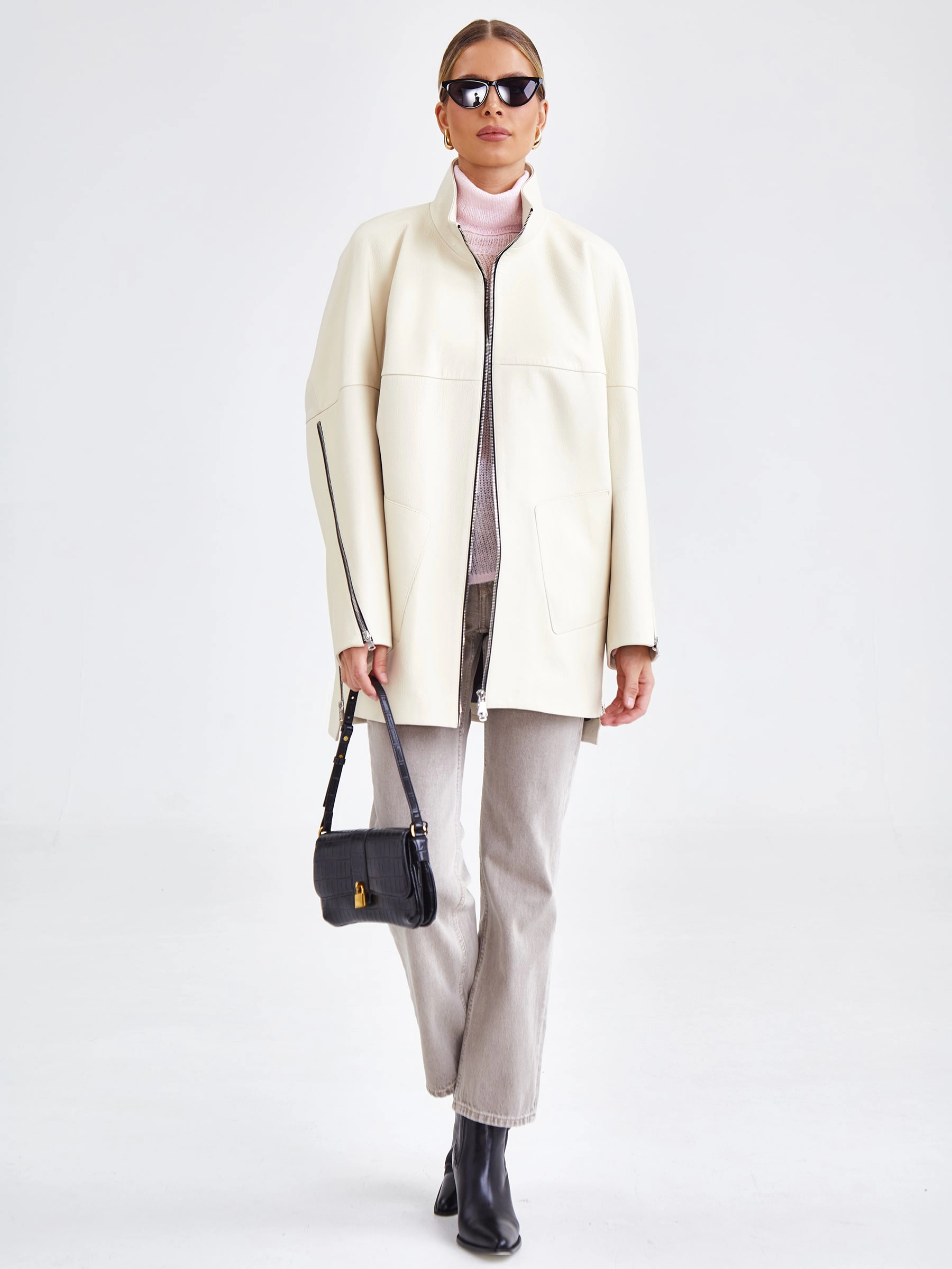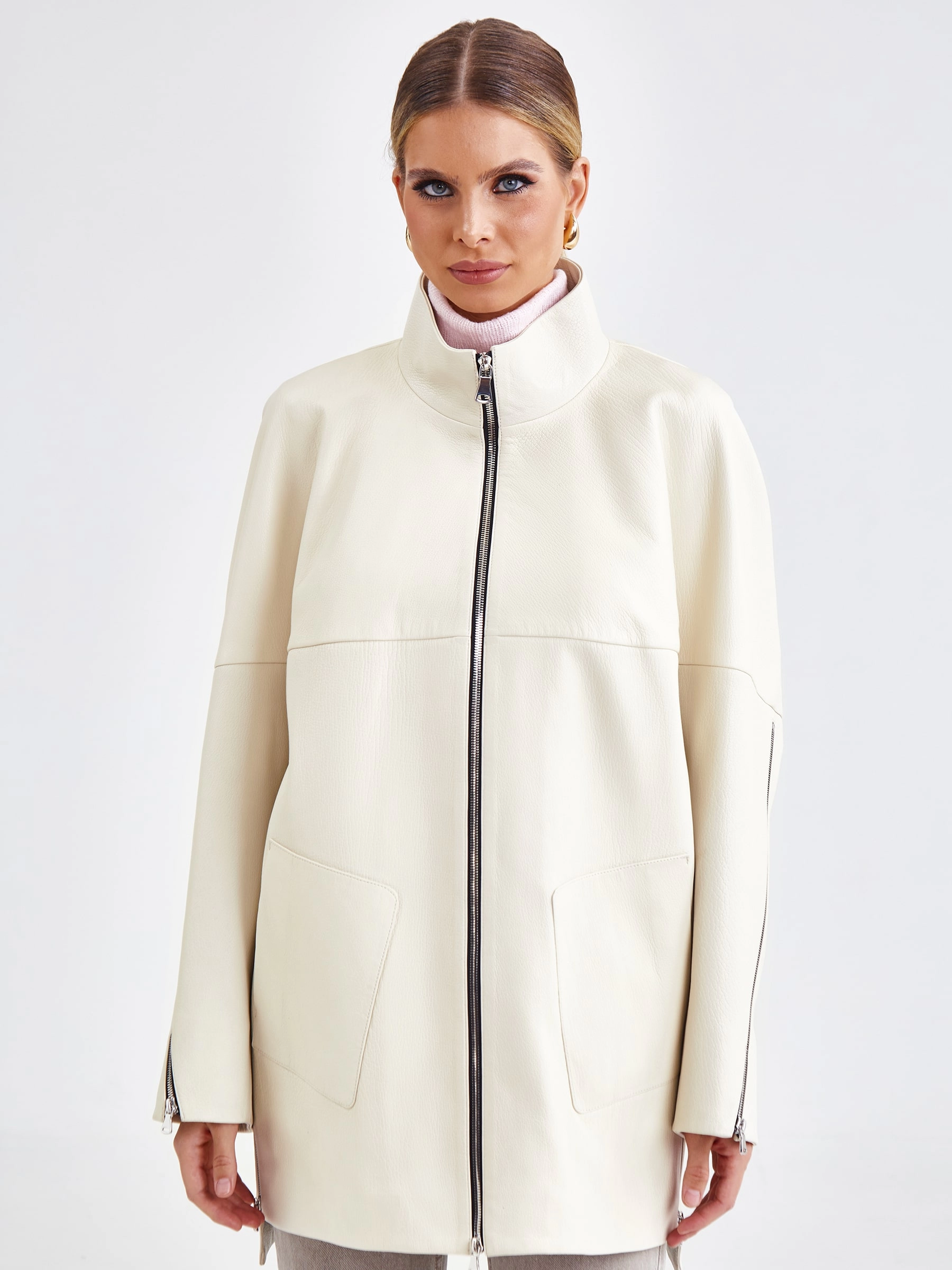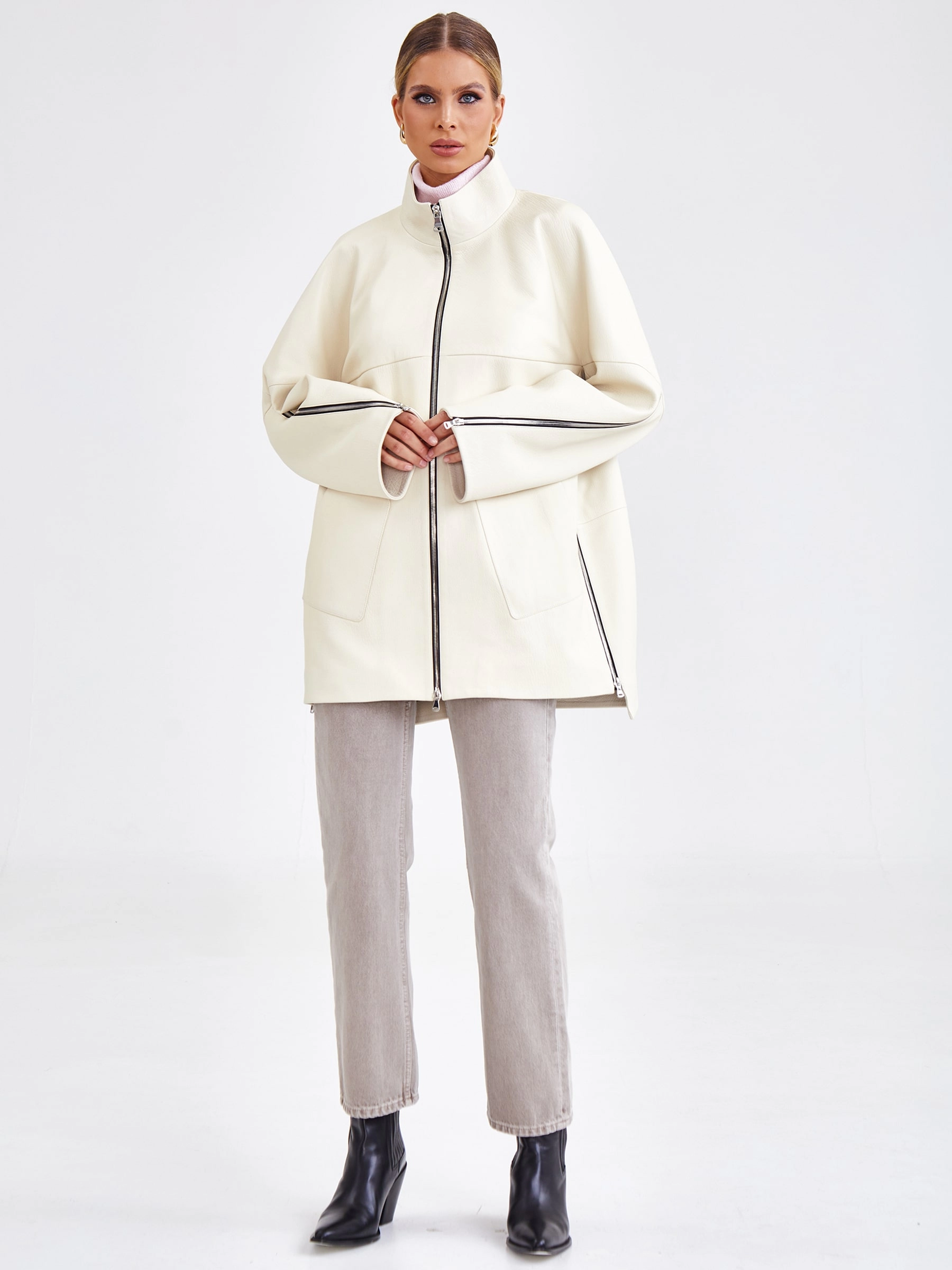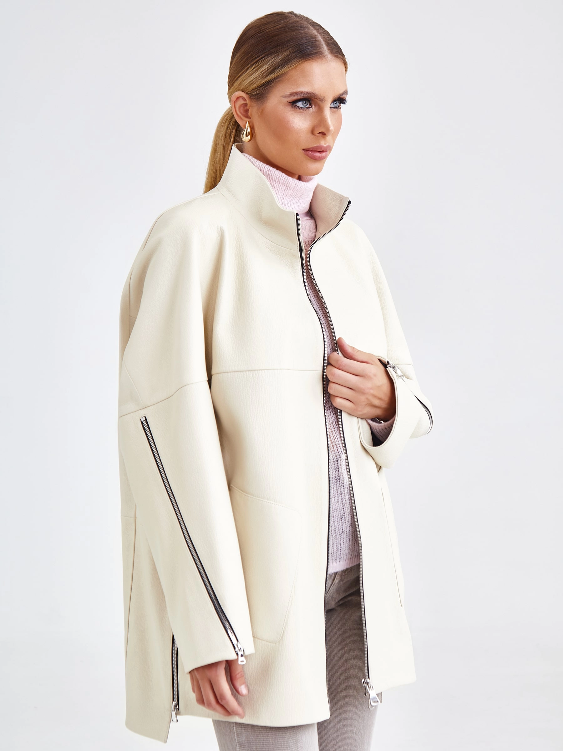 Товар кожаная женская куртка оверсайз премиум класса 3038, белая, размер 50, артикул 23151 выполнен из натуральной кожи с застежкой молния. Рассчитан на сезон: весна-лето. Длина изделия 80 см, силуэт свободный.