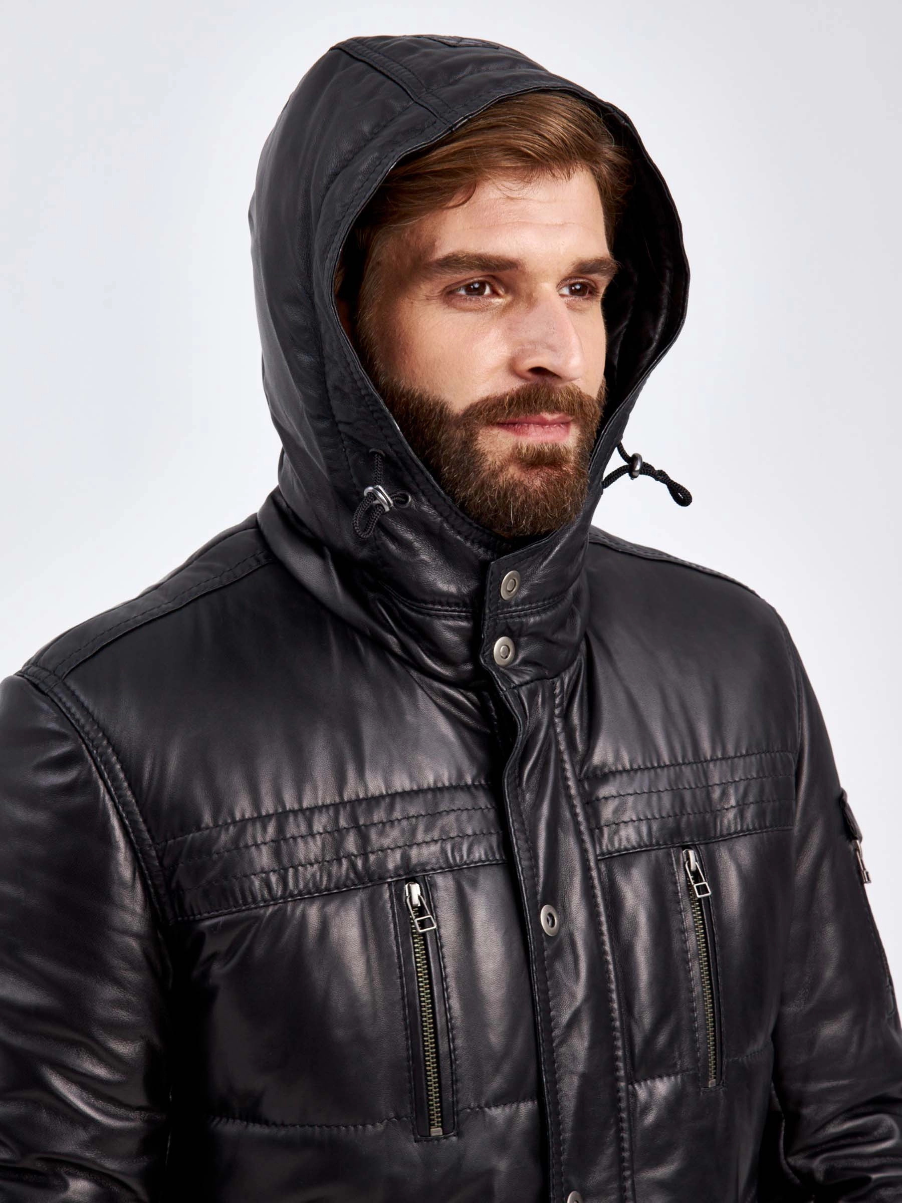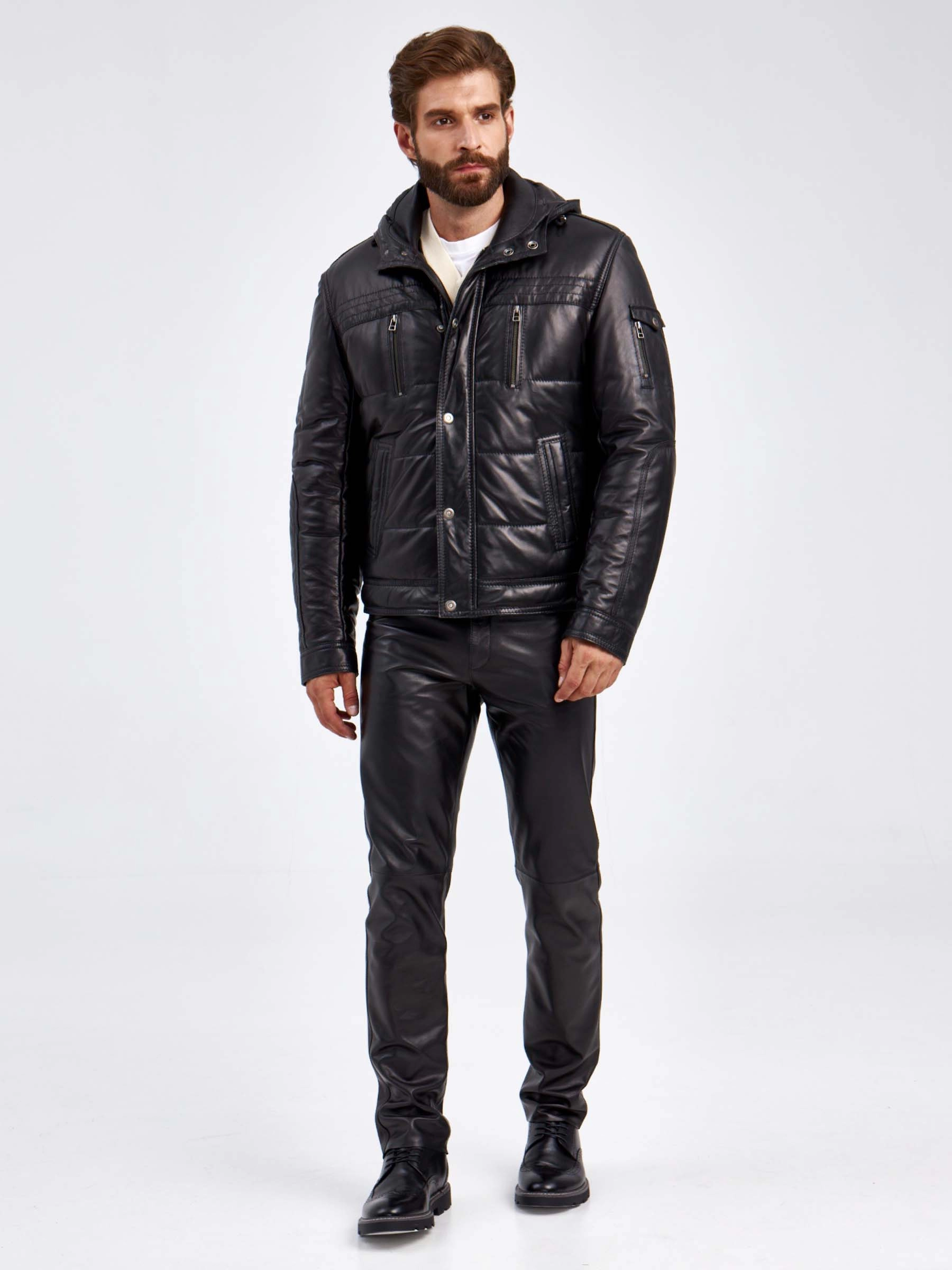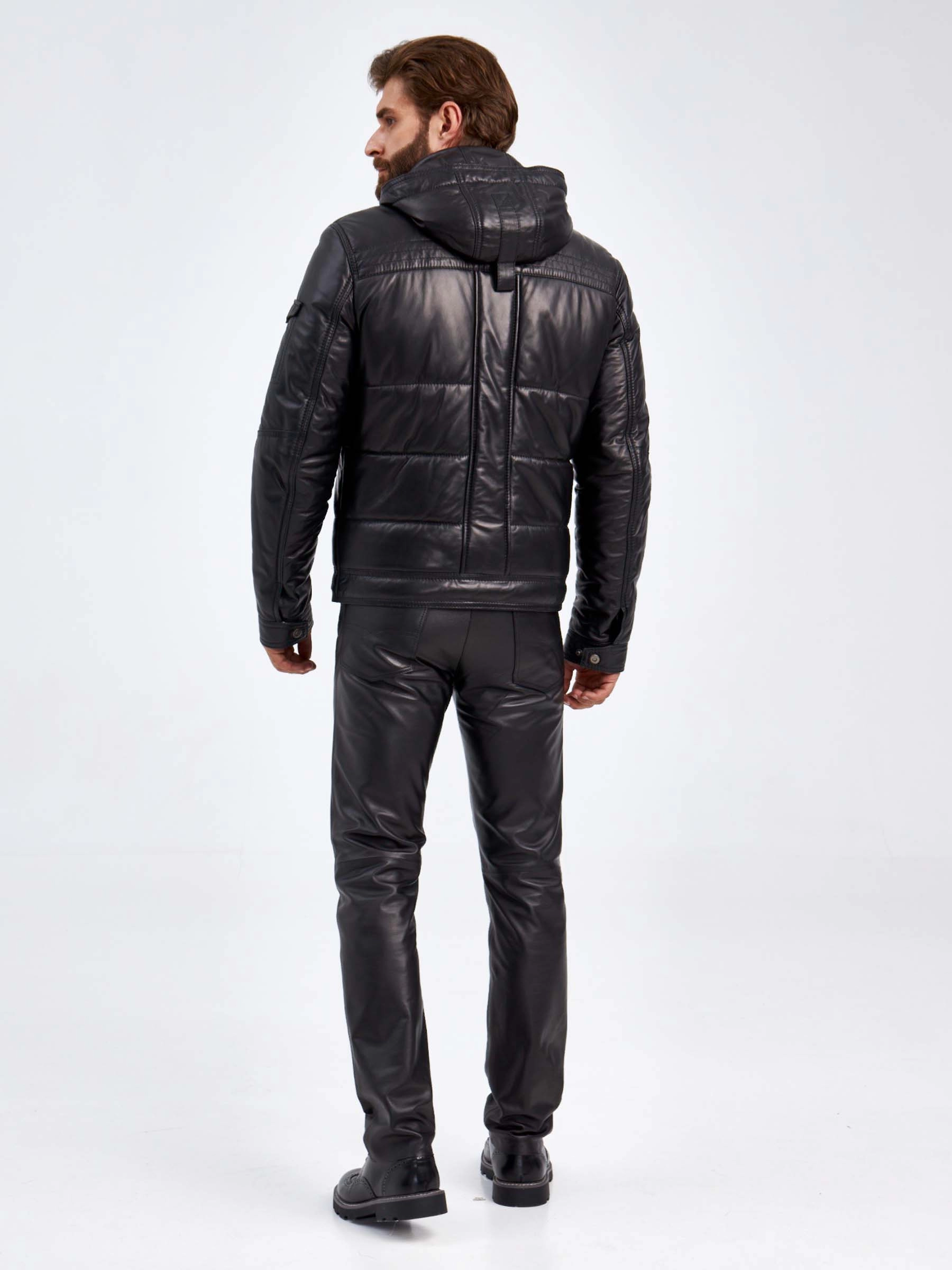 Утепленный мужской кожаный пуховик с капюшоном 2010-12, черный, размер 50, артикул 29150