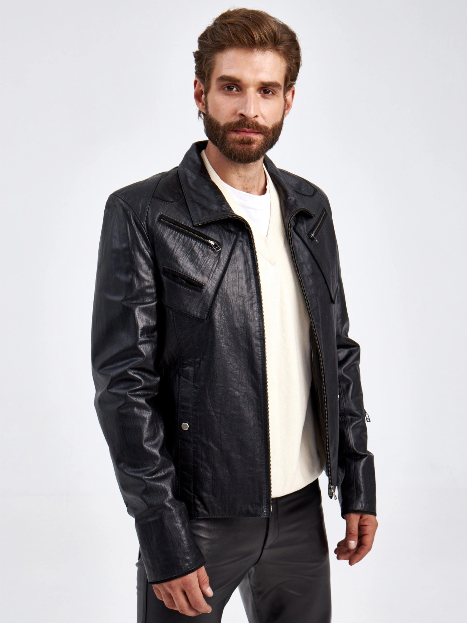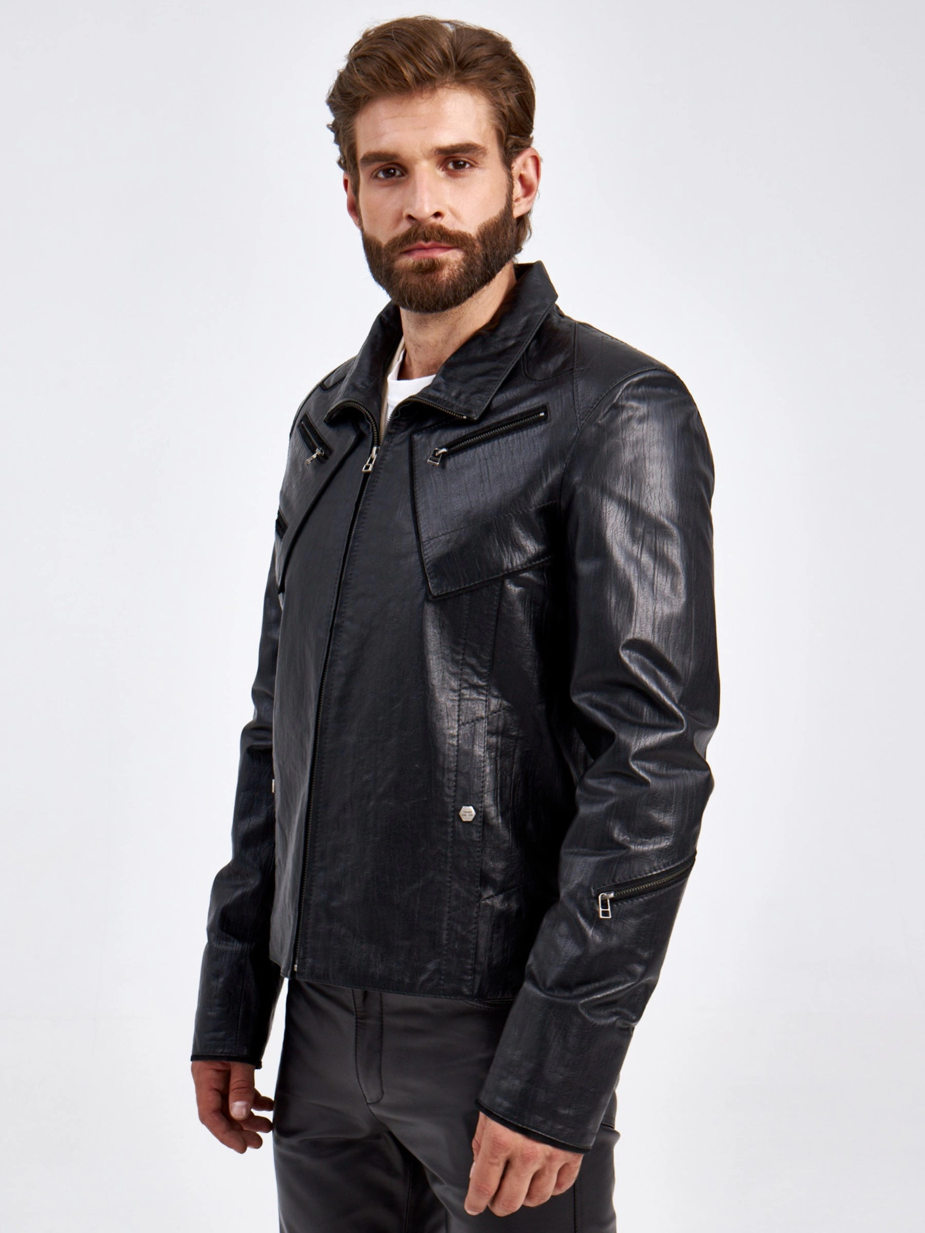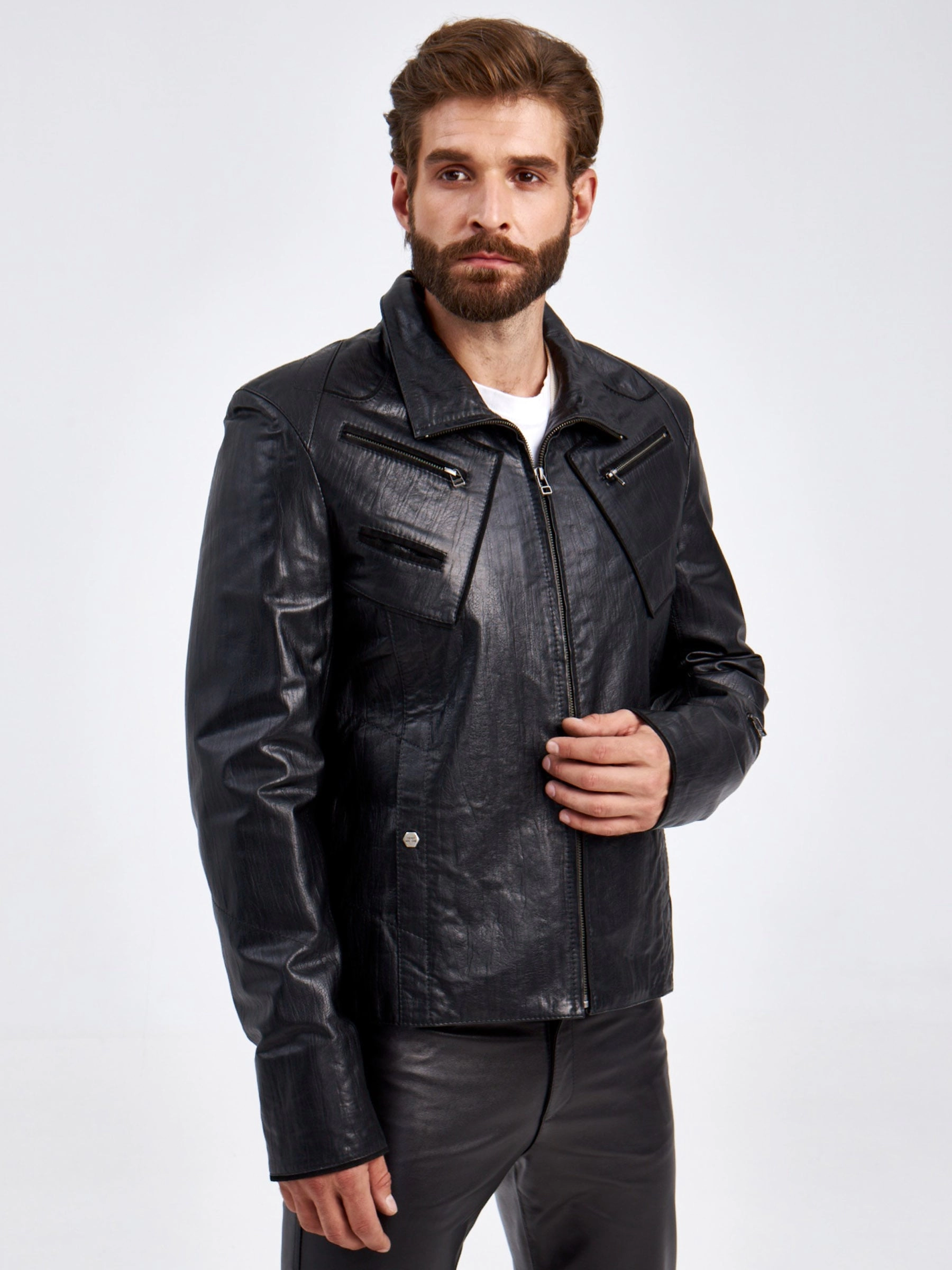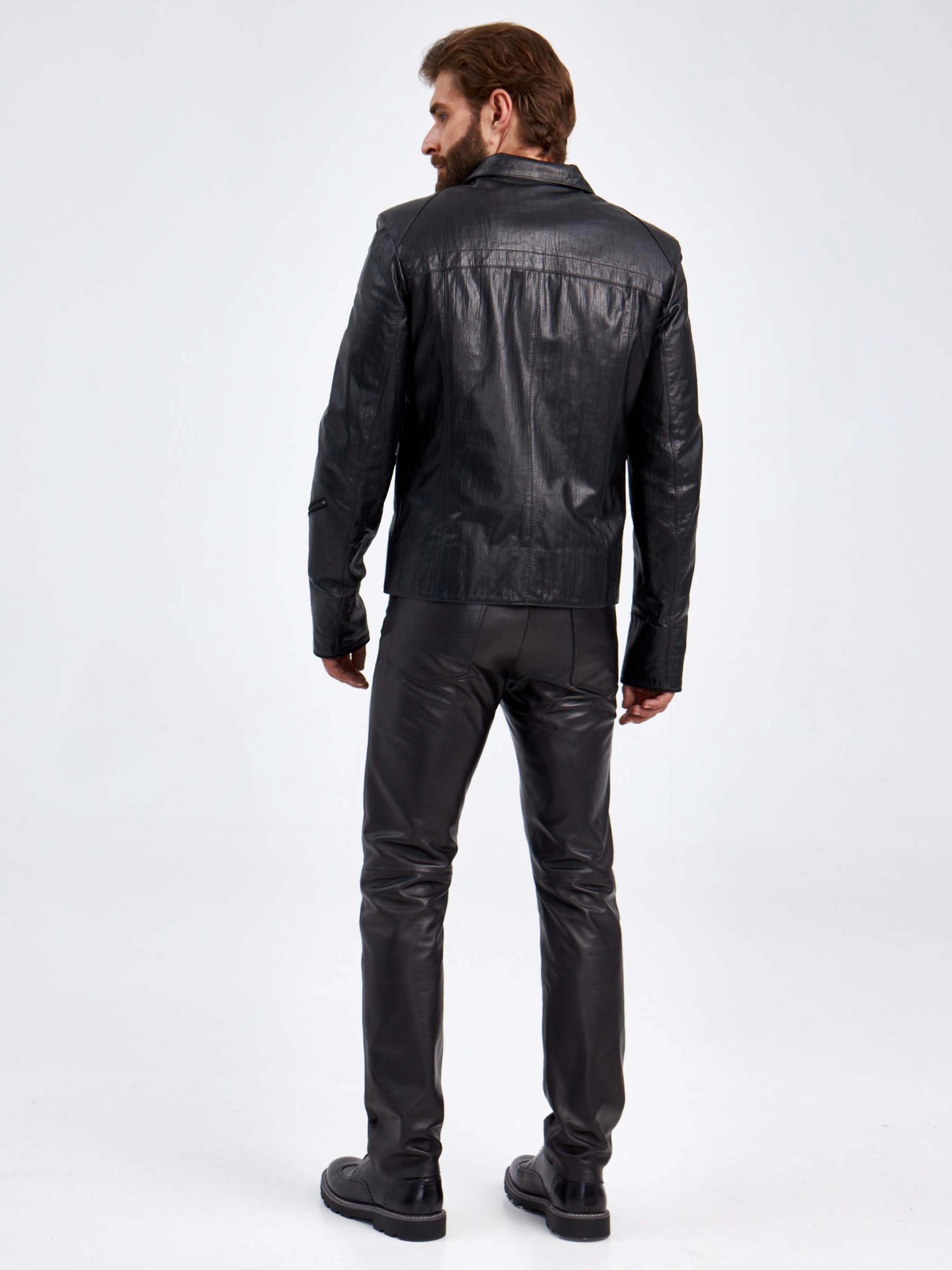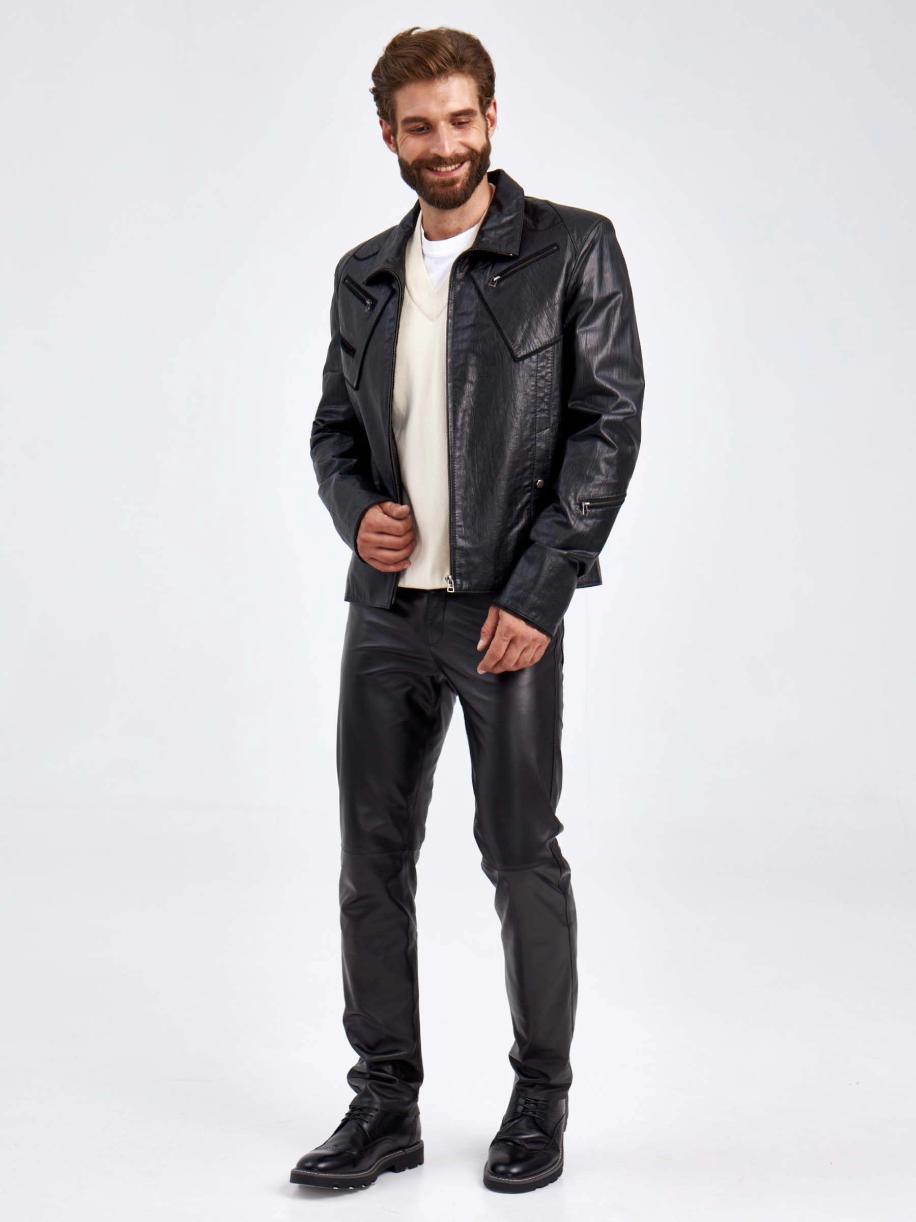 Мужская куртка в великолепной мягкой кожи черного цвета застегивающаяся на молнию. Прямого силуэта. Воротник –отложной плавно трансформируется в стойку. Модель дополнили асимметричными нагрудными карманами на молнии. Идеальная посадка по фигуре.