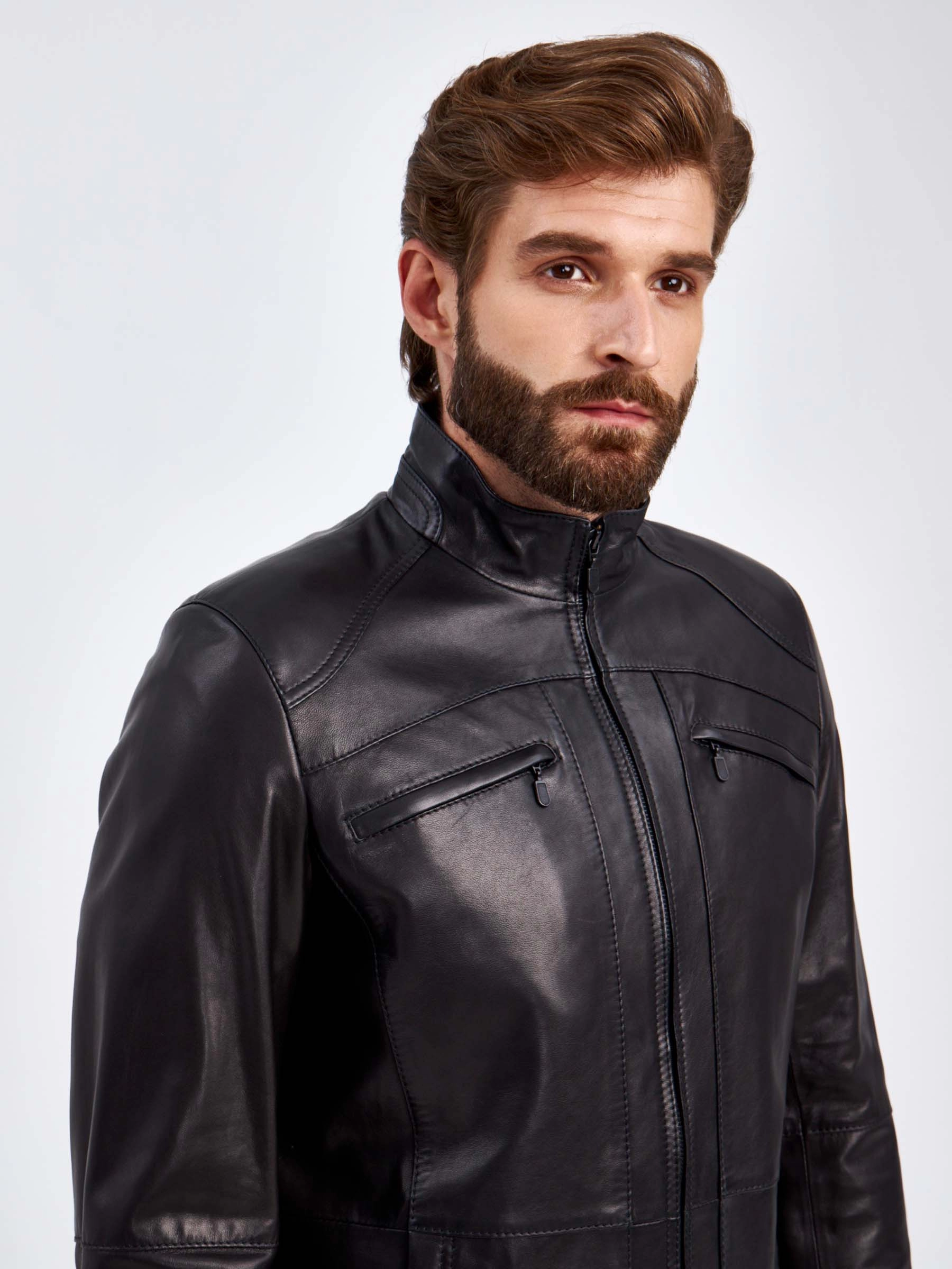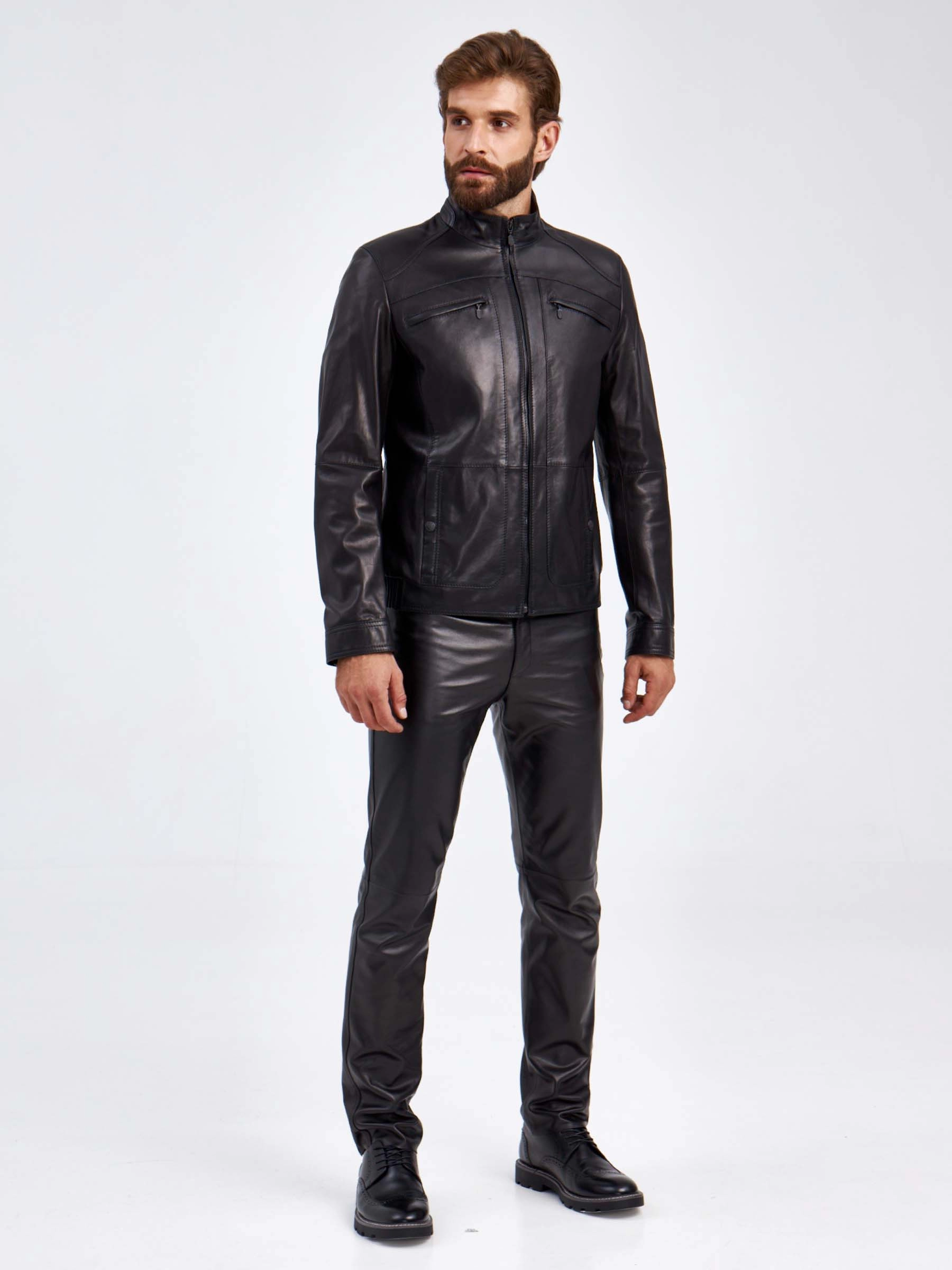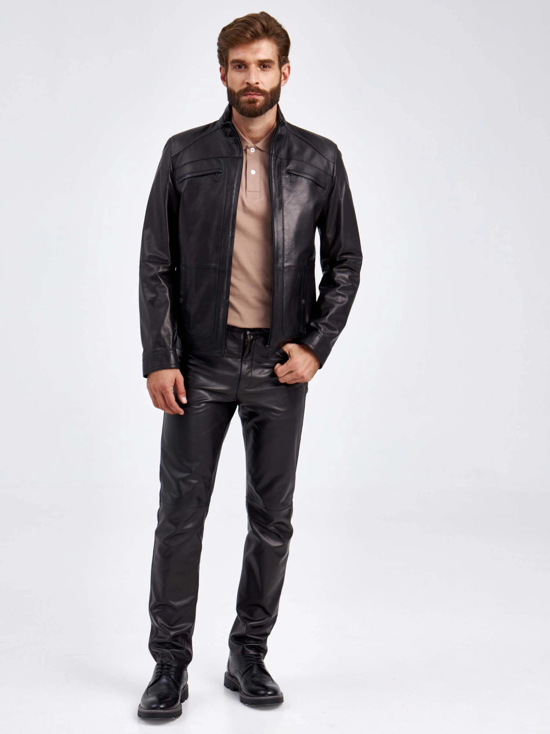 Мужская куртка в универсальном черном цвете. Кожа премиального качества. Воротник-стойка. Застёжка-молния. Рукав втачной. Нагрудные и боковые карманы на молниях. Предусмотрены удобные внутренние карманы для документов. Безупречная работа наших портных. Обеспечена идеальная посадка по фигуре и прекрасная свобода движений.