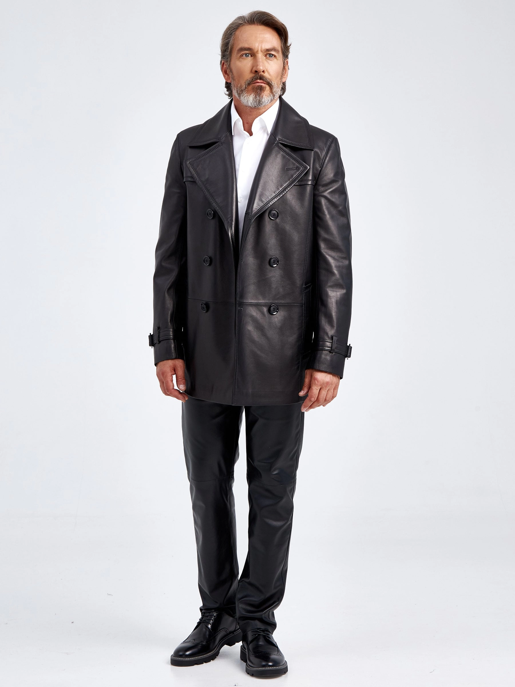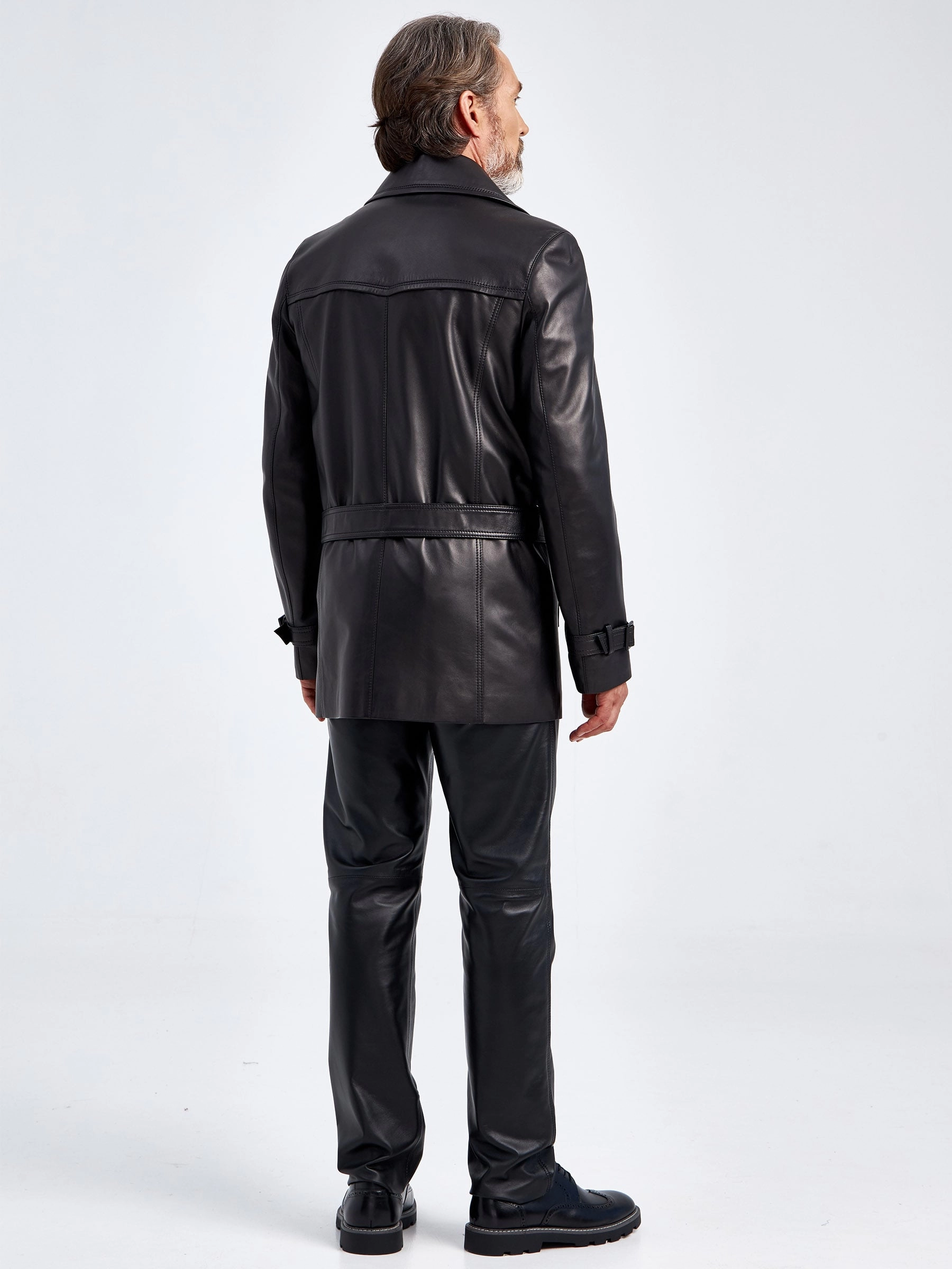 Товар двубортный мужской кожаный тренч на поясе 525, черный, размер 50, артикул 29060 выполнен из натуральной кожи с застежкой пуговицы. Рассчитан на сезон: демисезон. Длина изделия 81 см, силуэт прямой.