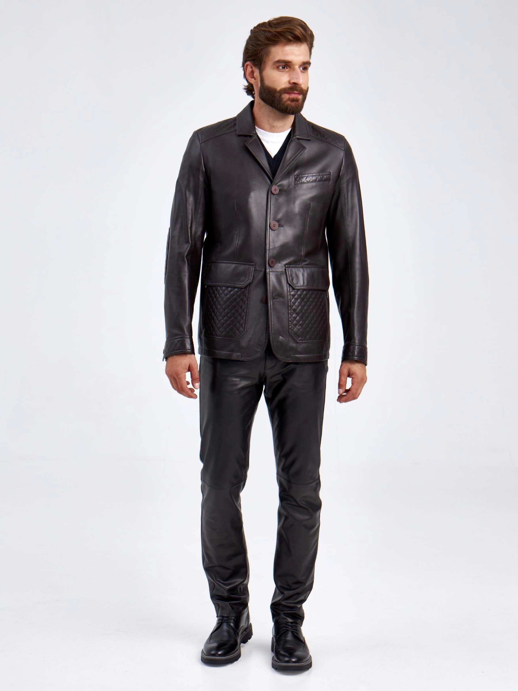Классический кожаный пиджак не теряет своей популярности. Он прекрасно сочетается не только с брюками, но и с любыми джинсами. Профессиональный крой, идеальная посадка по фигуре. Приталенный силуэт. Застежка пуговицы. Элегантности к модели добавляют крупные накладные карманы со стеганным рисунком.